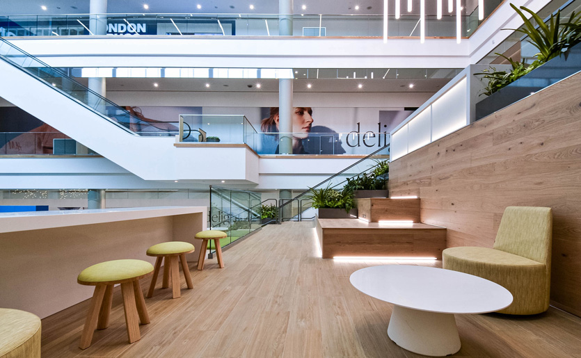 Regarded as the premier fashion hub of South Edmonton, Southgate Centre brings an unmatched level of sophistication to the area’s upscale retail experience. To update the space, 505Design Inc. led the redevelopment of a former Sears department store, revitalizing this former big-box area into a vibrant, modern gathering hub for retailers and customers alike. Featuring three levels of retail space, the new North Wing is anchored by an open-concept 70’ atrium with a stadium-style seating terrace. Here, the firm selected honey-toned, wood-look tiles by Ceramiche Refin, complemented by natural lighting and vibrant greenery, to create a warm, inviting space for guests to recharge, work, and socialize.