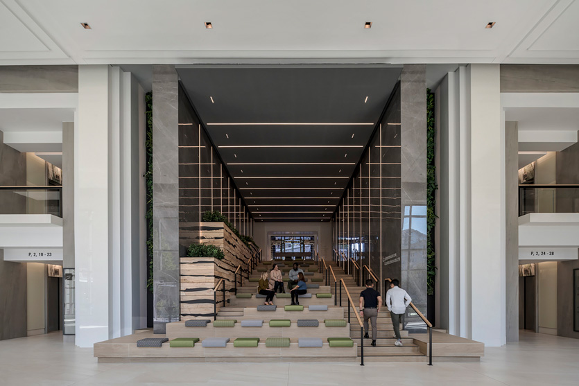 Located in the epicenter of Midtown Atlanta, Promenade Tower is a 775,000-square-foot office building uniquely positioned close to key attractions like the Woodruff Arts Center. Tasked with creating a transformative design to revitalize and attract tenants to the iconic tower, TVS utilized an extraordinary palette of gauged porcelain tile panels to dramatically convert the entire ground floor into a grand social gathering area. Equipped with stadium seating and pockets of elevated lounge areas, the firm selected wood-look tiles from Provenza’s Rovere Puro collection, coupled with flooring from Imola’s Limestone series, which spills seamlessly into the elevator banks. Throughout the building, upscale tenant restrooms feature showstopping selections from Ceramiche Piemme and Provenza, contributing to the space’s overall refined, luxurious aesthetic.