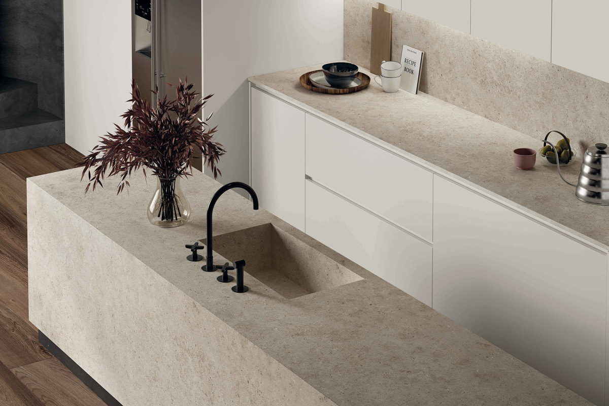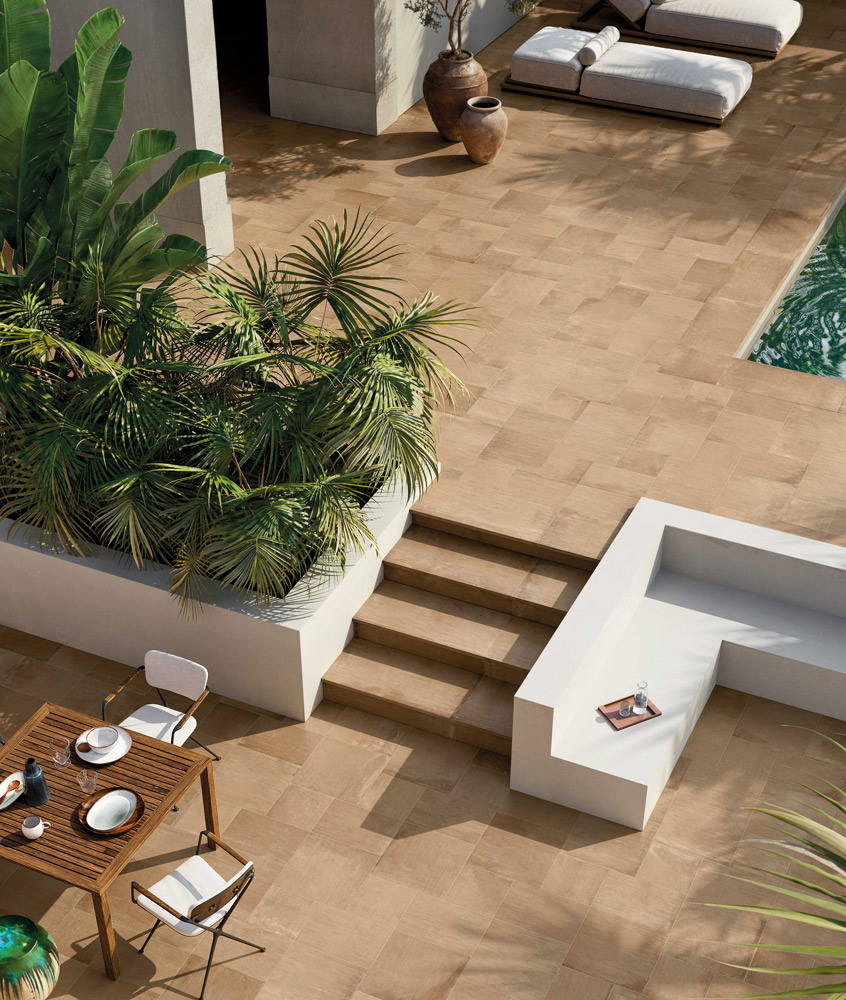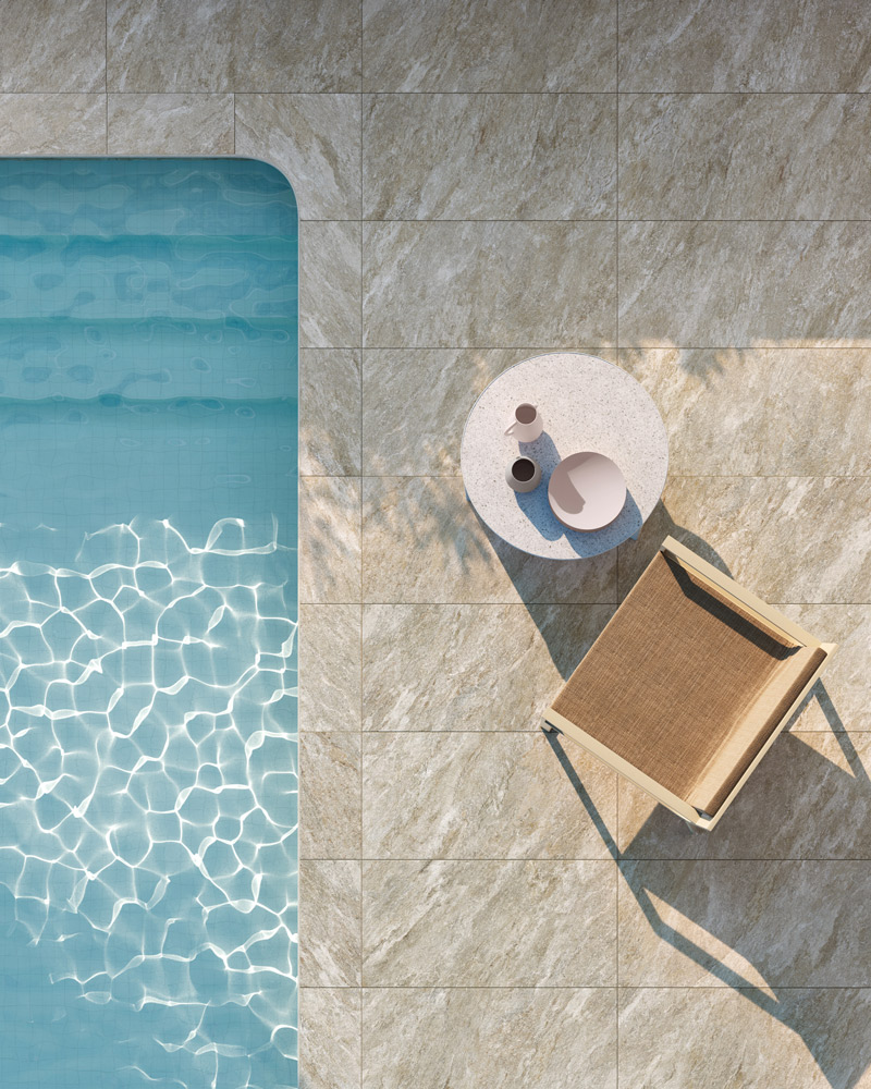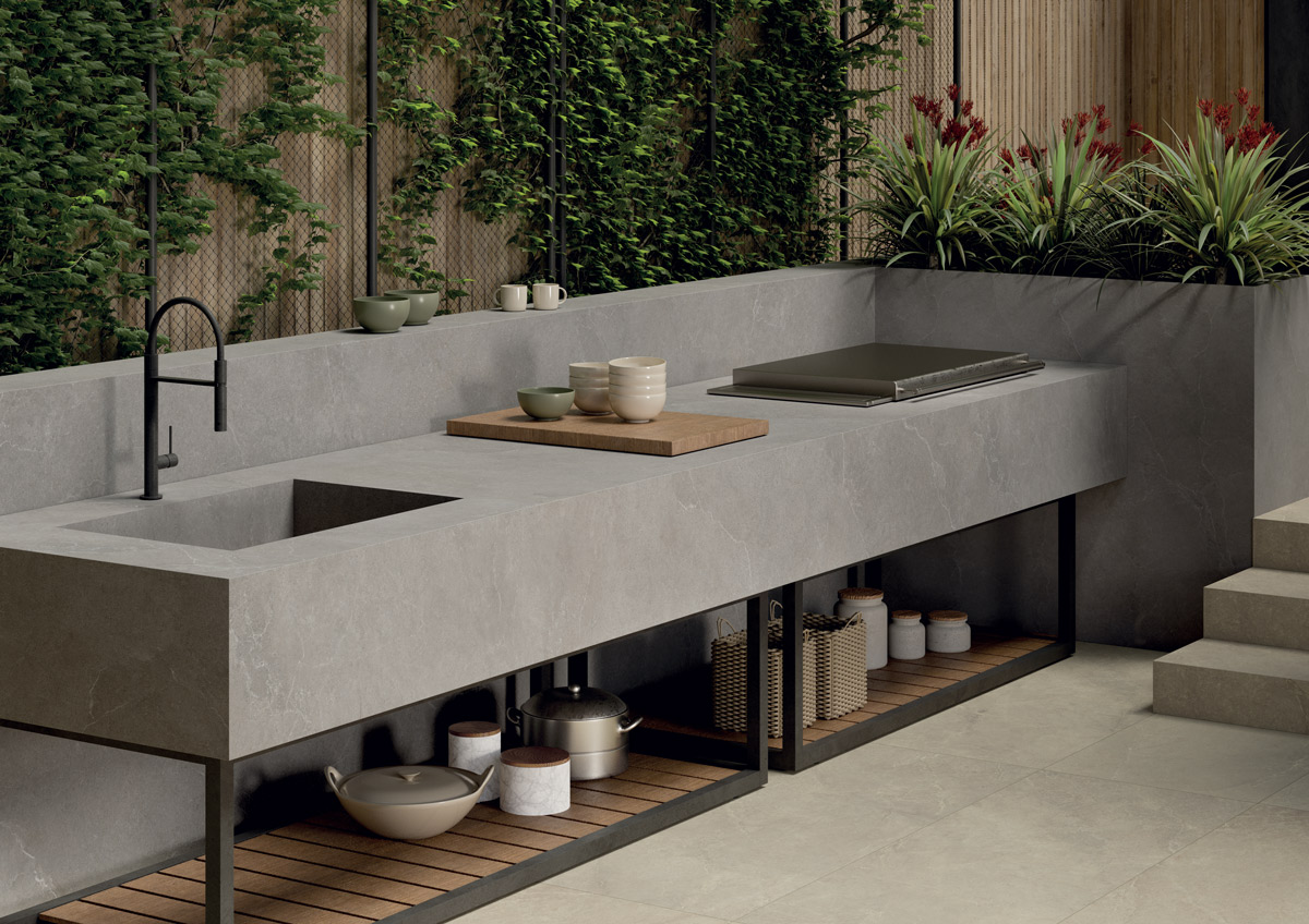 Thanks to the incredible, high-performance qualities of ceramic and porcelain tile – such as extreme durability, stain- and scratch-resistance and a 50+ year lifespan – the material’s installation potential is continuing to evolve well beyond traditional floor and wall surfacing applications, allowing endless prefabricated possibilities throughout interior spaces, especially in the kitchen and bath. Large slabs – ranging from 12 to 20mm – are becoming a popular surfacing option on kitchen counters and table tops in lieu of stone, while in the bath, various Italian manufacturers have begun producing their own lines of bathroom furnishings, which include wall-mounted ceramic washbasins, drawer-vanities, and sinks. Additionally, ceramic tile continues to expand to the outdoors, from the most complex surfaces – like those used for ventilated facades and pool coping materials – to pavers for indoor-outdoor terraces and patios.