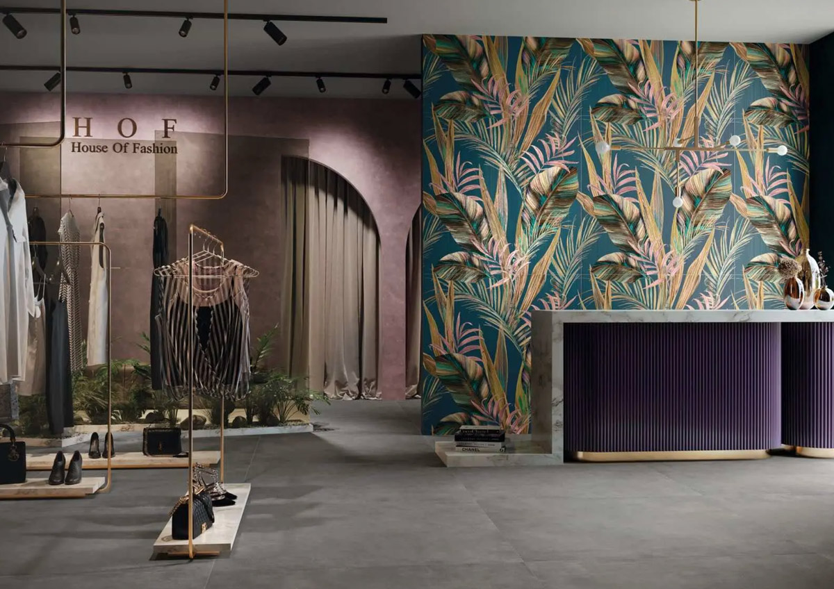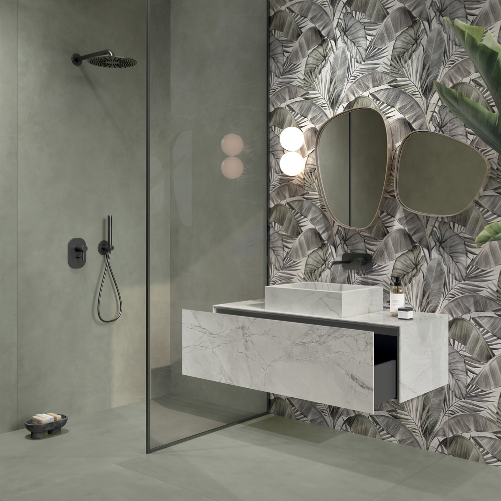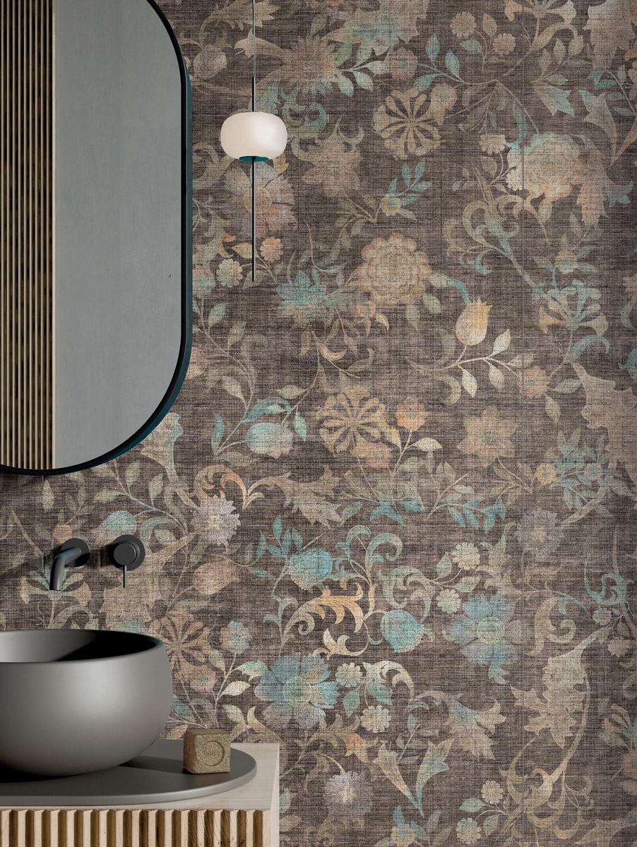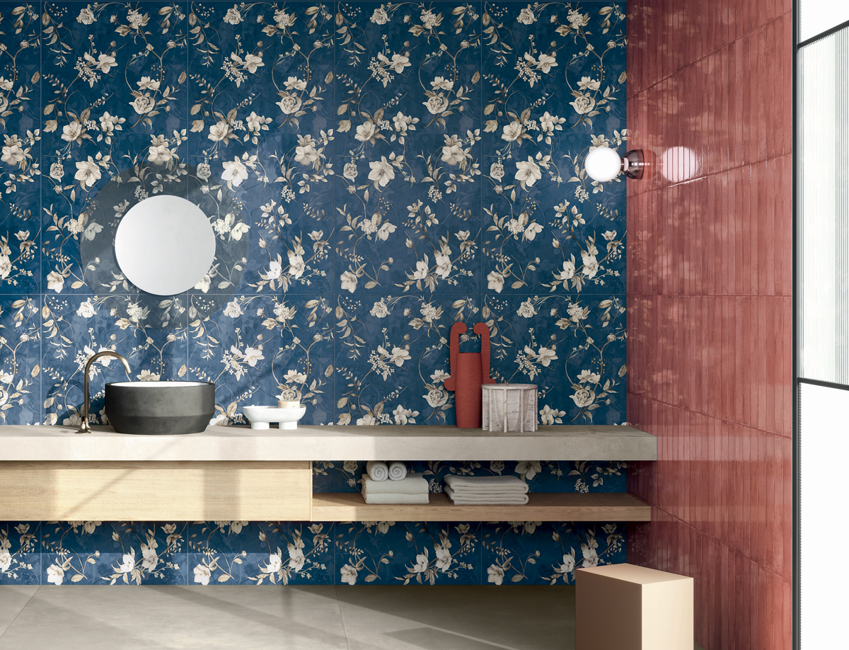 Color alters the mood of every environment, and this year, Italian manufacturers embraced a rainbow of colors that play with the chromatic nuances of ceramic. Green continued to dominate color palettes, with forest, mint, and sage hues used in a range of stone, onyx, cement, and brick varieties alongside leaf and botanical wallpaper looks. A variety of collections also showcase Tuscan-inspired cotto-effects, rich in details and shading, to exude the deep tones of terracotta. On the lighter side, pastels from light yellow, sky blue, and powder pinks were seen in soft cement to 3D small formats which, combined with the different glossy and matte finishes, create fun, memorable surfaces. Additionally, multicolored marble- and onyx-looks in purple, indigo and emerald-colored veins showcased an innovative display of color reminiscent of galaxies.