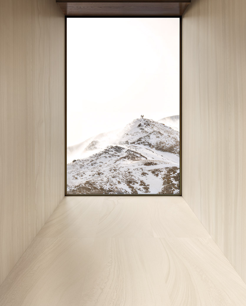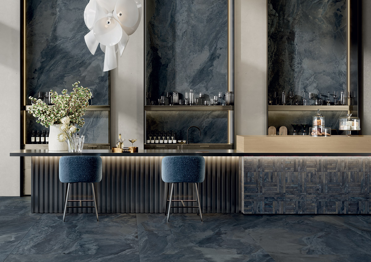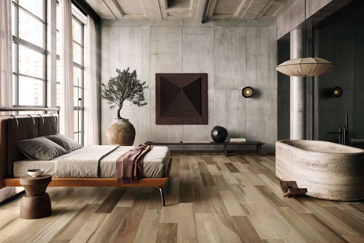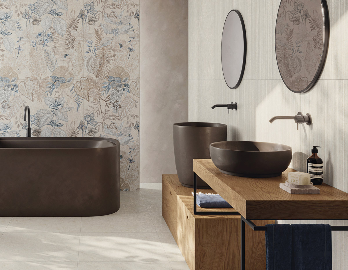 Nature has always been a key inspiration in design, and Italian manufacturers are continuing to innovate in graphic printing and finishing techniques to artfully reproduce the nuanced look and feel of natural materials in a hyper-realistic way. Marble and stone varieties feature a worn tactile, highly-variegated surface effect with typical irregularities, depicting ceppo di gre stone, sedimentary rock, cement, and slate with an almost crumbling surface appearance. Through-body veining techniques are allowing graphics and texture to expand to the edge and throughout the thickness of the tile. Additionally, innovations in wood continued to be predominant this year, with manufacturers drawing inspiration from oak, larch, walnut and elm for their new collections. A variety of classic plank and decorative parquet and chevron patterns, suitable for a total room look on floors and walls, feature deep grooves, highly textured surfaces, authentic knots and natural veins to rival the look of the real material.