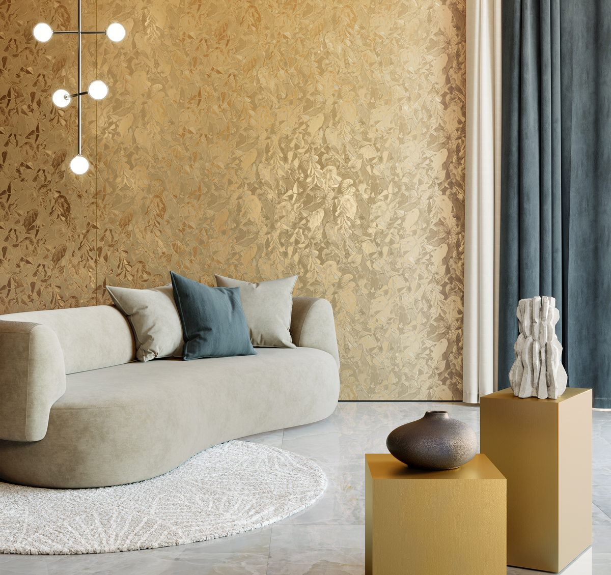 As a storied material, tile has long been synonymous with sophistication and elegance. This year, manufacturers continued to push the boundaries of grandeur, showcasing exaggerated veining in vertical, diagonal, horizontal, and bookmatched patterns to bring an essence of bold luxury into a space. Various new collections showcase classic, highly-coveted stone and marble varieties that are intentionally paired with neutral colors like mother-of-pearl, talc, and chalk to create interesting plays on light and add brightness, while featuring intriguing, soft-to-the-touch matte and glossy finishes. Further, exotic and semi-precious gemstones are shown with a captivating combination of greys, golden yellows, rust, green, purple, and burnt browns with strong, detailed veining throughout. Several manufacturers are even going so far as to weave gold elements into the tiles themselves, from subtle detailing to the large-scale, grand incorporations. Additionally, ceramic takes on wallpaper were highly prevalent at this year’s show, showcasing patterns from romantic florals and gold leaf prints to dazzling jungle motifs.