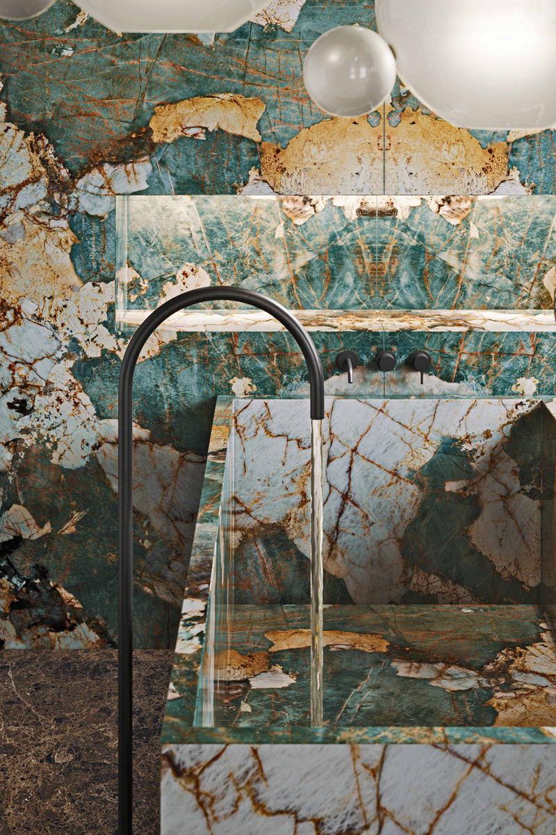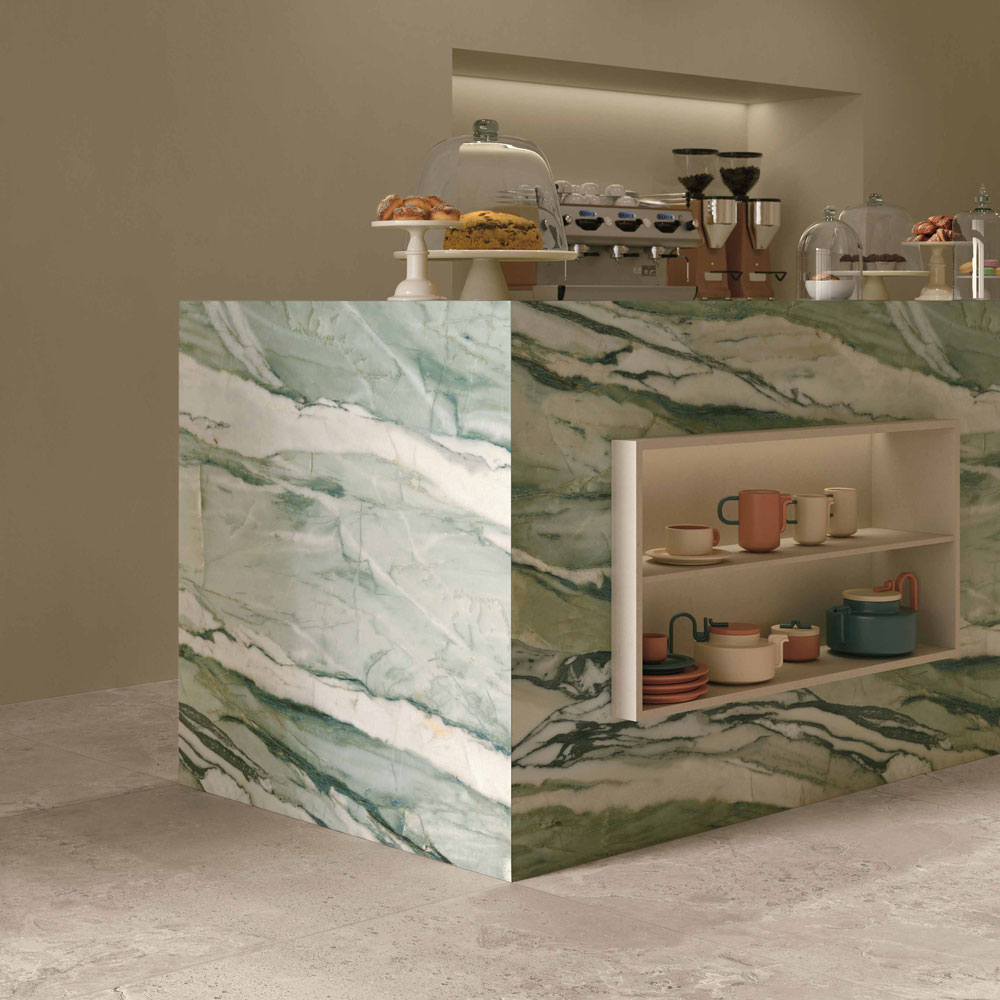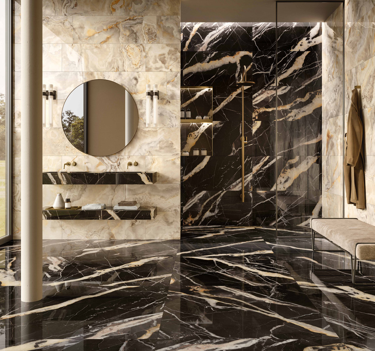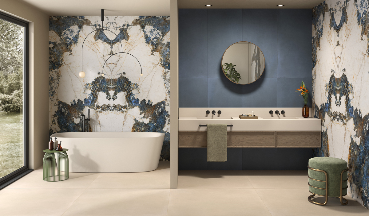 (June 2024) | At the 2024 edition of Coverings in Atlanta, GA, Ceramics of Italy manufacturers showcased the ever-evolving advancements in ceramic and porcelain tile from an aesthetic and technological point of view. Pulling insight from the world of design, fashion and film, along with the trend scene on the show floor at Coverings, tile trend expert and artist Cristina Faedi breaks down this season’s top five styles and applications in Italian ceramics that push the material beyond appearance and beyond expectation. From earthy hues like nature-inspired greens and ocean blues to intricate, dimensional veining that mimics onyx and marble, manufacturers played with color, texture and technology to create expressive forms, sophisticated patterns and a myriad of decorative design solutions.