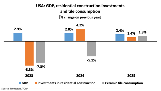 The outlook for US consumption is closely tied to trends in the construction sector, which is primarily influenced by interest rate fluctuations. According to forecasts from Prometeia, ceramic tile demand is projected to increase by around 1.8% in 2025, bringing total consumption back above the 255 million square metre mark.