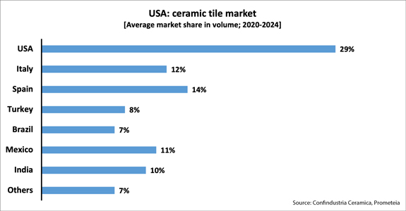 According to figures provided by the Tile Council of North America, US ceramic tile consumption reached 250.9 million square metres in 2024, down 5.1% compared to 2023. Domestic sales fell by around 9%, while total imports dropped by 3.5%. Italian producers, however, saw a recovery in sales to the US compared to 2023 in contrast to all other major exporters, whose sales continued to decline.