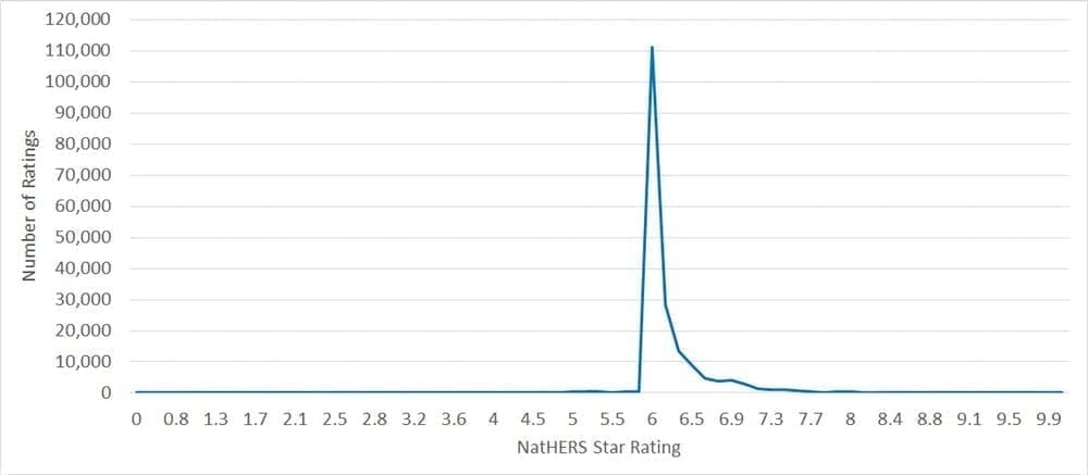 Further research by Trivess Moore, (RMIT University), Michael Ambrose (CSIRO) and Stephen Berry (University of South Australia)[2] has found that only 4 out of 5 homes exceed the minimum standard set by NatHERS. Despite actions aimed at raising the minimum level, it appears that the stakeholders have been reluctant to do so, confident that market forces would fuel demand for green solutions. The standard was set at 6 almost eight years ago but the push from the market has never occurred, as a result of which only 1.5% of the homes taken into consideration exceed the minimum level. Consultation of NatHERS data for homes built in Australia between May 2016 and December 2018 has shown that out of the 187,320 homes considered, more than three-quarters of them gravitate around the minimum standard. (Fig.2)