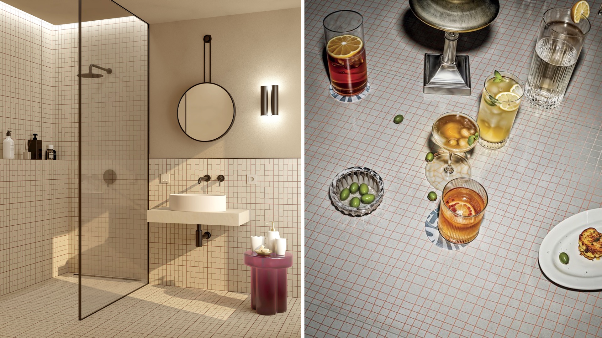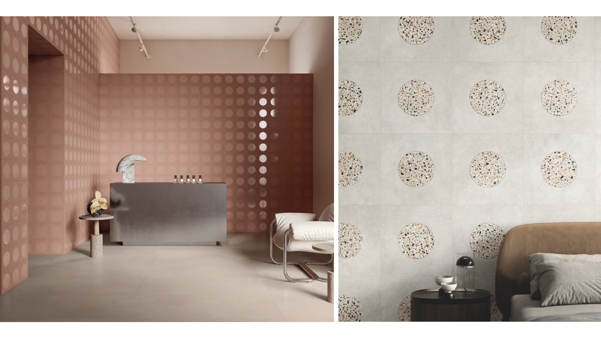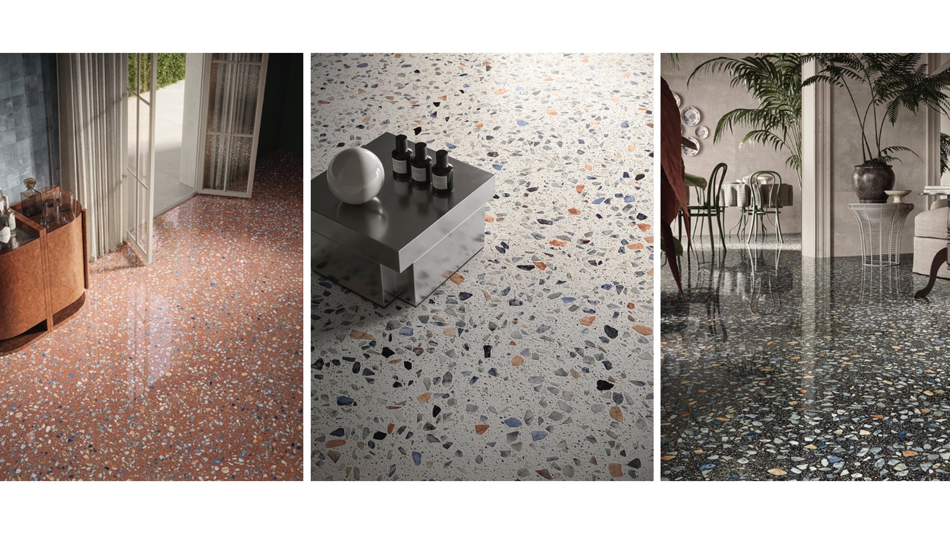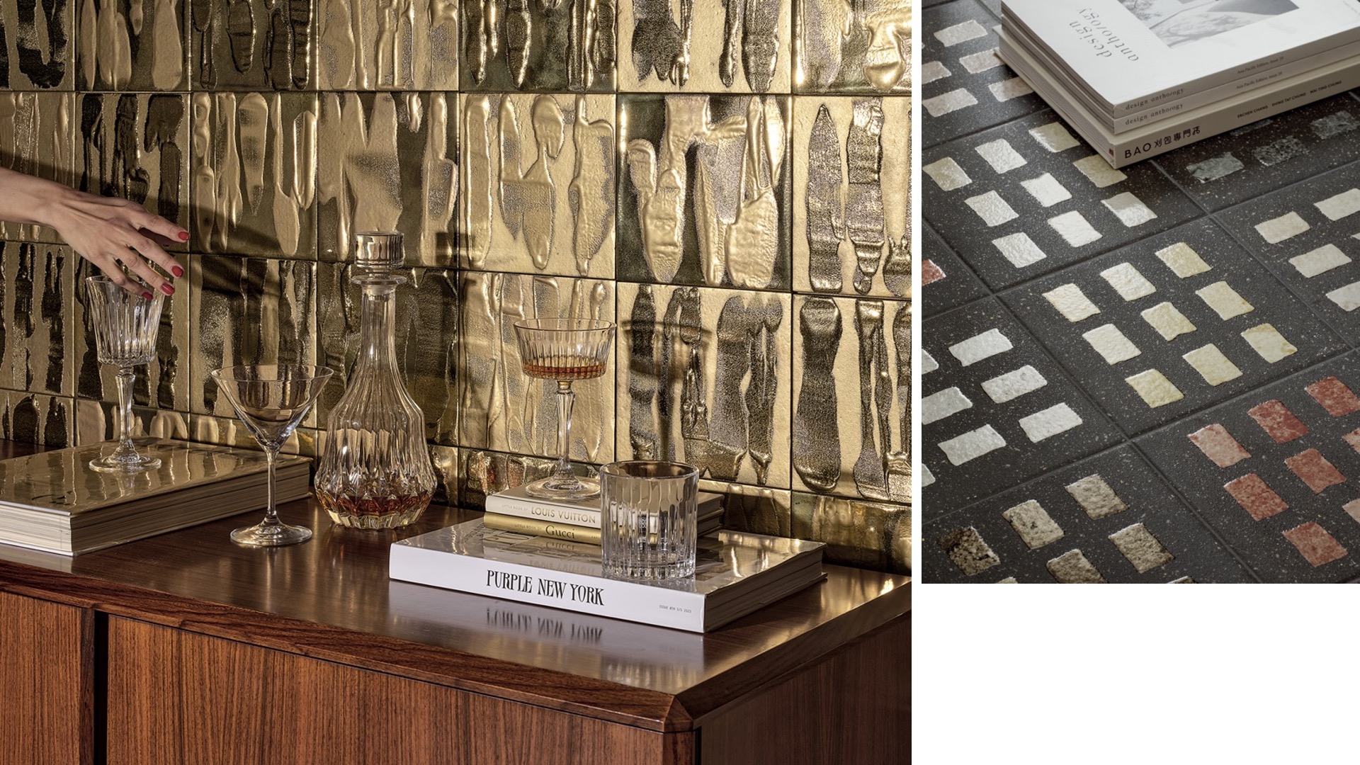 Contemporary reinterpretations of ceramic terrazzo stand out for their interplay of colour, pattern and texture, with raised inclusions and stone fragments that enhance their material presence. Ancient mosaics provide further inspiration, bringing a sense of rhythm and light to surfaces, while vivid dopamine colours emerge in craquelé-glazed details that shimmer with vitality.