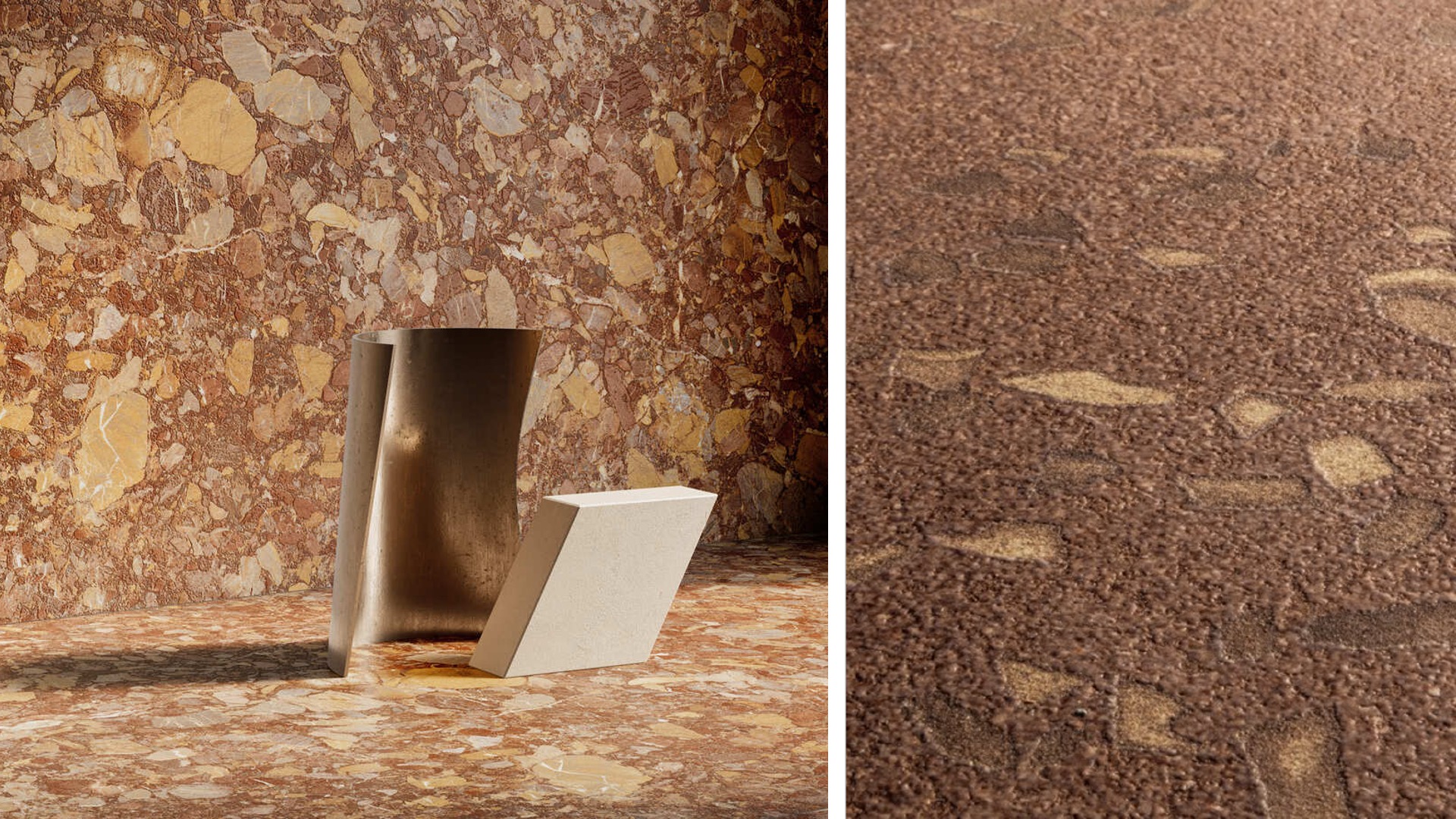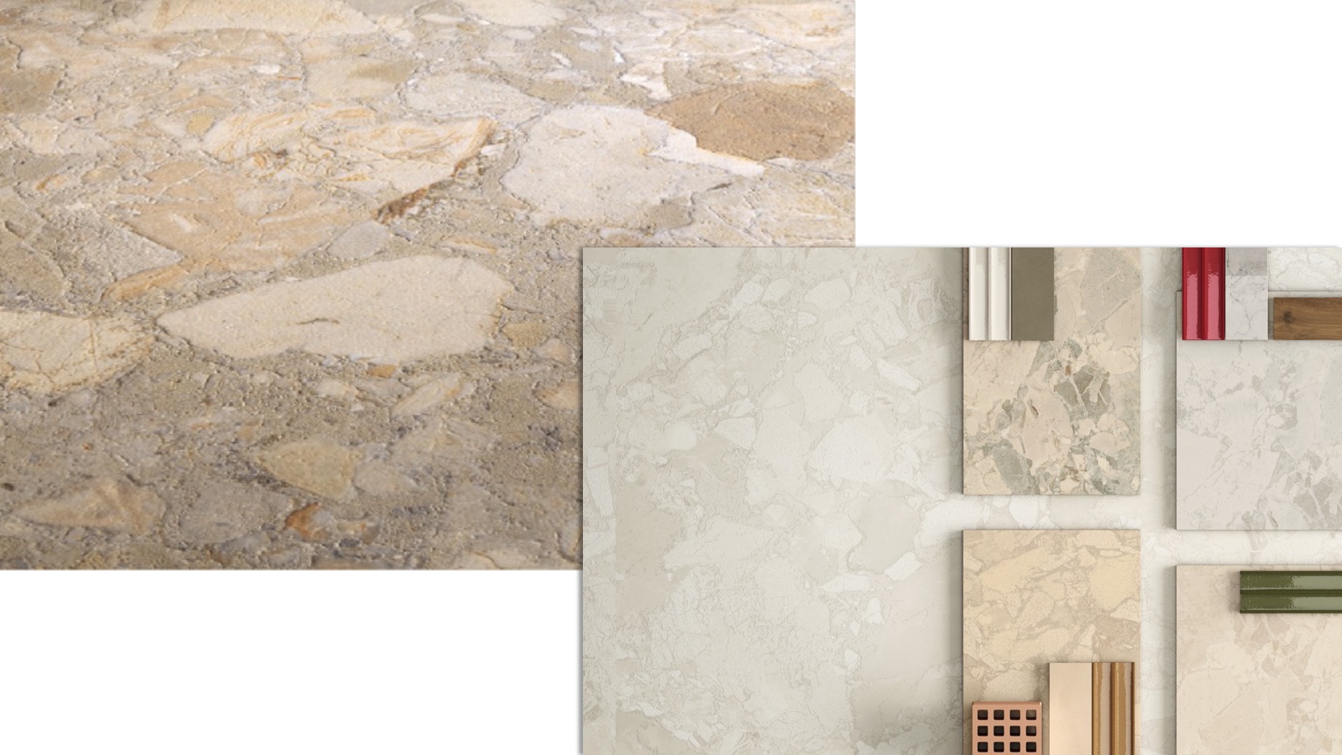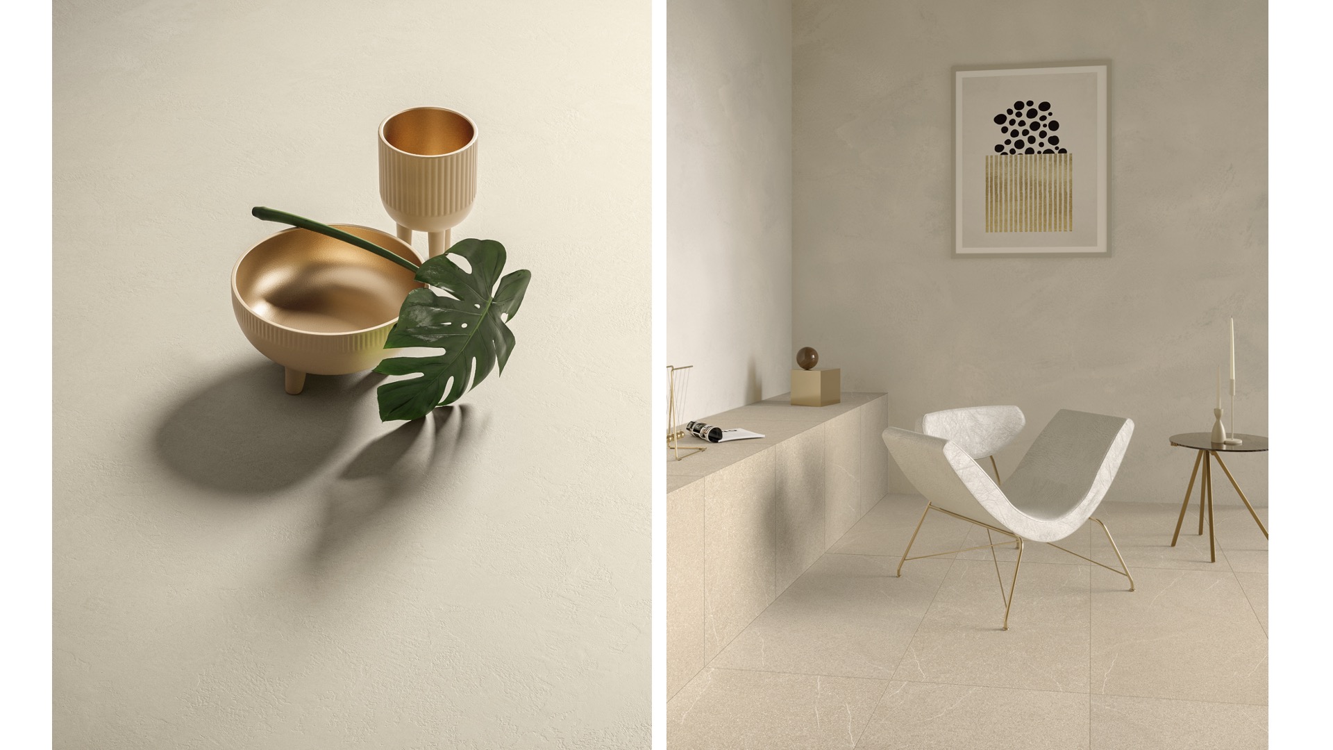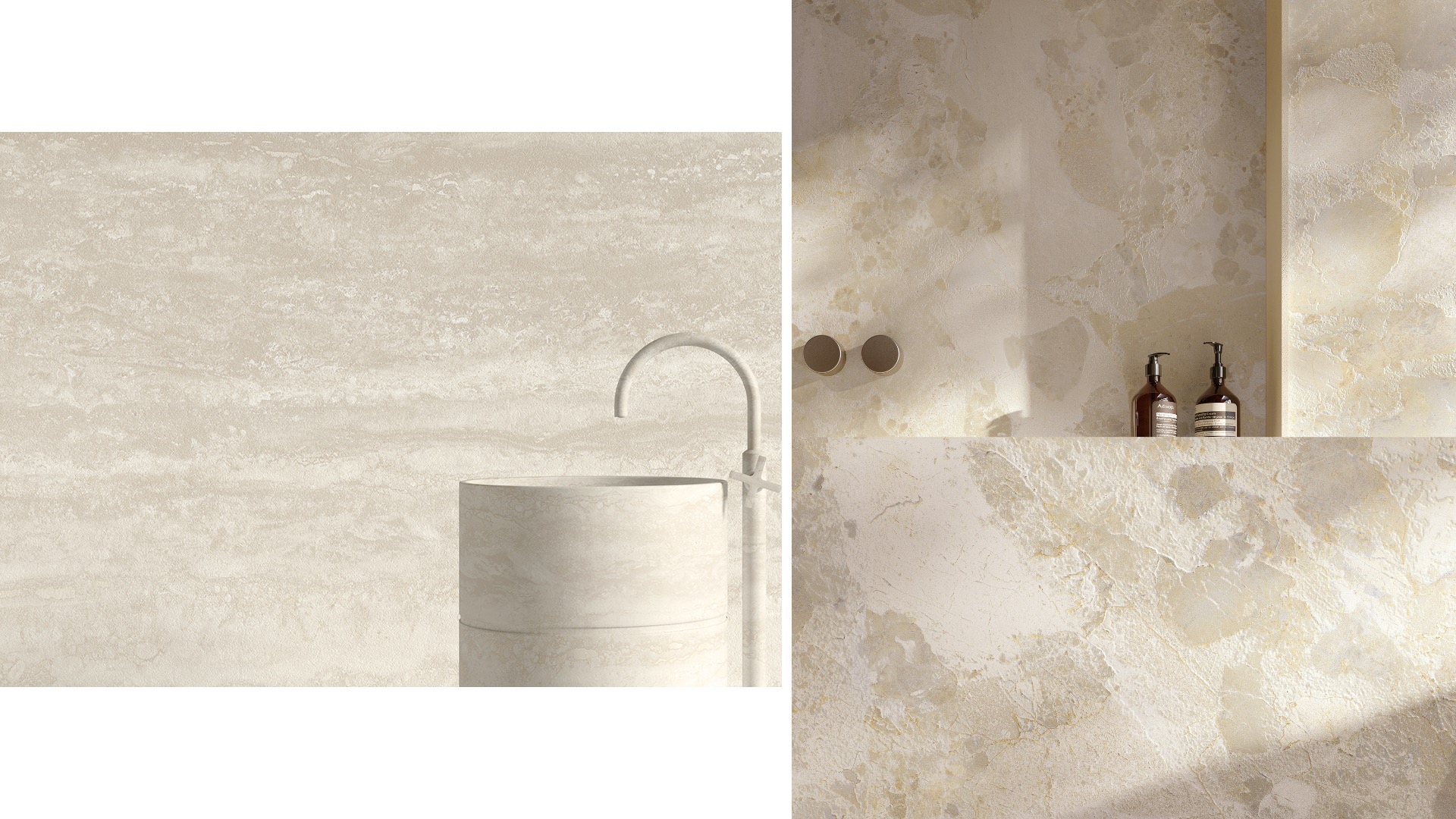 Here too, the colours are soft, luminous and natural, with warm beige tones, crystalline patterns and slate striations that give the surfaces a vibrant, hyper-real look.