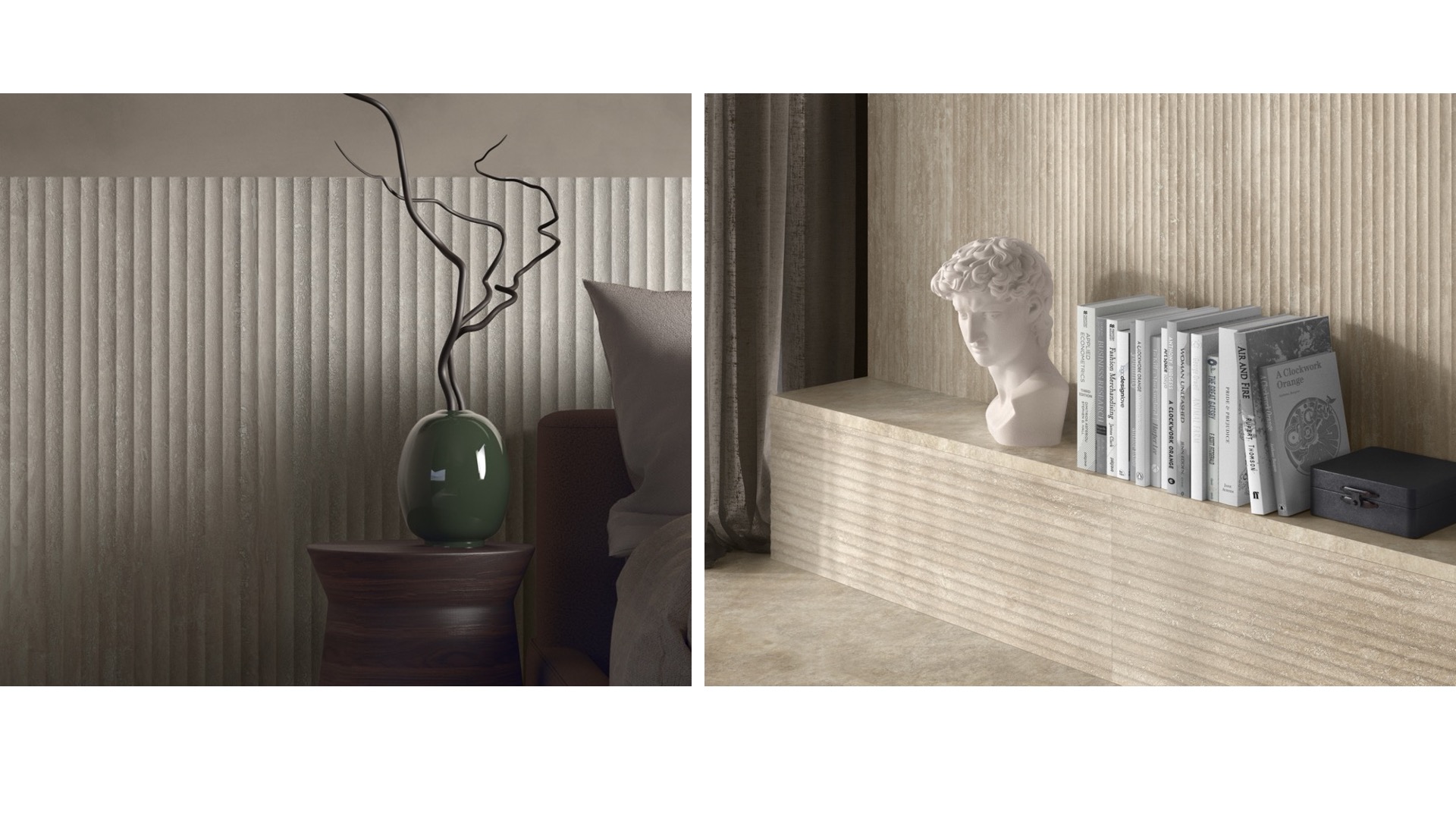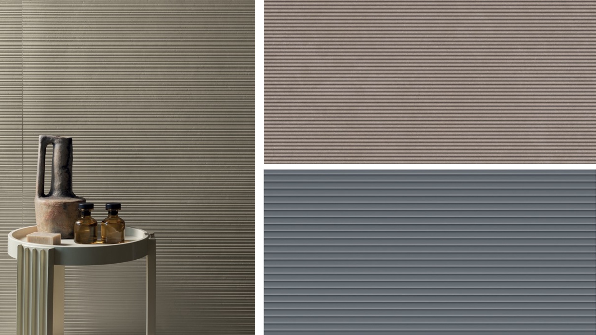 These striations – whether regular or irregular, fine or broad, high or low relief – lend character to walls and introduce visual contrasts and effects that break away from the rigidity of traditional grid-based layouts.