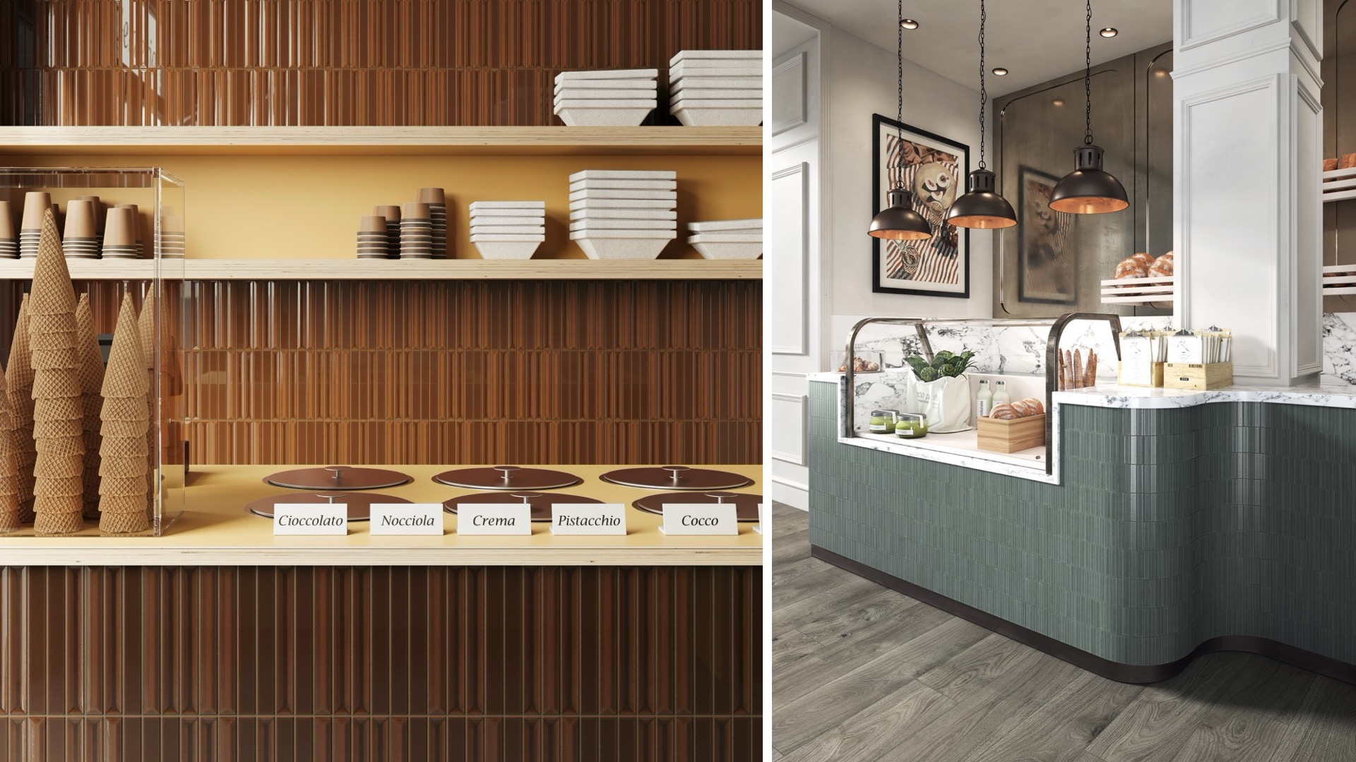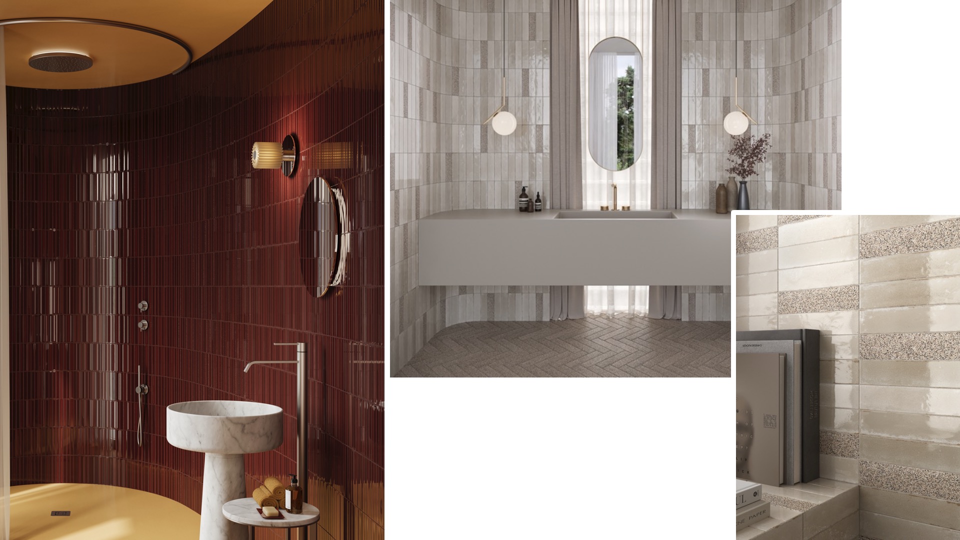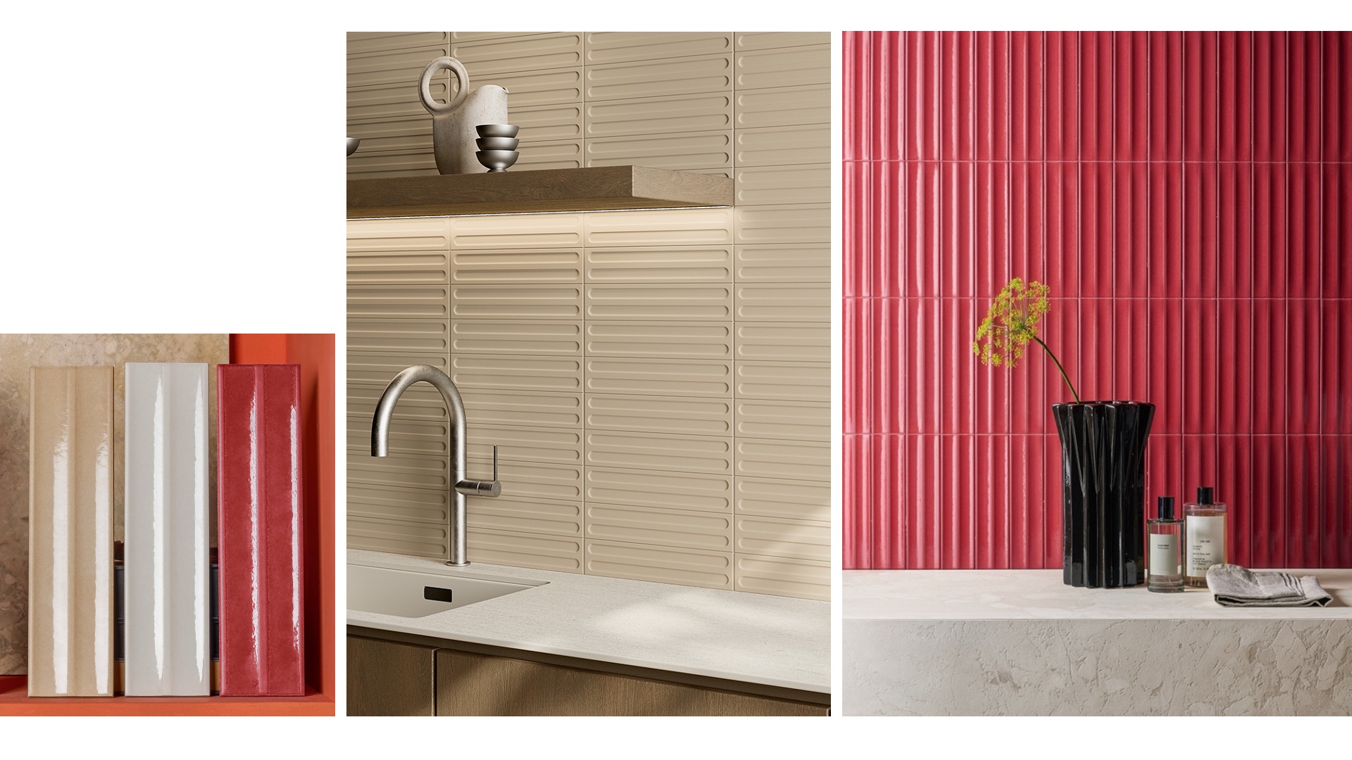 Formats range from large planks to slim “kit-kat” or “mini-stick” tiles, as well as elegant fluted modules. This variety opens up new creative potential, allowing curved surfaces to be tiled safely while offering maximum freedom of composition.