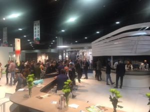 Strada Dinamica, the Ceramics of Italy booth located in Hall B3, 1630, is modeled after a busy urban sidewalk and includes benches, standing communal tables and two large kiosks, which house a cafe, coffee bar and information desk. Designed by New York firm e+i studio, the swooping, wave-like motions and organic curvature throughout the space create an inviting, modernist aesthetic reminiscent of Italian futurism. Several member companies contributed products to bring the Italian streetscape to life including Florim, whose Magnum Oversize collection demonstrates the versatility of thin porcelain slabs, and Lea Ceramiche whose large format floor tiles are set on a raised flooring system by Newfloor Srl Raised Floors. Fila Surface Care Solutions also provided cleaning products for the booth. Conveying a sense of motion and natural flow, the booth welcomes visitors to step up and explore the space while learning more about the Italian tile industry. Ceramics of Italy’s beloved culinary partner, Spuntino Catering will continue serving a taste of la dolce vita in Strada Dinamica throughout the show.
