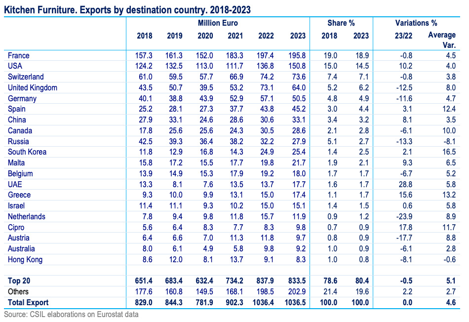 The openness to the international trade has evolved positively over the last years. The incidence of exports on production reached about 26% in 2023, while the weight of imports on consumption is worth about 20%. It should be pointed out, that about 80% of the exports remain inside the European perimeter, while the remaining 20% is destined overseas. Almost 40% of the overseas export goes to North America (upward trend), more of 30% to Asia and Pacific, 14% goes to Middle East area. Considering a mid-time perspective, exports of kitchen furniture in Europe was growing with an average of 5% since 2018.