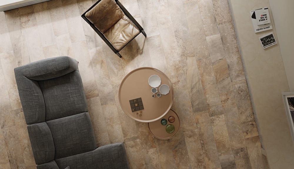 As for stylistic trends, the industrial look explores the world of recycled materials and combinations of stone and metal, incorporating these two natural elements into the ceramic surface and adopting an antiquing and scratching process to create a product that will lend distinctive aesthetic appeal to any space.