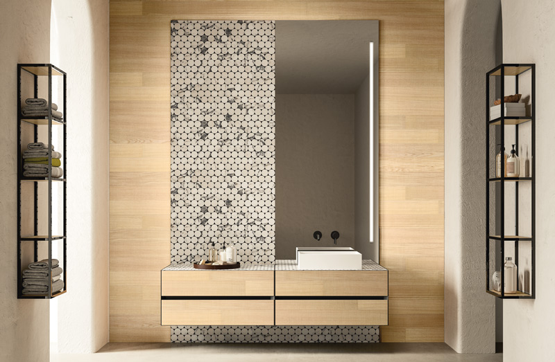 06. The Linea bathroom collection from Itlas combines the natural appeal of wood with other materials such as marble and resin. In this composition, the D10 Oak wood cabinet is accompanied by a wood wall (5 mm Rovere Collection) and the Dot Collection Pattern vanity top designed by Scholten & Baijings, with a Luce di Carrara marble washbasin. www.itlas.com