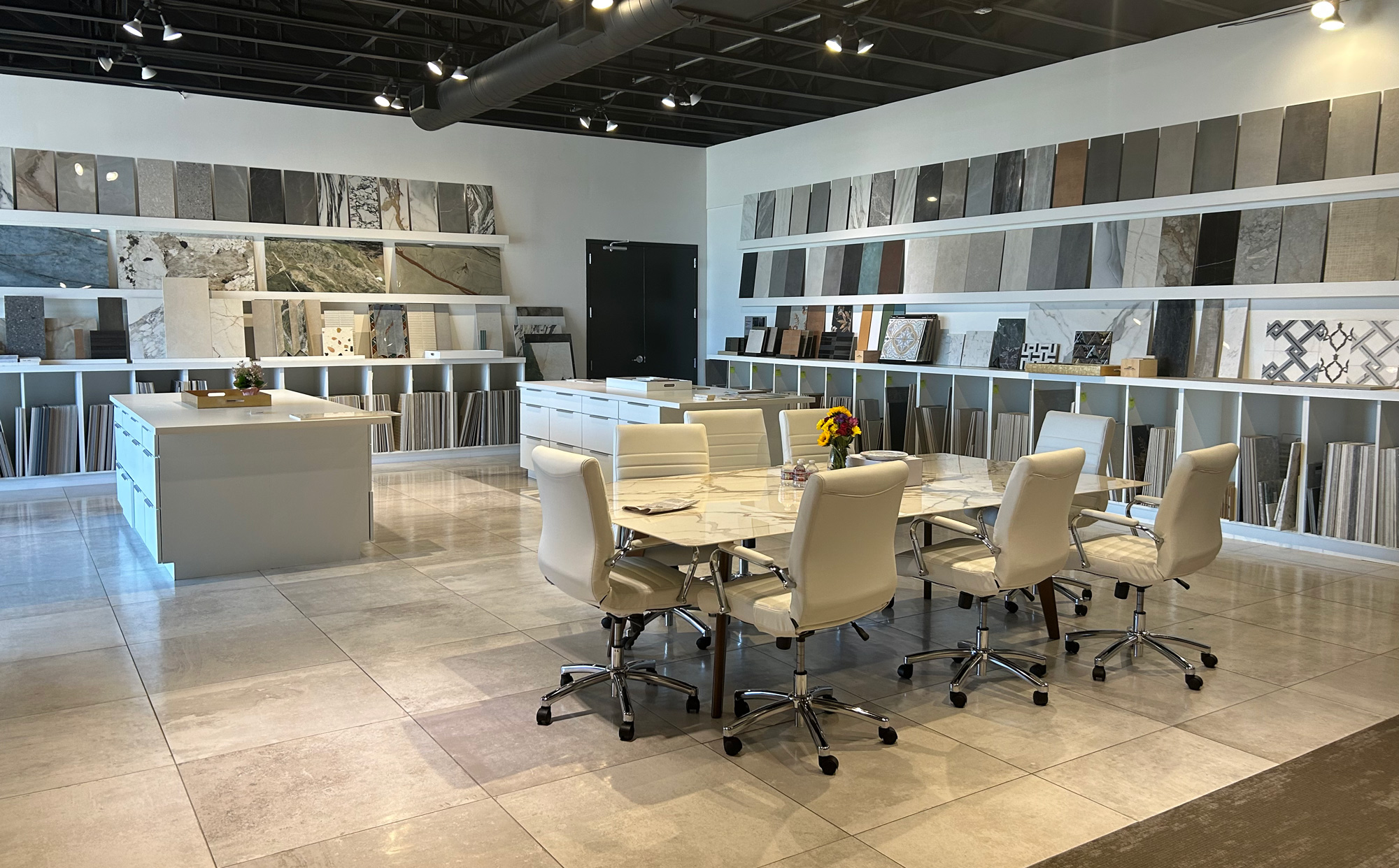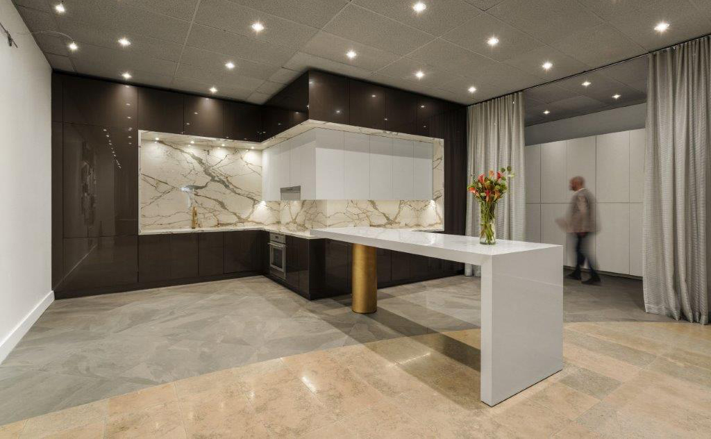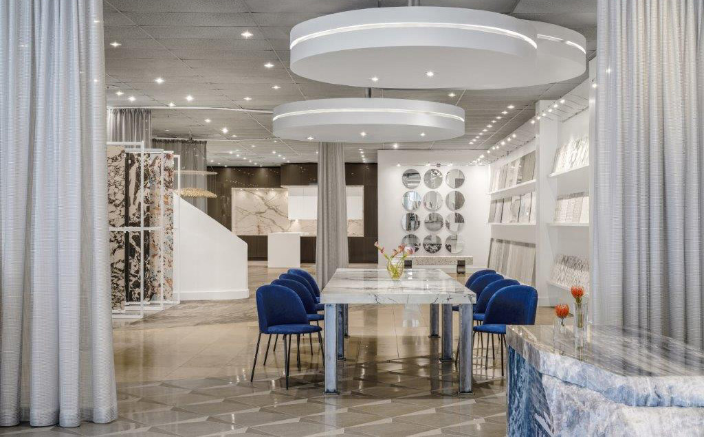 That’s right. An industrial showroom, which we opened in 2005 at our warehouse in Houston, shows porcelain indoors and outdoors and is complemented by our large selection of 6 mm and 12 mm porcelain slabs. Our award-winning studio in the Houston Design Center, opened in 2010 and remodelled in 2020, exemplifies the culture of our company. It is adorned with contemporary elements, the floor is covered with 4’x 8’ porcelain panels, a full display of porcelain slabs and tiles line the walls, and the exterior park-like setting has all colours and textures showing our 2 cm porcelain pavers. Our showroom in the Dallas Design District, opened in 2018, encourages designers and architects to create concept layouts and vignettes for entire projects, usually suited for hospitality, multifamily or restaurant projects.