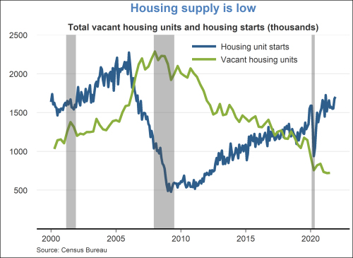 A chart published by the research department of the Federal Reserve Bank of San Francisco shows the increase in housing starts and the lower availability of housing stock for sale. Housing starts have recovered from a low level of about 500.000 units in the year 2009, at the bottom of the recession. It is not reasonable to forecast an increase to the record levels, over 2 million units, that preceded the recession, which were generated by an excessive amount of liquidity in the financial markets and by speculative investments.