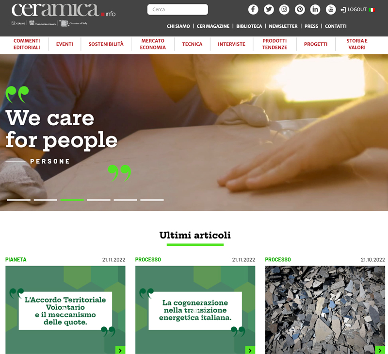 The Italian ceramic industry portal www.ceramica.info serves as a kind of digital toolbox for all these messages and content and is a communication tool in its own right. Available in a choice of five languages, the thematic area devoted to sustainability has become an extensive landing page where all the information is organised according to the “five Ps”: Process, People, Products, Projects and Planet. Articles, images, infographics, video footage and product and project galleries are all used to illustrate the sustainability of the Italian ceramic industry, while news items describe specific actions that have been taken by individual companies and the levels of performance they have achieved. This is accompanied by a series of video tutorials aimed at architects, distributors and installers that explain the basic aspects of creating an environment- and people-friendly industry.