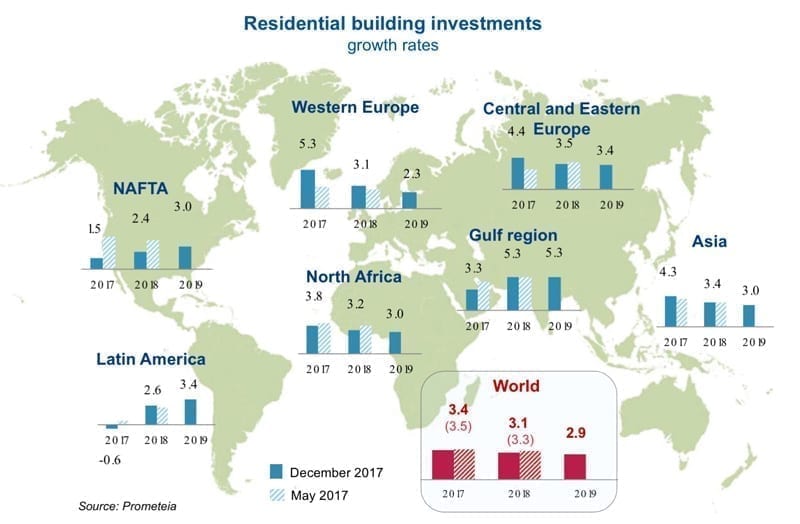 The final months of 2017 brought no changes in the main world markets or macroeconomic drivers capable of significantly altering these scenarios. In the forecasts published in the December 2017 report, it was only when the forecast horizon was extended to 2019 that any risk was observed of the world residential building growth rate (and consequently growth in ceramic tile demand) falling below 3%.