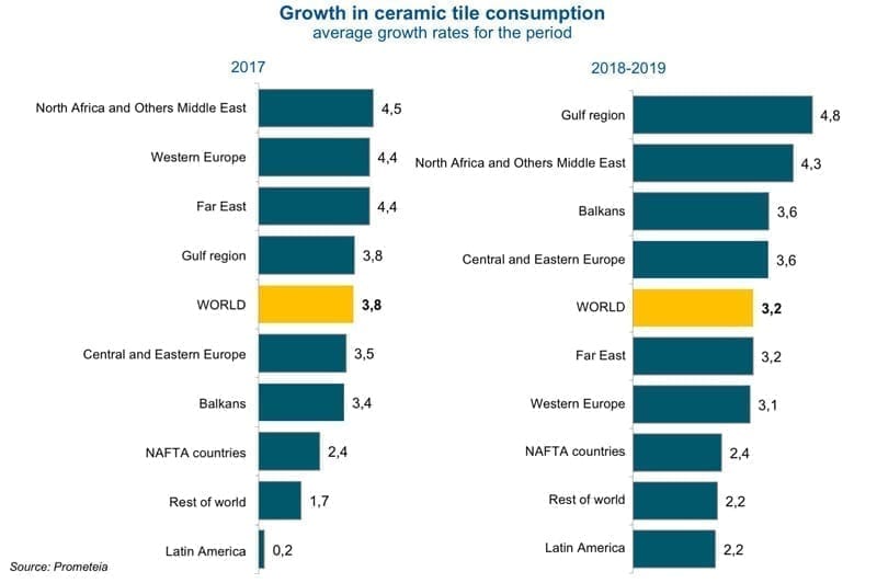 The Confindustria Ceramica-Prometeia forecasting report for November/December 2017 paints an encouraging overall picture for the world building industry. Despite a slight slowdown compared to the above 4% growth recorded in 2016, global investments in residential building are expected to remain buoyant over the two-year period 2017-2018 with a CAGR of around 3.5%, largely driven by Asia, NAFTA and the MENA (Middle East and North Africa) region. This makes for an equally positive outlook for world ceramic tile demand, with global consumption expected to grow at an annual rate higher than 4%.