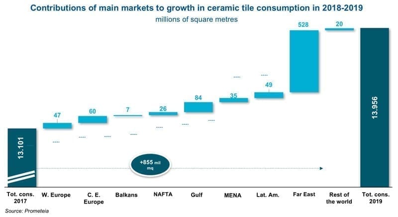 Barring significant unexpected changes in the strategies of the leading world ceramic tile suppliers, 72% of this marginal demand will be met by manufacturers located in the same areas as consumption. The remaining 28% (around 240 million square metres) will drive an international import/export market that is expected to reach almost 3 billion square metres by the end of 2019.