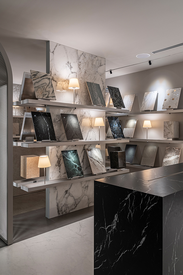 A succession of themed rooms emphasises the exquisite beauty of the materials: from the large slabs hung like rich Persian carpets to the museum-like shelves which exhibit smaller size tiles that exemplify an endless collection of finishes, structures, surfaces and colours, each presented as a unique, unrepeatable object of great value.