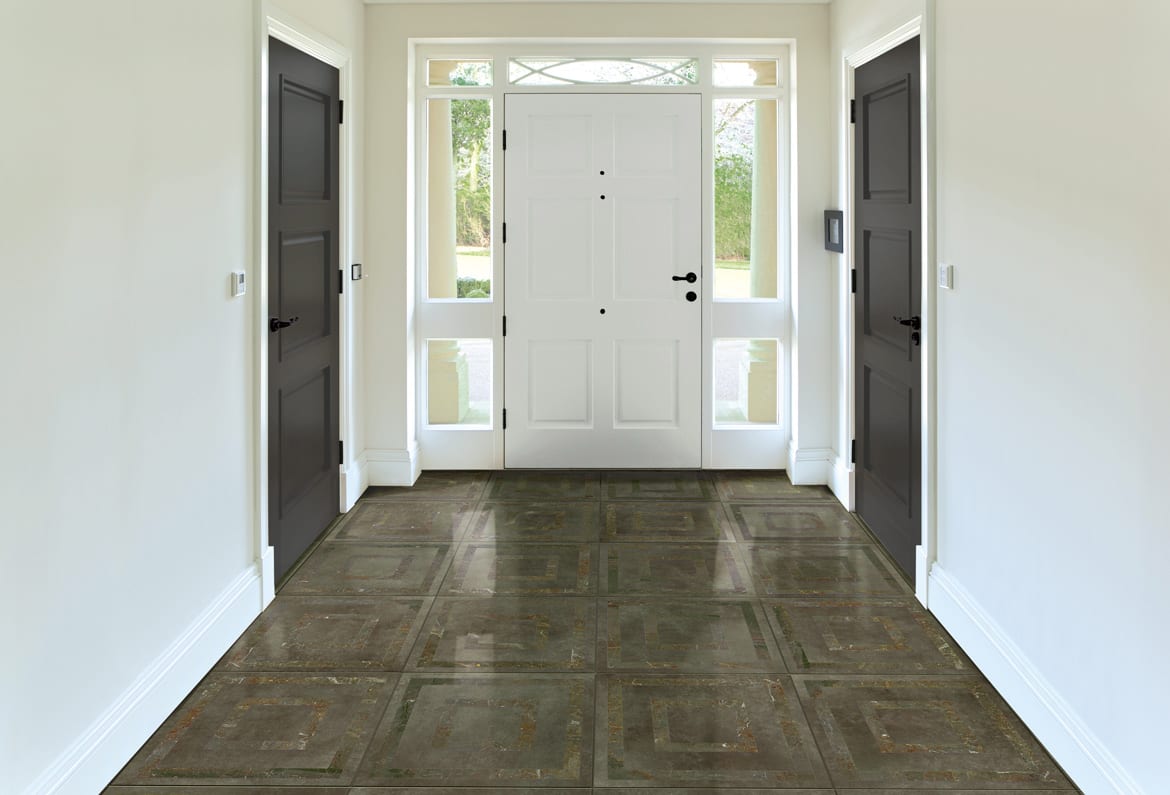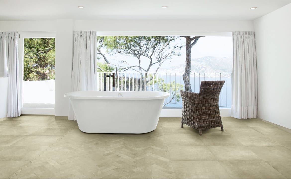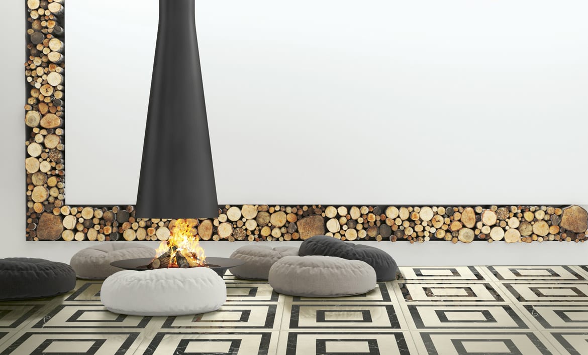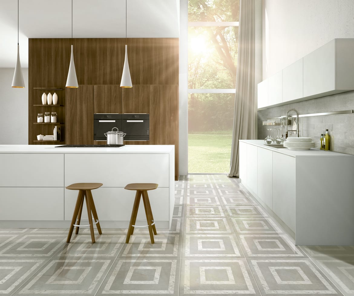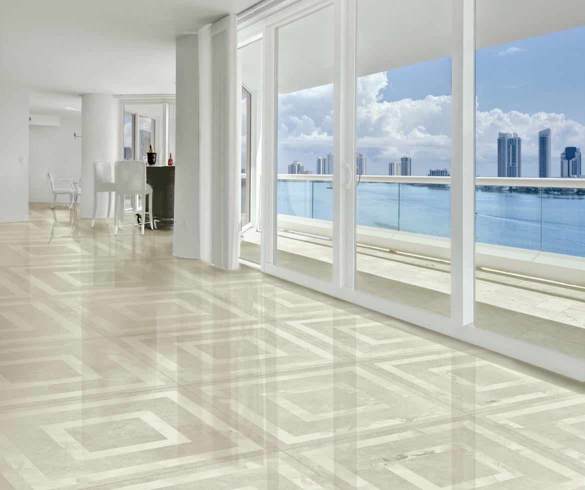Concrete, marble, and polished tile are among the most popular looks in floor tiles today especially in large sizes. This new series, which is being launched now, includes a very soft concrete look in four neutral colors both in a matt AND fully polished finish. We also created a sophisticated geometric pattern using a marble inlay in the concrete, and this is sold as a field tile by the square meter. Tile sizes include 100×100 cm (40″x40″), 60×60 cm (24″x24″), and 30×60 cm (12″x24″) plus smaller cut sizes and mosaics.