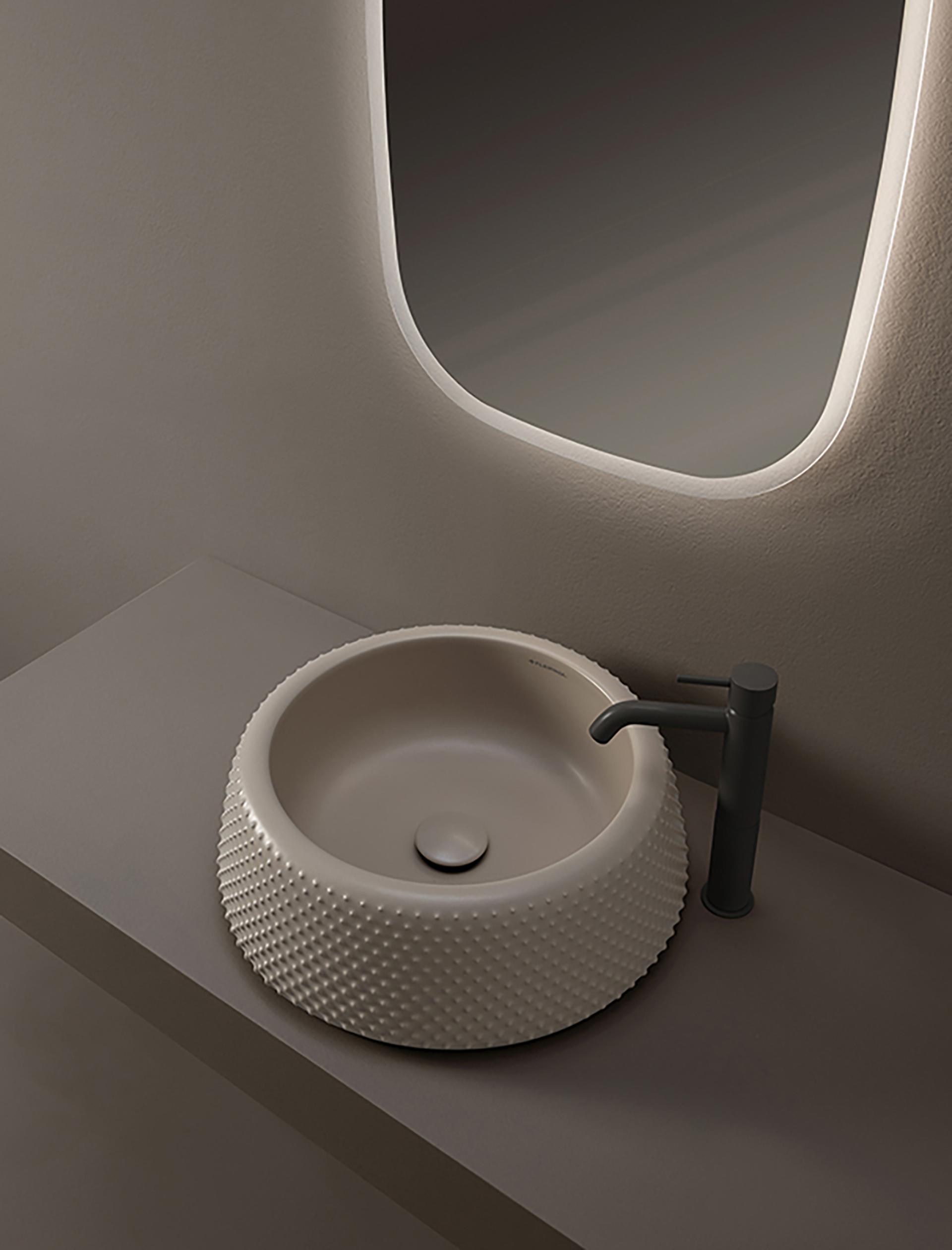 The unique dotted relief of the Falala countertop washbasin designed by Elena Salmistraro enhances the sculptural quality of the ceramic material and explores the theme of three-dimensionality.Inspired by African woven baskets, this washbasin has a soft, enveloping shape, and its original texture transforms an object for daily use into a unique piece. Available in various glossy and matt colours, Falala also comes. In a version featuring the special Crystal finish that creates an original light-dark effect.