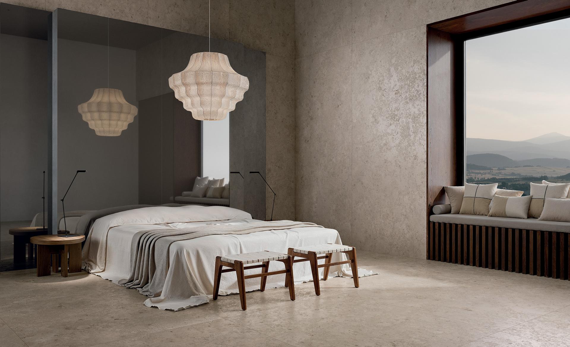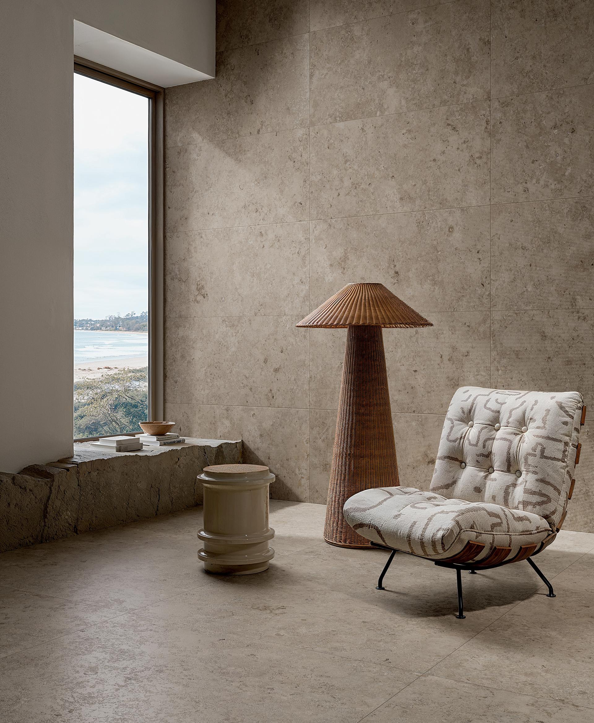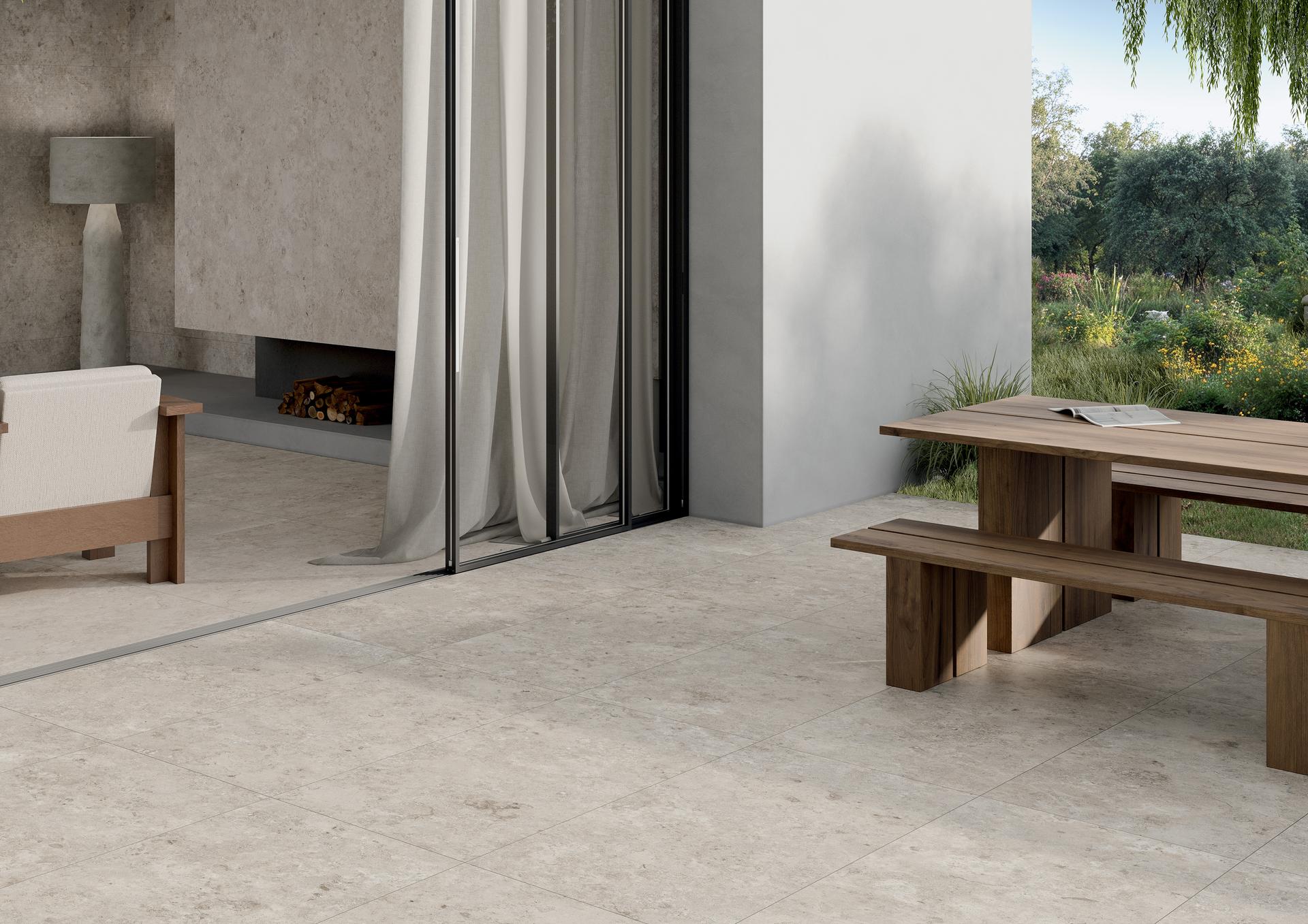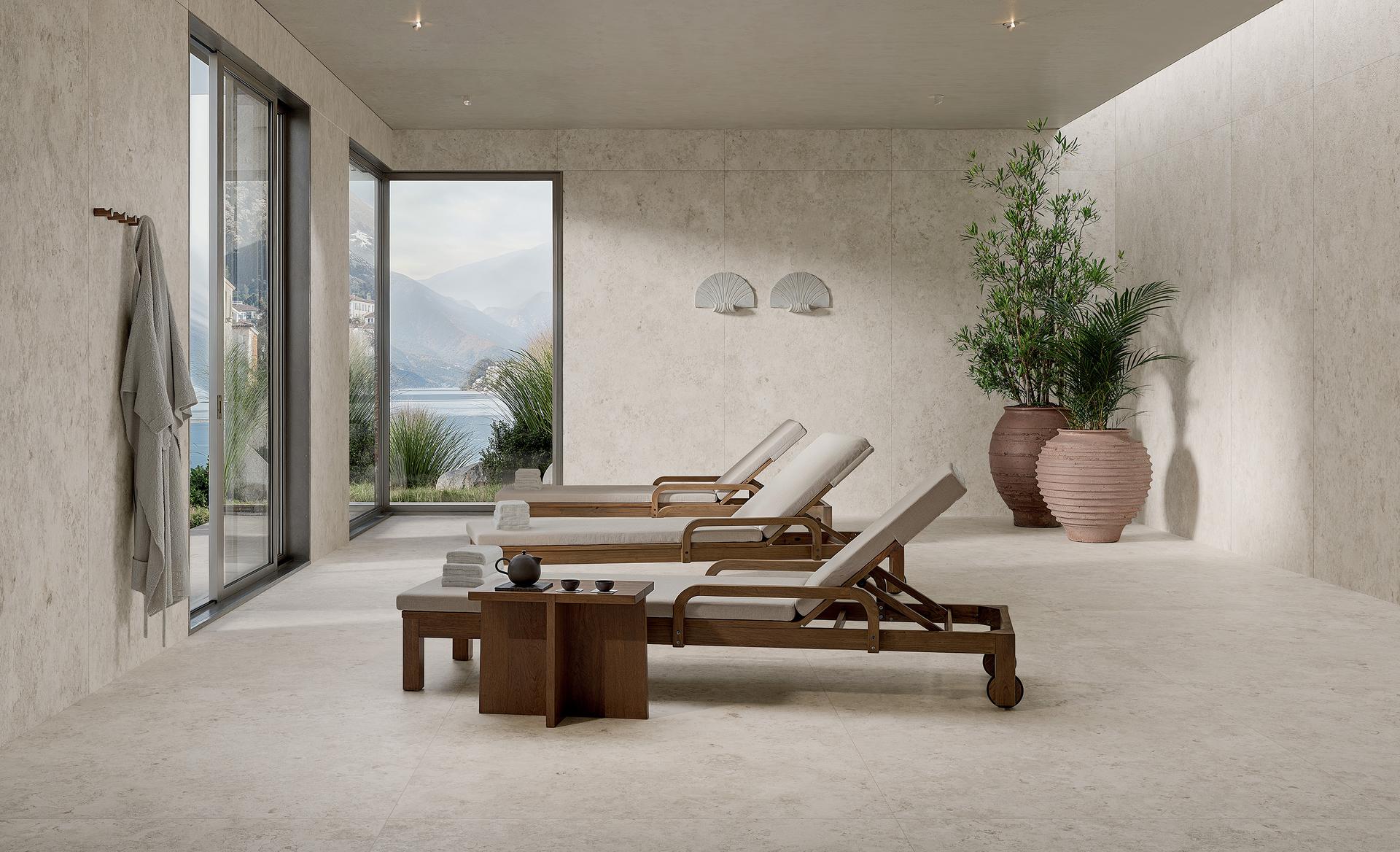 Jura Mood offers a contemporary reinterpretation of an ancient sedimentary stone with a uniform base enriched by subtle material inclusions. Available in three colours with beige accents in a spectrum from light to dark, the collection comes in two finishes: the non-reflective 3D Texture Real Matt and the soft 3D Texture Satin, which shifts subtly with the light. The Belt decorations complete the range, while the outdoor grip and 2.Out finishes ensure visual continuity between interior and exterior spaces.