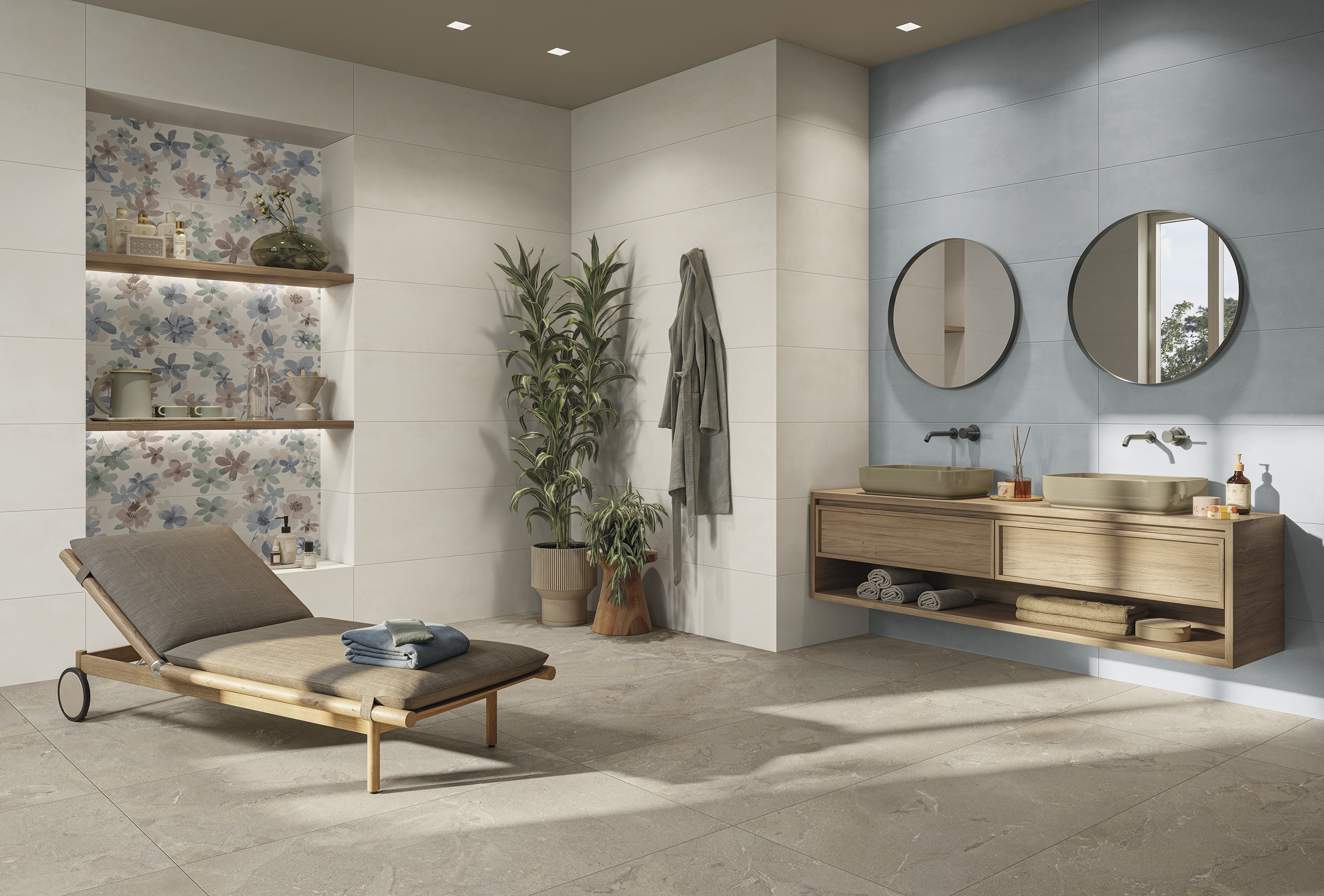 The color concept is completed by a sober, contemporary decorative repertoire: the tone-on-tone fine stripes of Linear, the handcrafted watercolor and floral touches of Floré, the gently rhythmic geometries of Rubik, and the soft reliefs that animate the neutral backgrounds of Vibra.