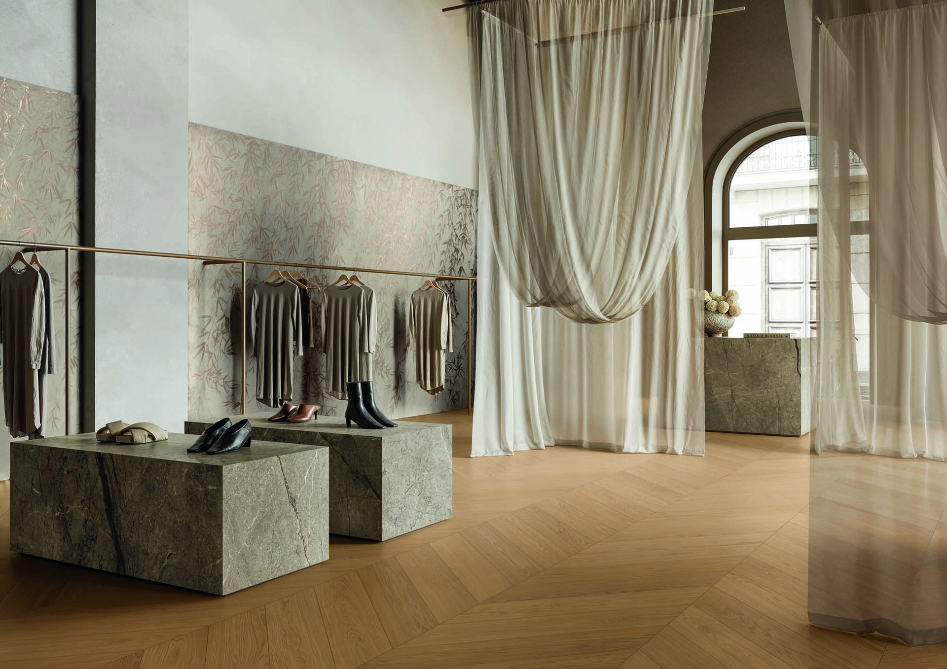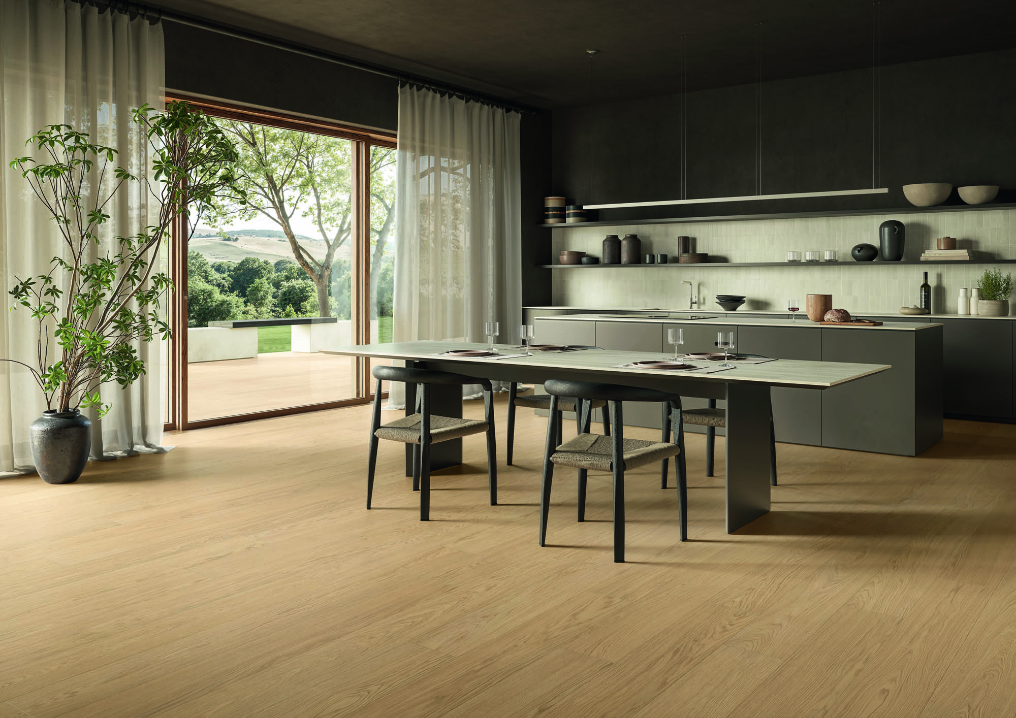 The Pure collection reinterprets natural wood in a surface that combines aesthetic harmony, a tactile feel and outstanding technical performance. It comes in five sophisticated colours: Glint creates a bright, airy feel; Grace adds depth and discretion; the soft and radiant Sheer stands out for its understated elegance; Dawn recalls the warm hues of sunrise; and Halo brings a sense of harmony with its enveloping, natural presence.
