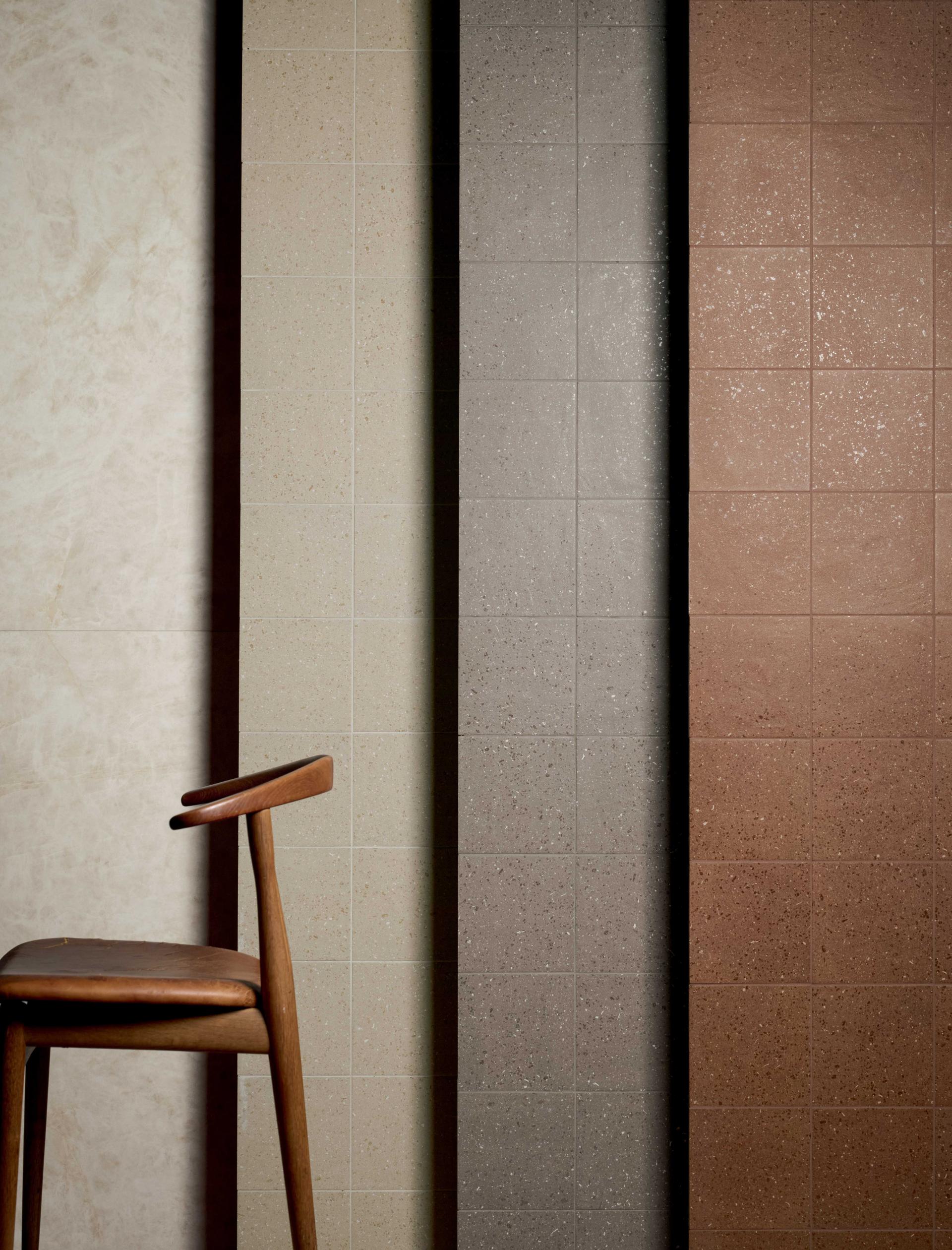 Terrasale is born from the encounter between Earth and Salt, two natural elements rich in charm. The strength of basaltina blends with the glossy inclusions of marine limestone, creating surfaces with a strong material identity. The 20×20 cm format, enhanced by matt pigments and glossy glazes, generates unique patterns such as Astro and Lacca. A collection that reinterprets artisan style in a contemporary way, evoking distant and exotic atmospheres.