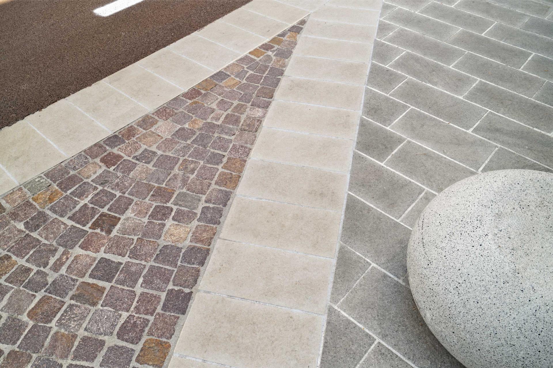 I progettisti hanno utilizzato Pietra Lavica di Grestone, marchio di Saxa Gres: “Per la pavimentazione la scelta è caduta sul gres porcellanato, un materiale adatto all’ambiente urbano, di buona qualità estetica e materica e con spessore contenuto. Il gres Pietra Lavica consente di creare piani omogenei e planari, adatti all’uso ciclopedonale e con ottime prestazioni in ogni condizione di tempo. Abbiamo scelto Sand e Grey, colori che hanno permesso un corretto accostamento cromatico con l’ambiente urbano dal notevole valore storico”. La ceramica può migliorare l’aspetto delle nostre città: “Nel nostro progetto il gres porcellanato ha rappresentato una scelta valida e versatile per un layout dal design moderno; inoltre, ci ha consentito di coniugare estetica e funzionalità, anche nella realizzazione delle pavimentazioni dalle linee organiche”.