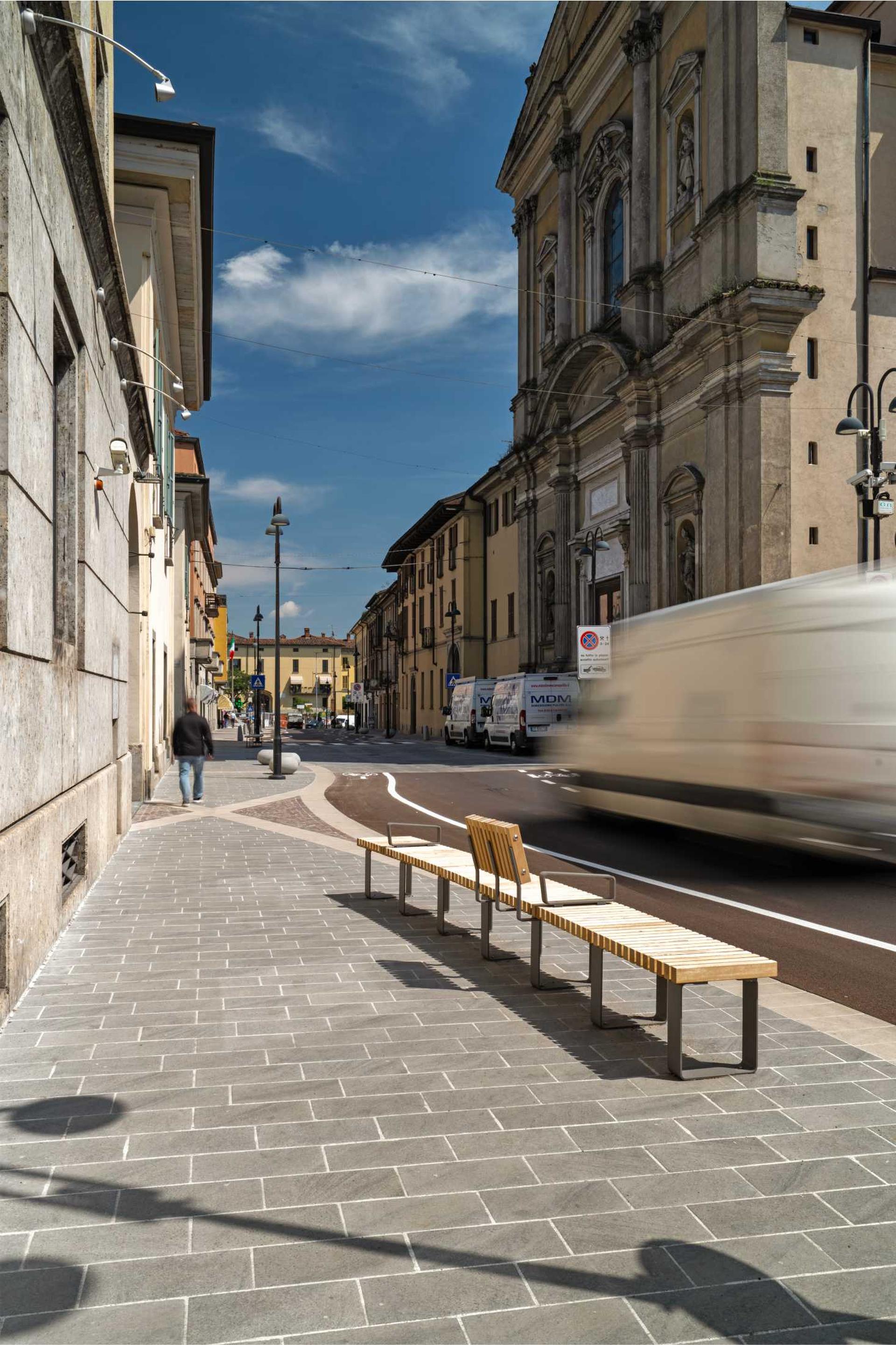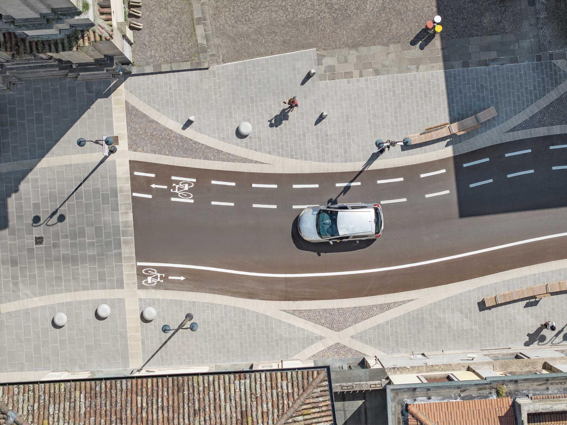 Il risultato è un centro storico più inclusivo: “Rendere gli spazi urbani un unico ambiente, bello, aperto e rinnovato, è stato uno degli obiettivi del progetto”, continuano gli architetti. “Un luogo privo di barriere architettoniche e sicuro, in cui le persone possono finalmente godere di migliori condizioni di fruizione, grazie a pavimentazioni idonee, arredo urbano di qualità, a misura di persone e bici, e alla messa in campo di dispositivi di moderazione del traffico. Insomma, una nuova “platea” che favorisce l’incontro e la socialità, là dove chiesa, municipio, oratorio e attività commerciali si trovano a dialogare”.