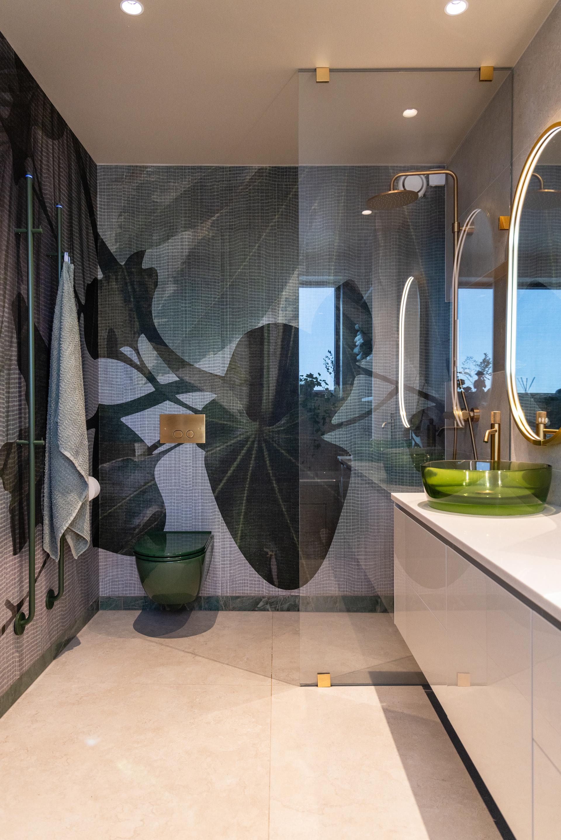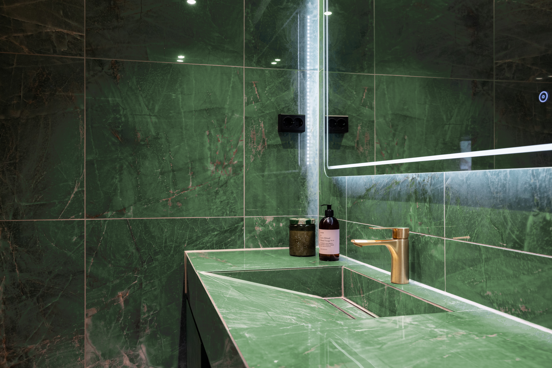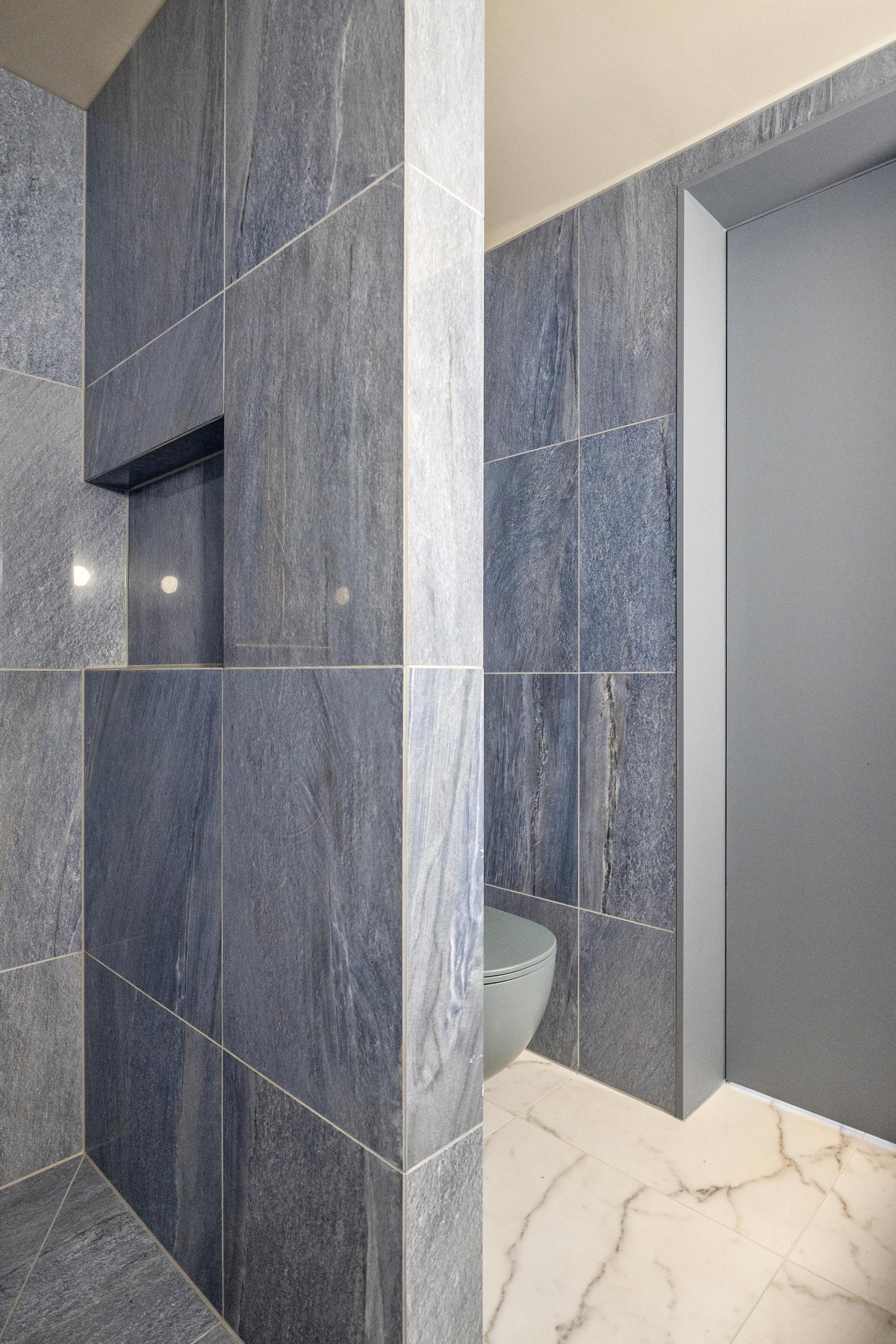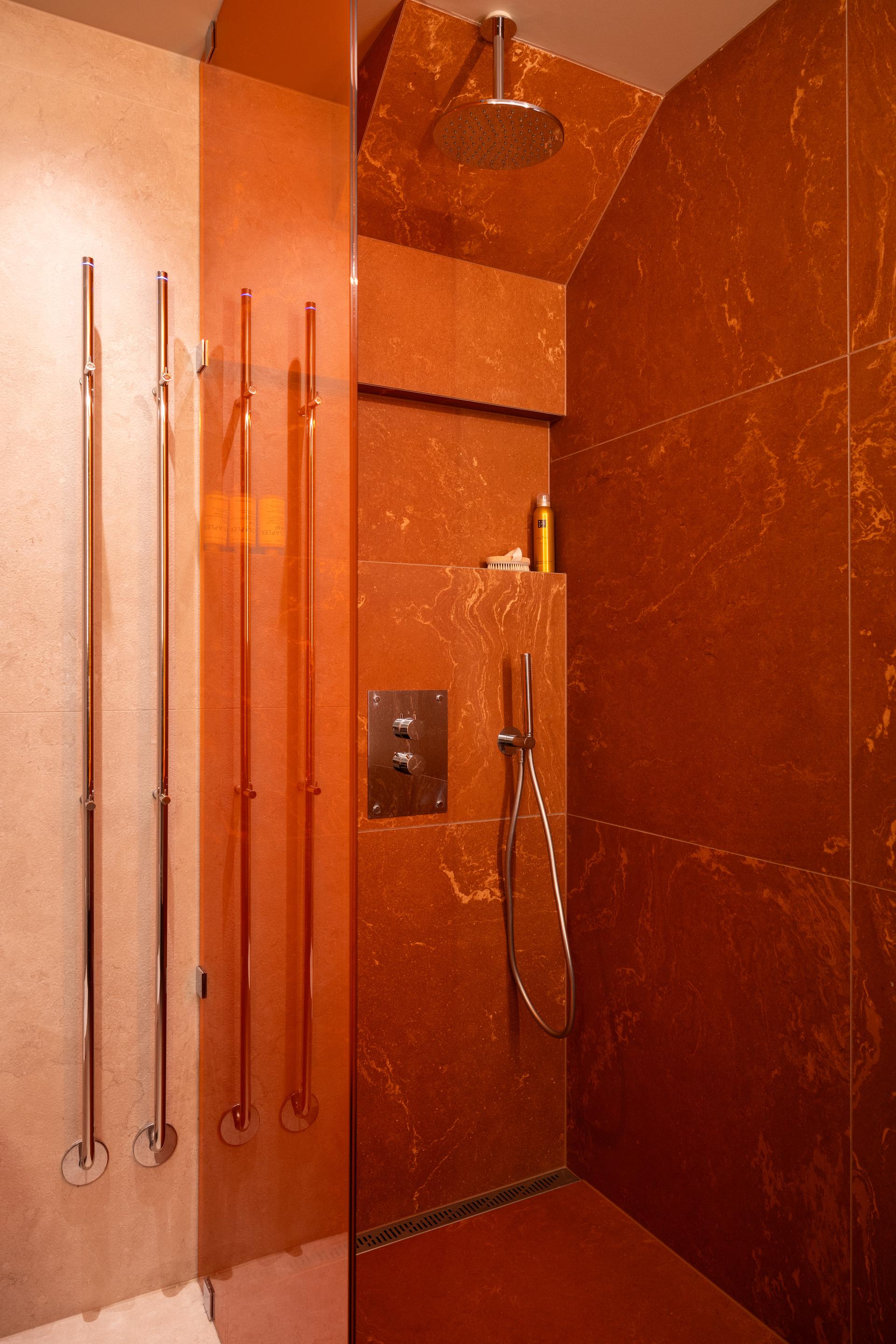 Colour is used thoughtfully throughout the home to create an atmosphere that is at once lively and relaxing. “The aim was to focus on the rooms with the best views, while also designing quiet, stress-free areas for sleeping and working,” says Siv. “I have a deep knowledge of the principles of Feng Shui, so I understand how colour can affect quality of life. With this in mind, we chose a palette of warm, deep tones to create a bold yet welcoming mood – a mix of light and dark, with red as a recurring theme.” Ceramic tiles from Fioranese play a key role in the design, chosen for their rich colours and textures, including the collections I Variegati (colour Cotto), Prestige (Portoro and Borghini Effect), Marmorea Intensa (Emerald Dream and Azul Bahia) and Kintsugi (in several decorative versions of the colours Black and Fog). “We selected these tiles for their textures and colours and their striking aesthetic and emotional appeal,” notes the architect. “Our client had lived in Italy and had developed a real appreciation for porcelain stoneware floors and walls. These light, bright materials are versatile, decorative and easy to keep clean.”