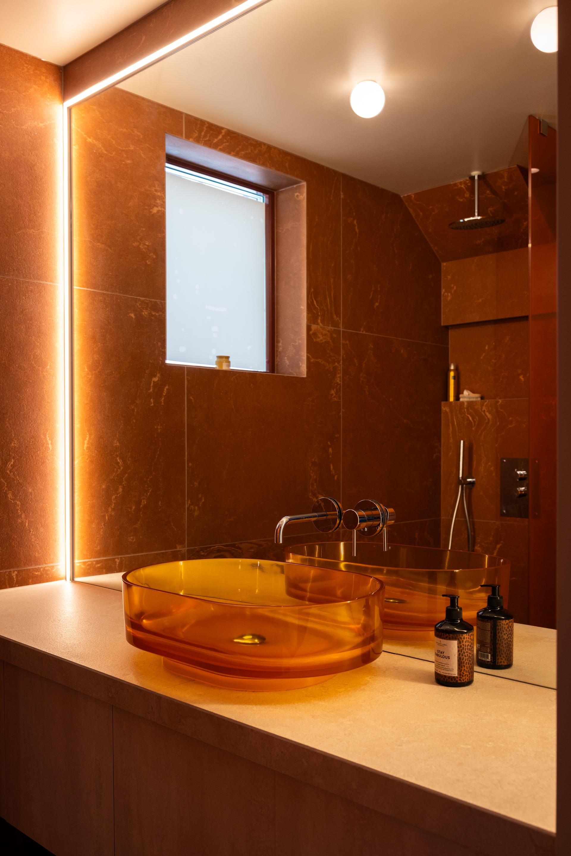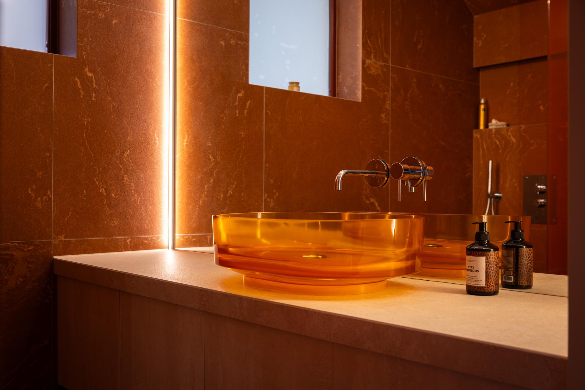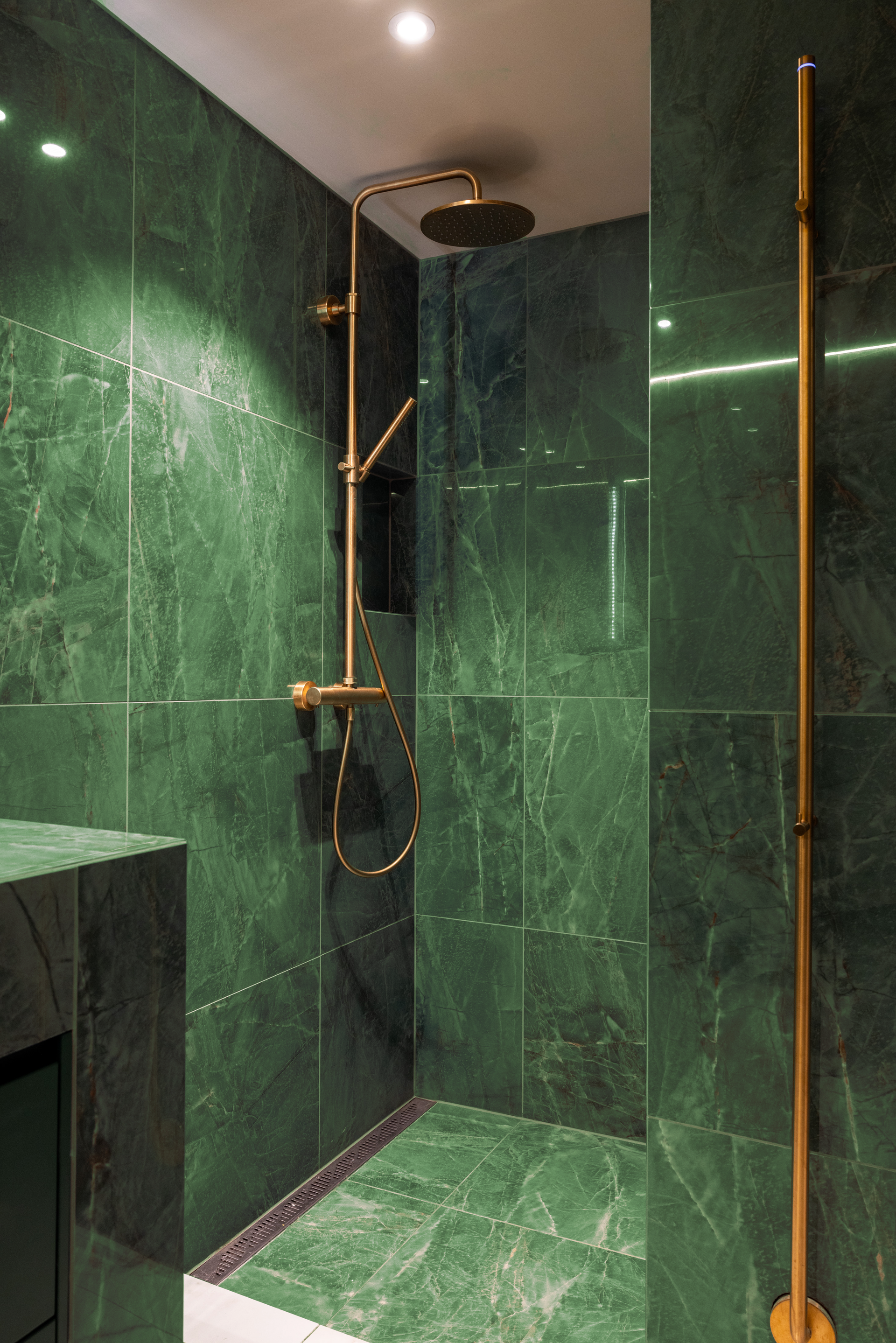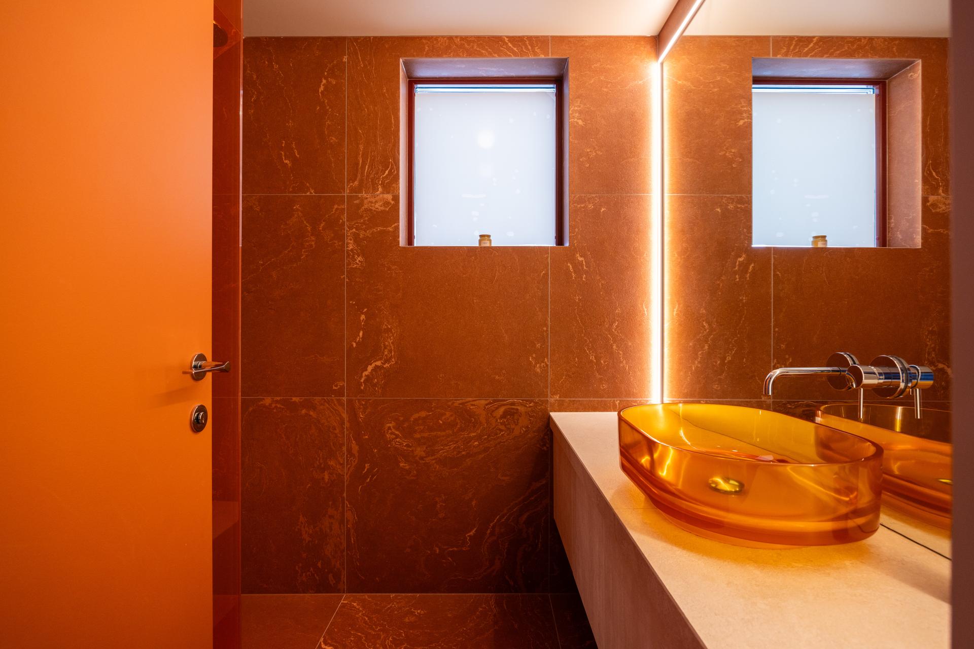 Colour is used thoughtfully throughout the home to create an atmosphere that is at once lively and relaxing. “The aim was to focus on the rooms with the best views, while also designing quiet, stress-free areas for sleeping and working,” says Siv. “I have a deep knowledge of the principles of Feng Shui, so I understand how colour can affect quality of life. With this in mind, we chose a palette of warm, deep tones to create a bold yet welcoming mood – a mix of light and dark, with red as a recurring theme.” Ceramic tiles from Fioranese play a key role in the design, chosen for their rich colours and textures, including the collections I Variegati (colour Cotto), Prestige (Portoro and Borghini Effect), Marmorea Intensa (Emerald Dream and Azul Bahia) and Kintsugi (in several decorative versions of the colours Black and Fog). “We selected these tiles for their textures and colours and their striking aesthetic and emotional appeal,” notes the architect. “Our client had lived in Italy and had developed a real appreciation for porcelain stoneware floors and walls. These light, bright materials are versatile, decorative and easy to keep clean.”