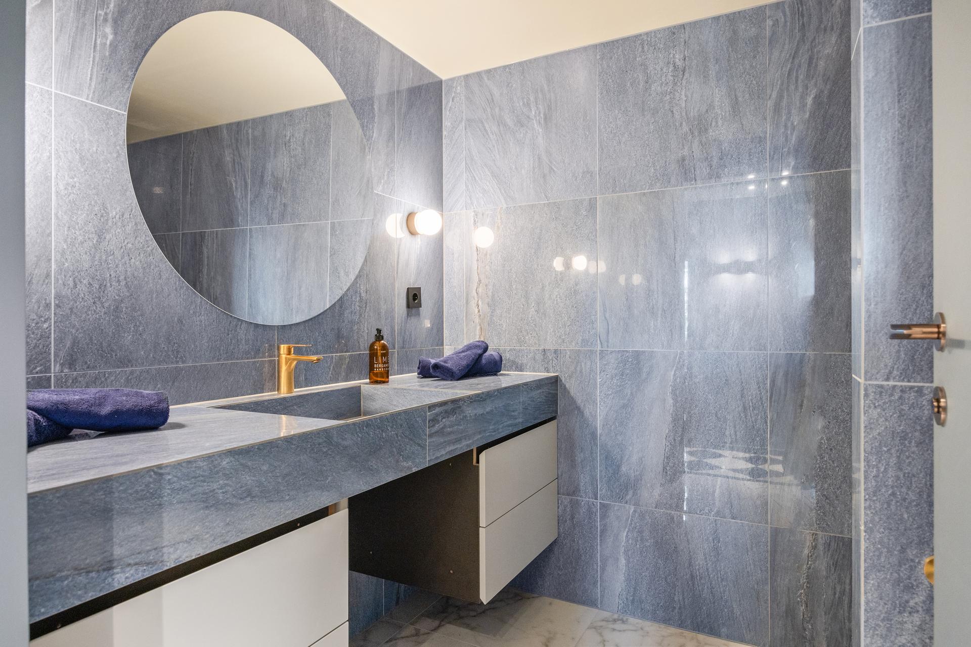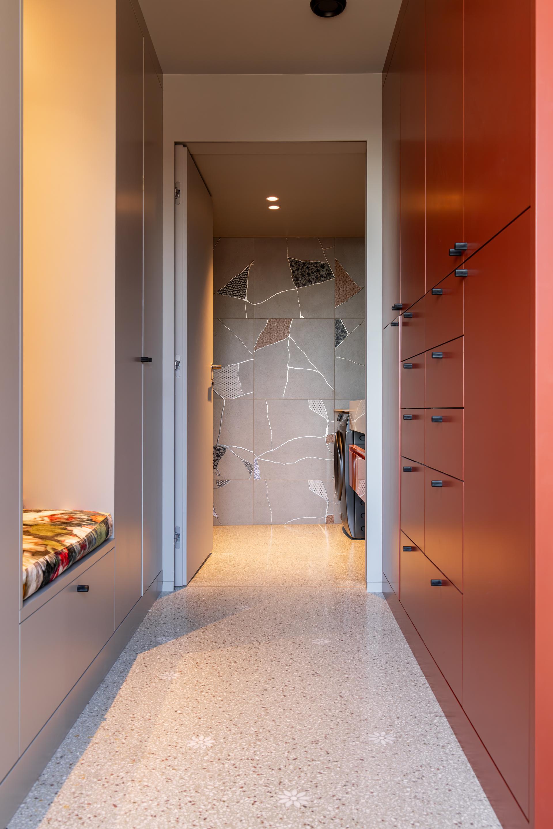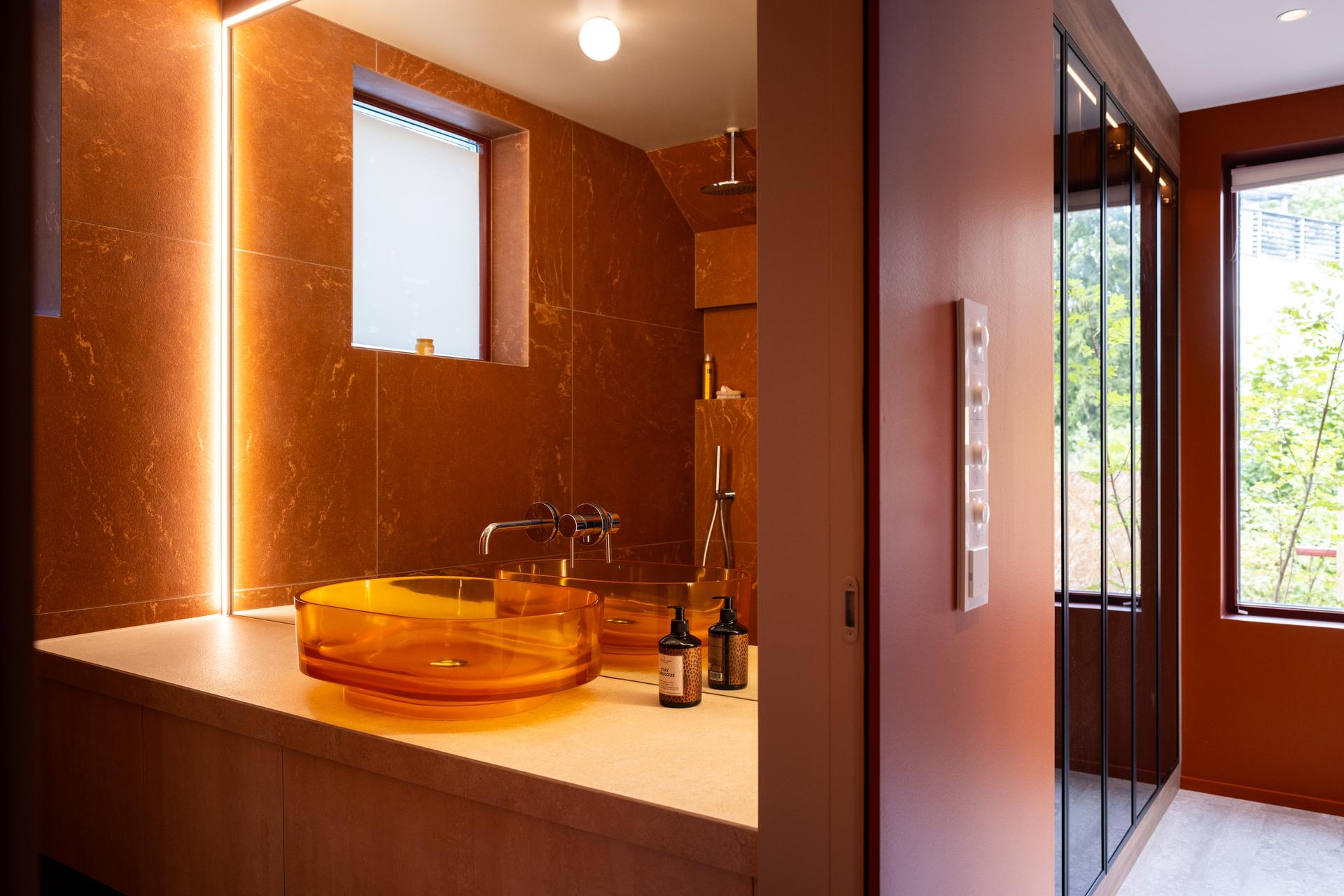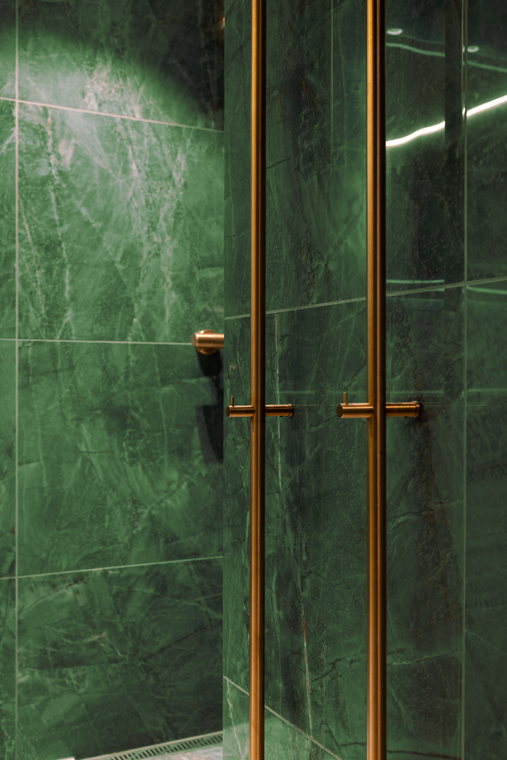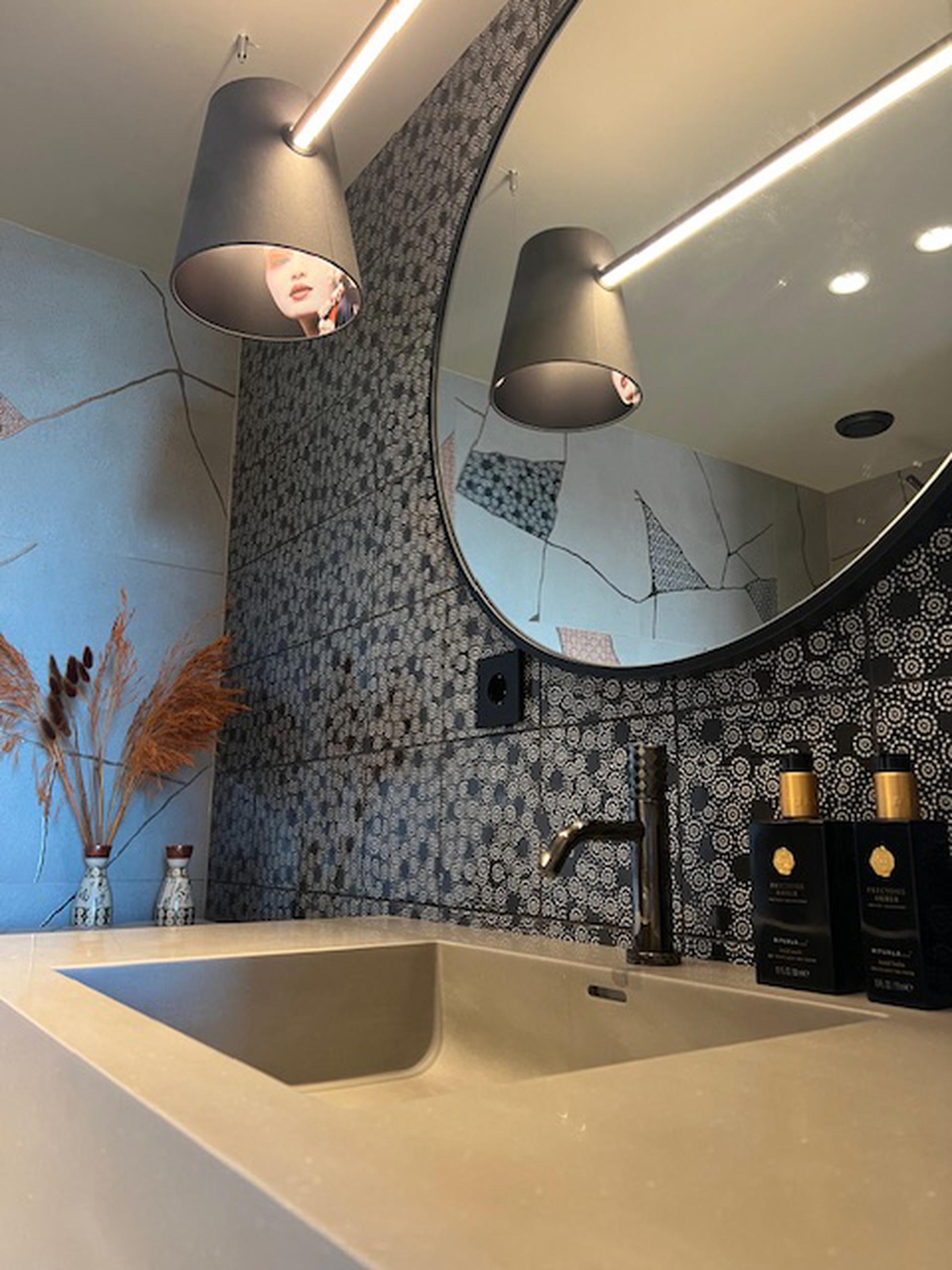 Colour is used thoughtfully throughout the home to create an atmosphere that is at once lively and relaxing. “The aim was to focus on the rooms with the best views, while also designing quiet, stress-free areas for sleeping and working,” says Siv. “I have a deep knowledge of the principles of Feng Shui, so I understand how colour can affect quality of life. With this in mind, we chose a palette of warm, deep tones to create a bold yet welcoming mood – a mix of light and dark, with red as a recurring theme.” Ceramic tiles from Fioranese play a key role in the design, chosen for their rich colours and textures, including the collections I Variegati (colour Cotto), Prestige (Portoro and Borghini Effect), Marmorea Intensa (Emerald Dream and Azul Bahia) and Kintsugi (in several decorative versions of the colours Black and Fog). “We selected these tiles for their textures and colours and their striking aesthetic and emotional appeal,” notes the architect. “Our client had lived in Italy and had developed a real appreciation for porcelain stoneware floors and walls. These light, bright materials are versatile, decorative and easy to keep clean.”