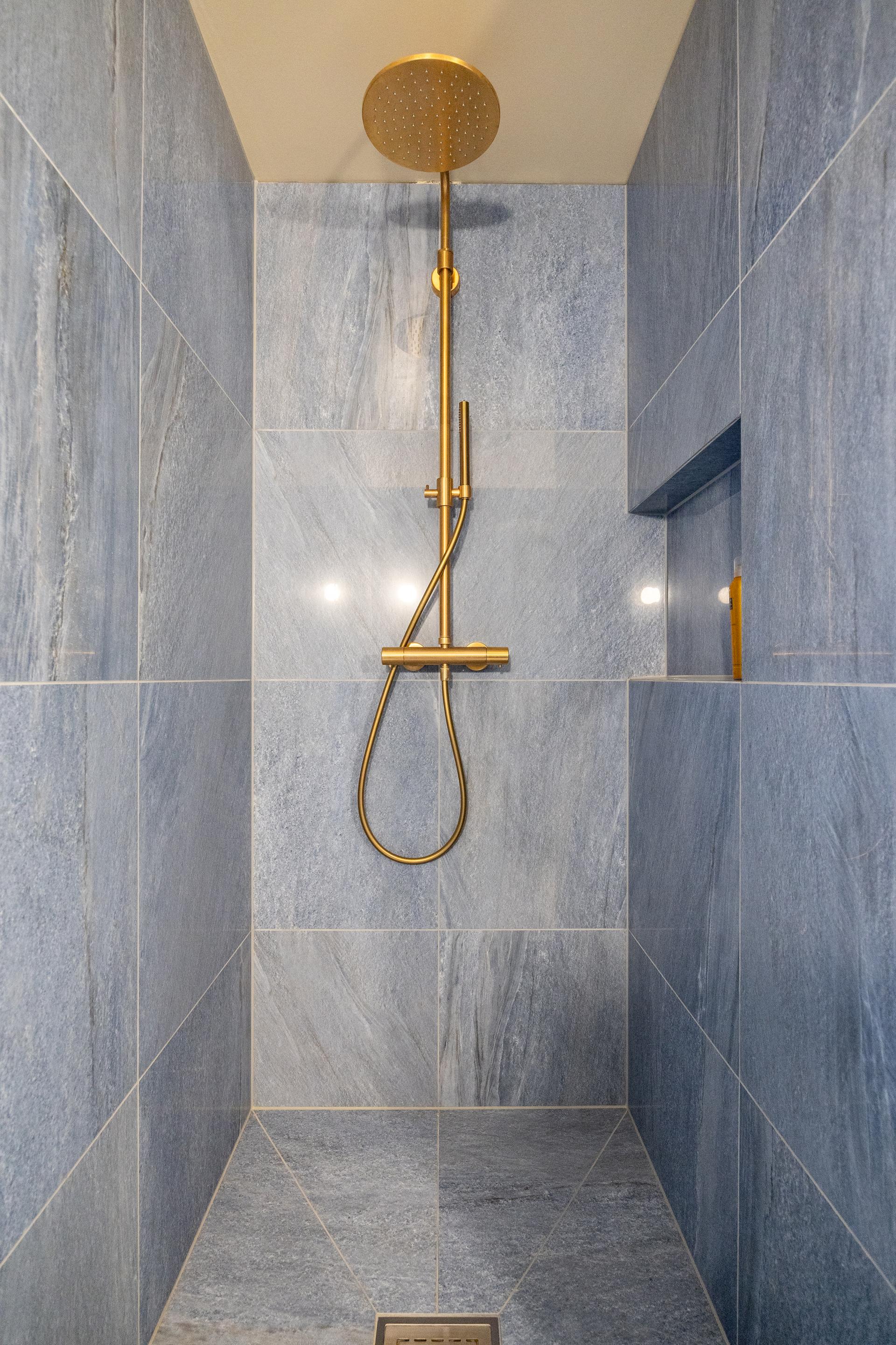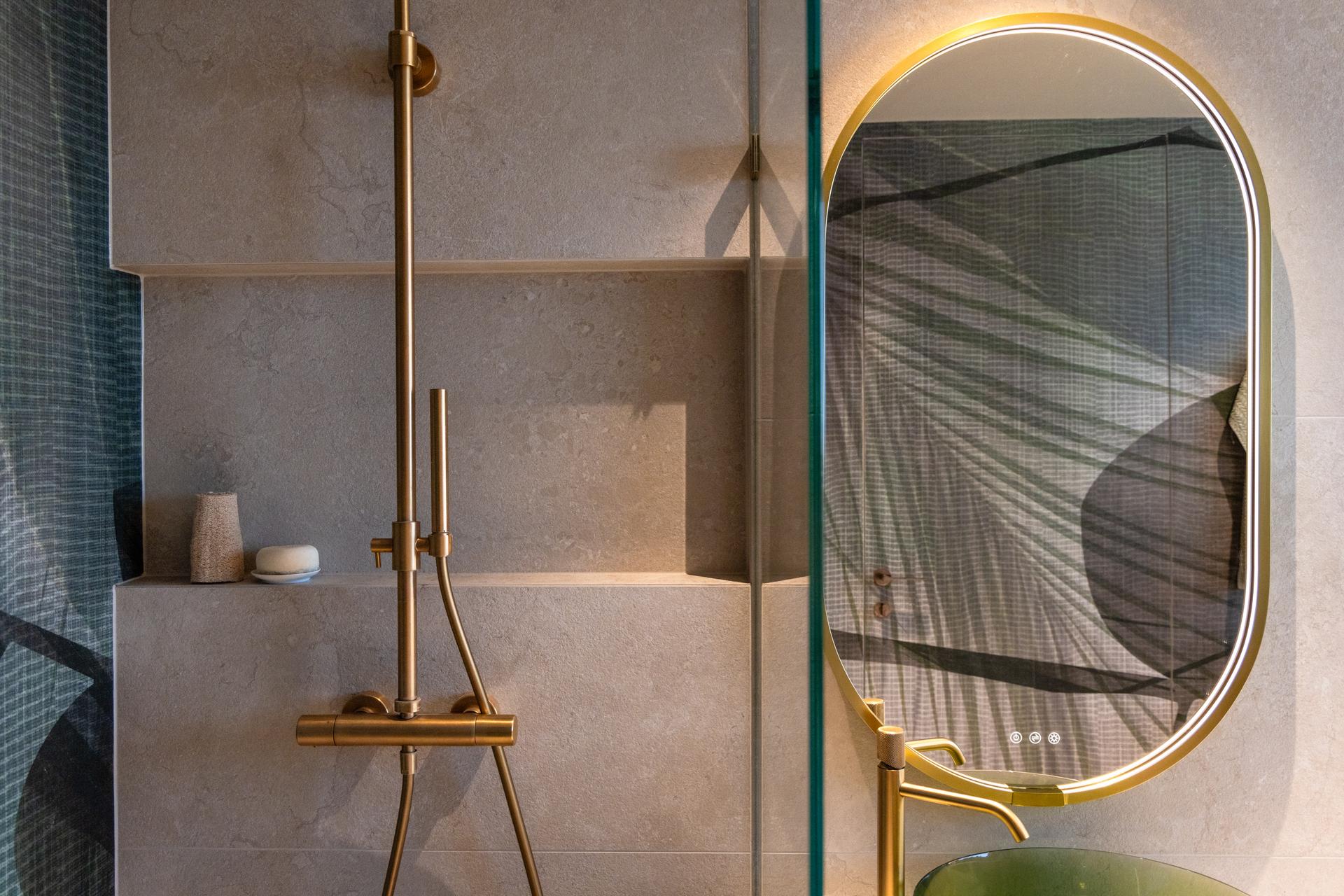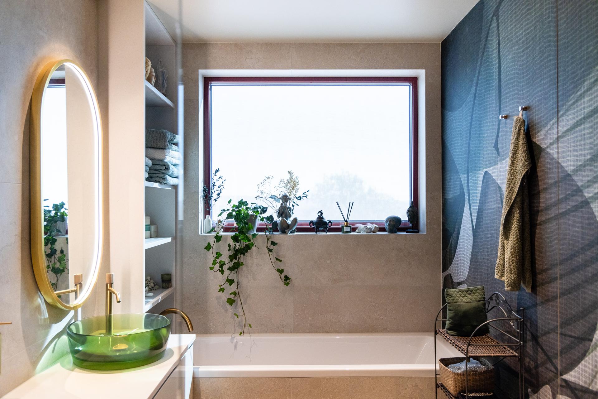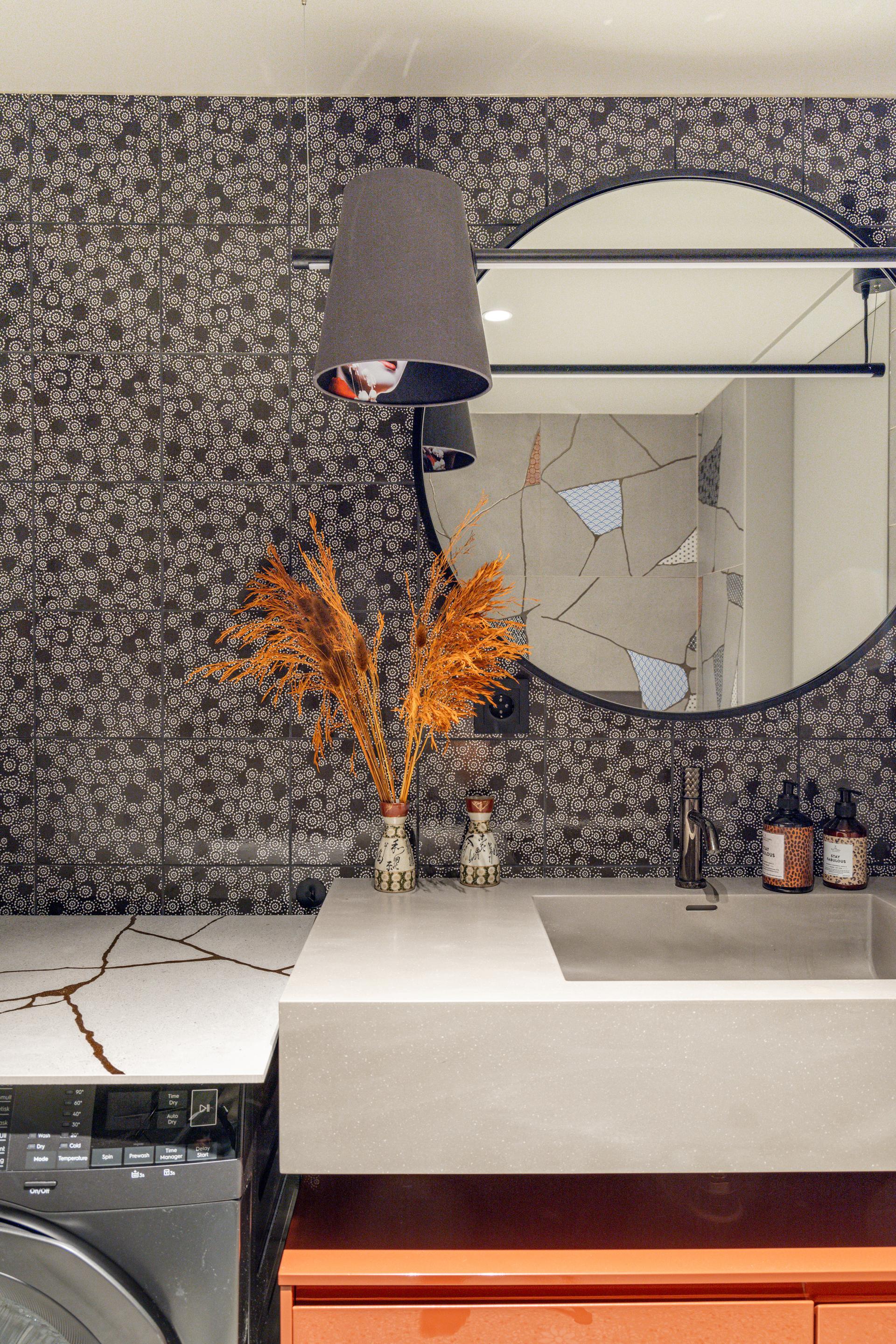 Colour is used thoughtfully throughout the home to create an atmosphere that is at once lively and relaxing. “The aim was to focus on the rooms with the best views, while also designing quiet, stress-free areas for sleeping and working,” says Siv. “I have a deep knowledge of the principles of Feng Shui, so I understand how colour can affect quality of life. With this in mind, we chose a palette of warm, deep tones to create a bold yet welcoming mood – a mix of light and dark, with red as a recurring theme.” Ceramic tiles from Fioranese play a key role in the design, chosen for their rich colours and textures, including the collections I Variegati (colour Cotto), Prestige (Portoro and Borghini Effect), Marmorea Intensa (Emerald Dream and Azul Bahia) and Kintsugi (in several decorative versions of the colours Black and Fog). “We selected these tiles for their textures and colours and their striking aesthetic and emotional appeal,” notes the architect. “Our client had lived in Italy and had developed a real appreciation for porcelain stoneware floors and walls. These light, bright materials are versatile, decorative and easy to keep clean.”