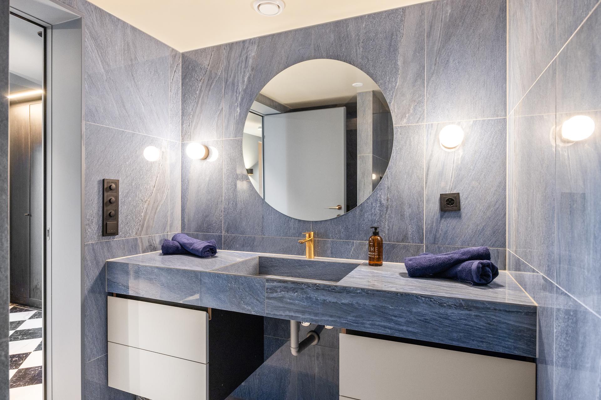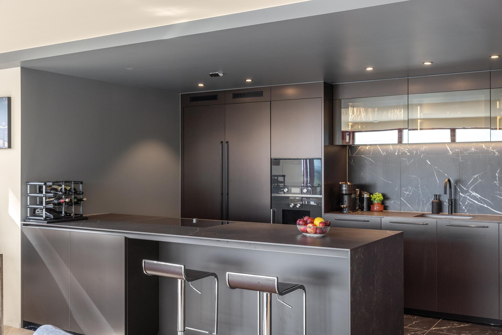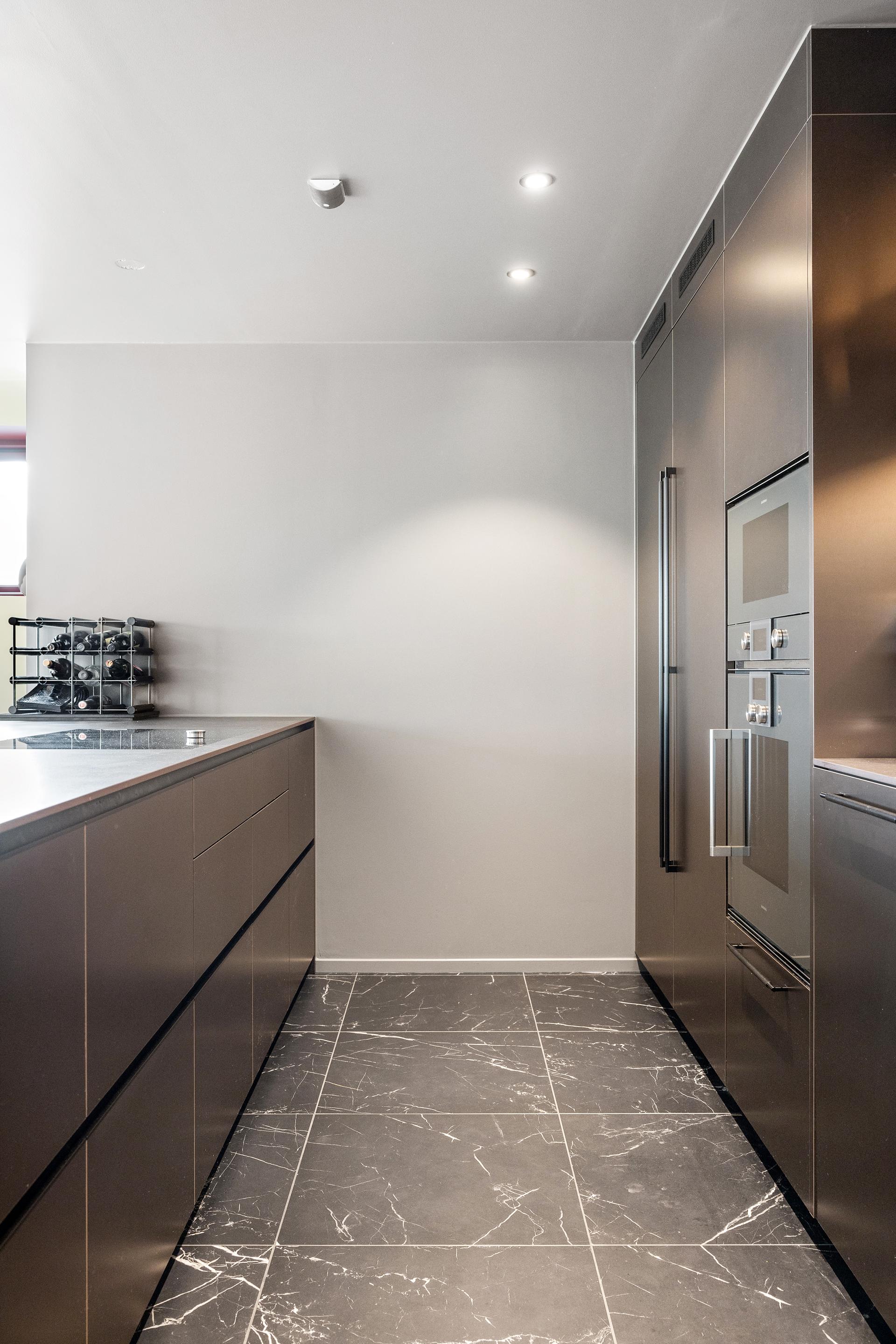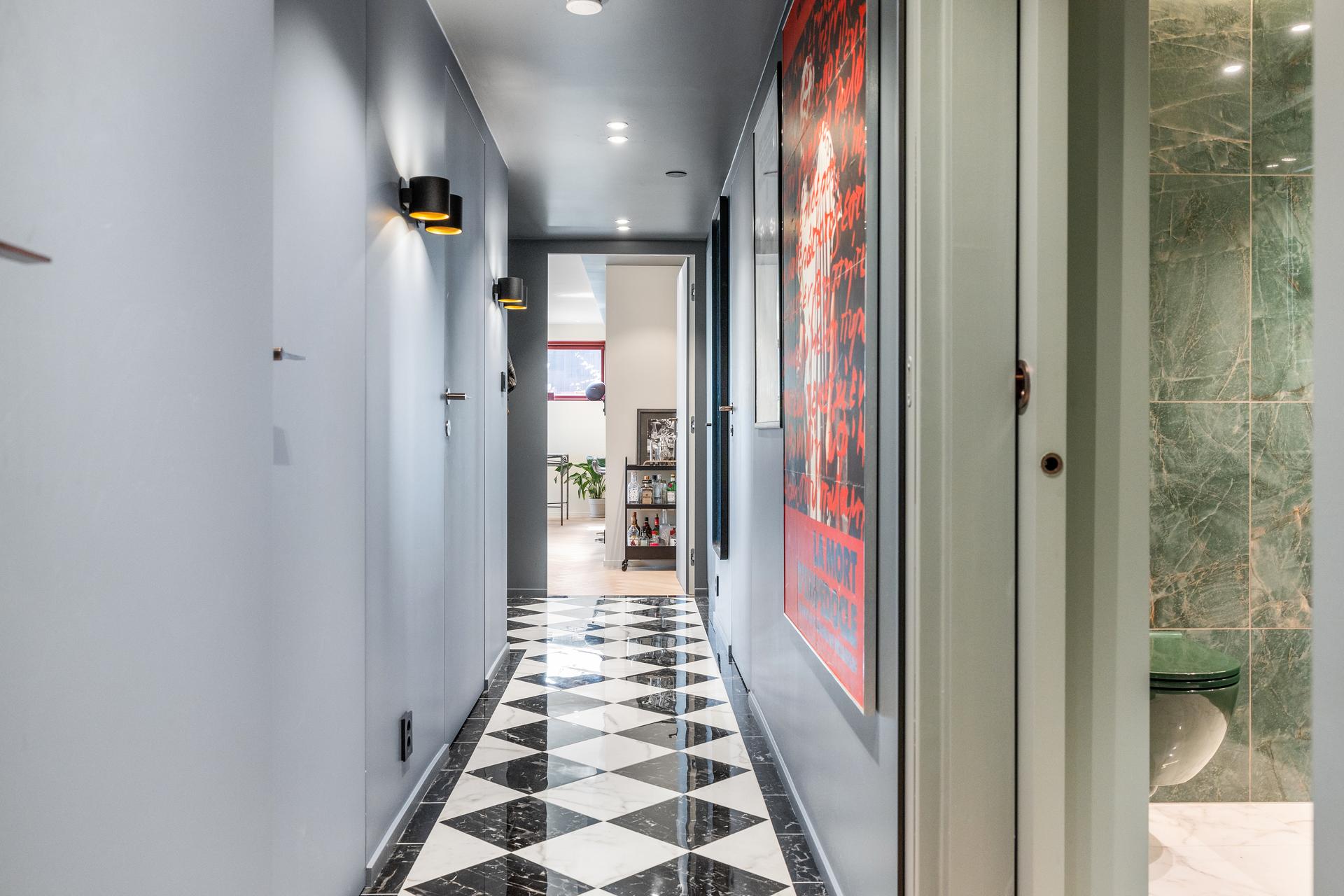 The floor plan is simple and functional, ensuring a smooth flow between the open, social areas and the more intimate, private spaces. The linear kitchen stands out for its mix of pop aesthetics and high-tech design, combining a green and white chequered backsplash with a rhythmic sequence of stainless-steel appliances. The lighting, developed with the help of a lighting designer, makes maximum use of natural daylight while creating dramatic and atmospheric effects. A radiant underfloor heating system and constant sea breezes ensure effective ventilation and improve the penthouse’s energy performance. Ultimately, this penthouse is more than just a place to live: it is a refined statement of contemporary living, where architectural precision goes hand-in-hand with a deeply personal vision. Built to comply with Norway’s latest sustainability standards, its timeless aesthetic ensures lasting appeal.