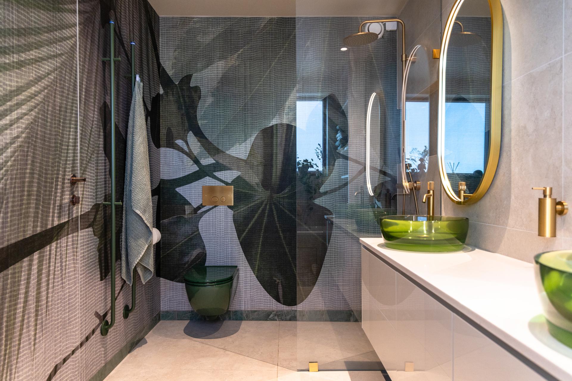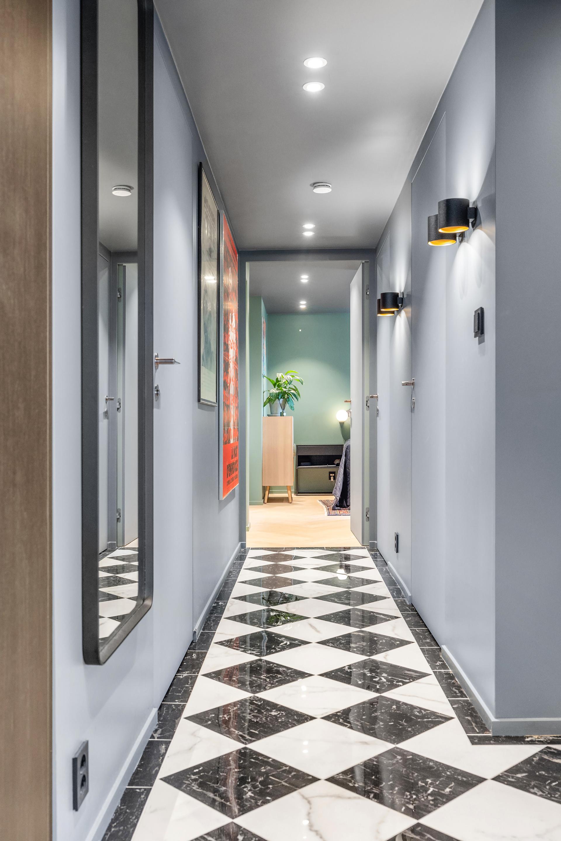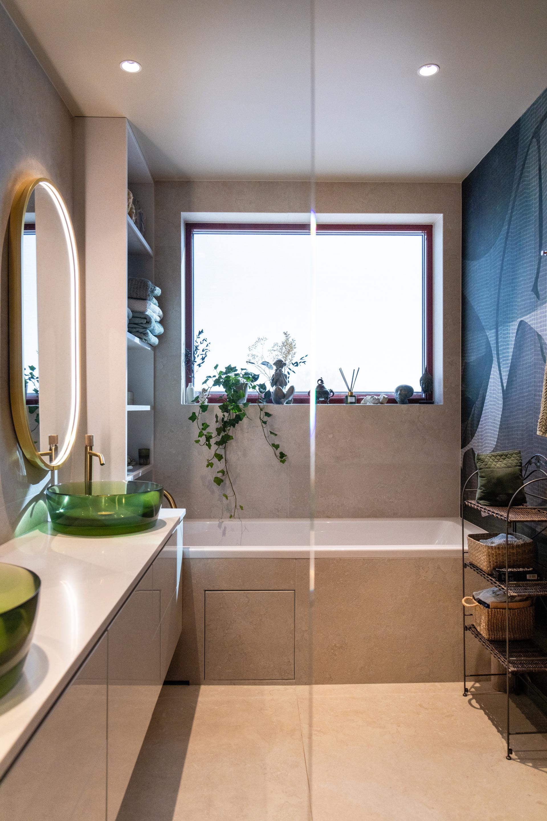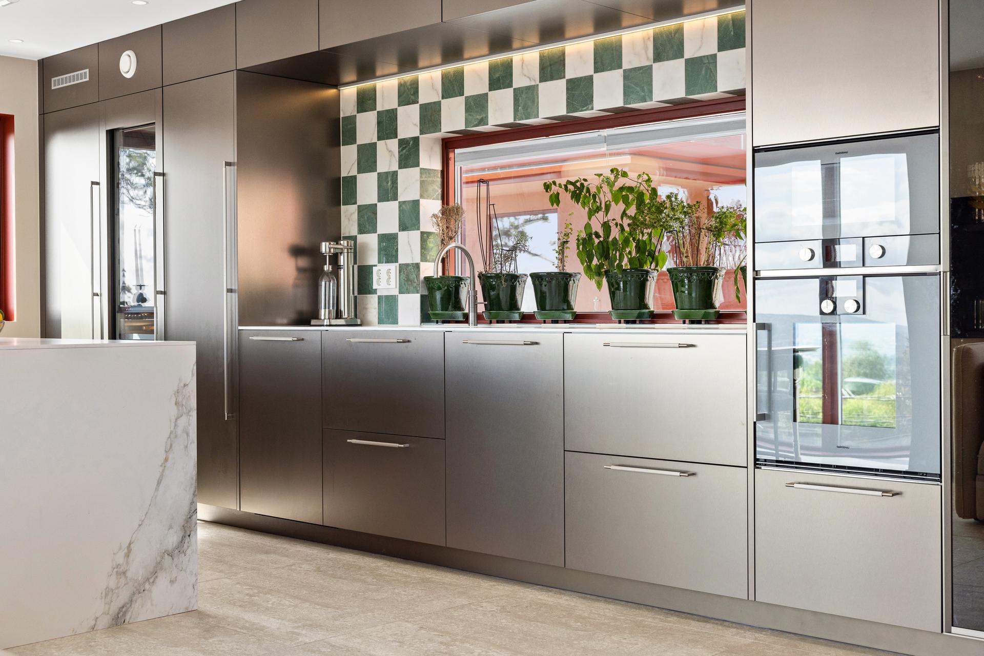 The floor plan is simple and functional, ensuring a smooth flow between the open, social areas and the more intimate, private spaces. The linear kitchen stands out for its mix of pop aesthetics and high-tech design, combining a green and white chequered backsplash with a rhythmic sequence of stainless-steel appliances. The lighting, developed with the help of a lighting designer, makes maximum use of natural daylight while creating dramatic and atmospheric effects. A radiant underfloor heating system and constant sea breezes ensure effective ventilation and improve the penthouse’s energy performance. Ultimately, this penthouse is more than just a place to live: it is a refined statement of contemporary living, where architectural precision goes hand-in-hand with a deeply personal vision. Built to comply with Norway’s latest sustainability standards, its timeless aesthetic ensures lasting appeal.