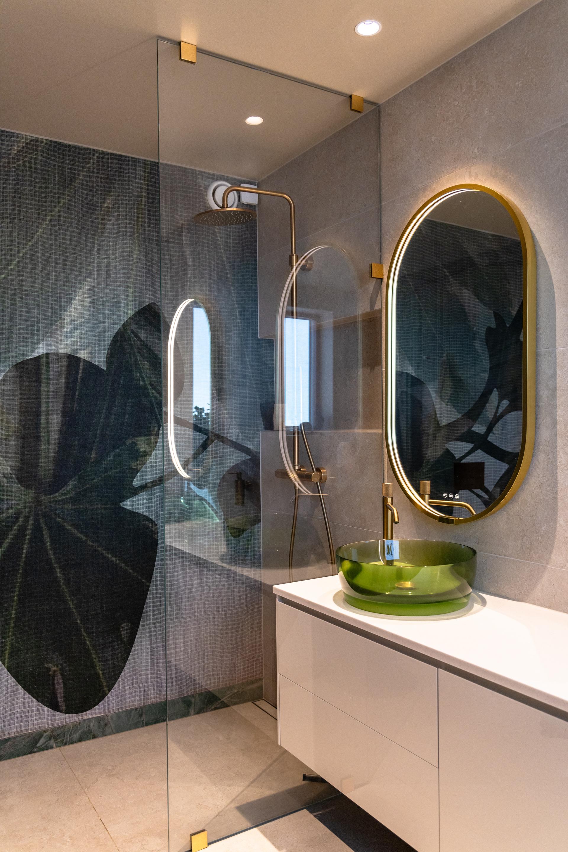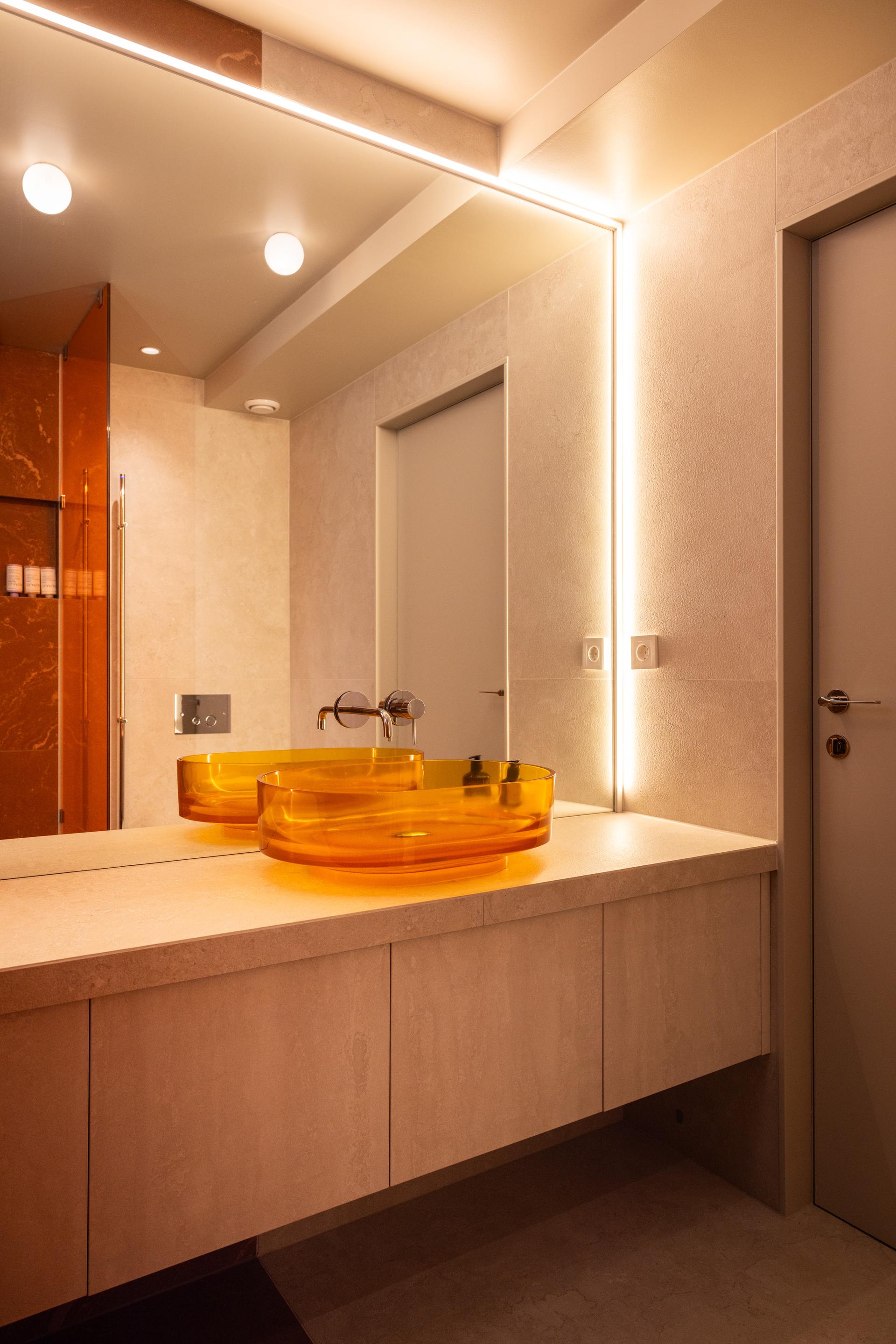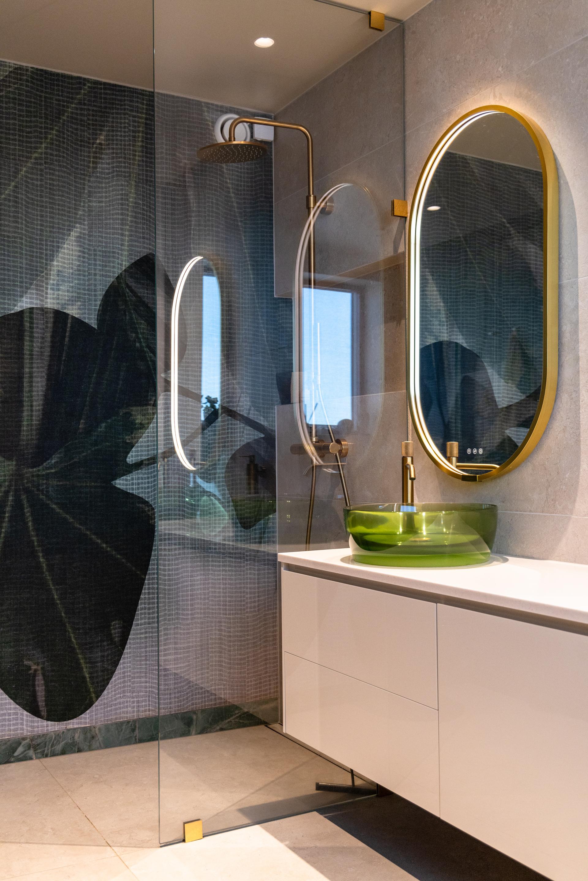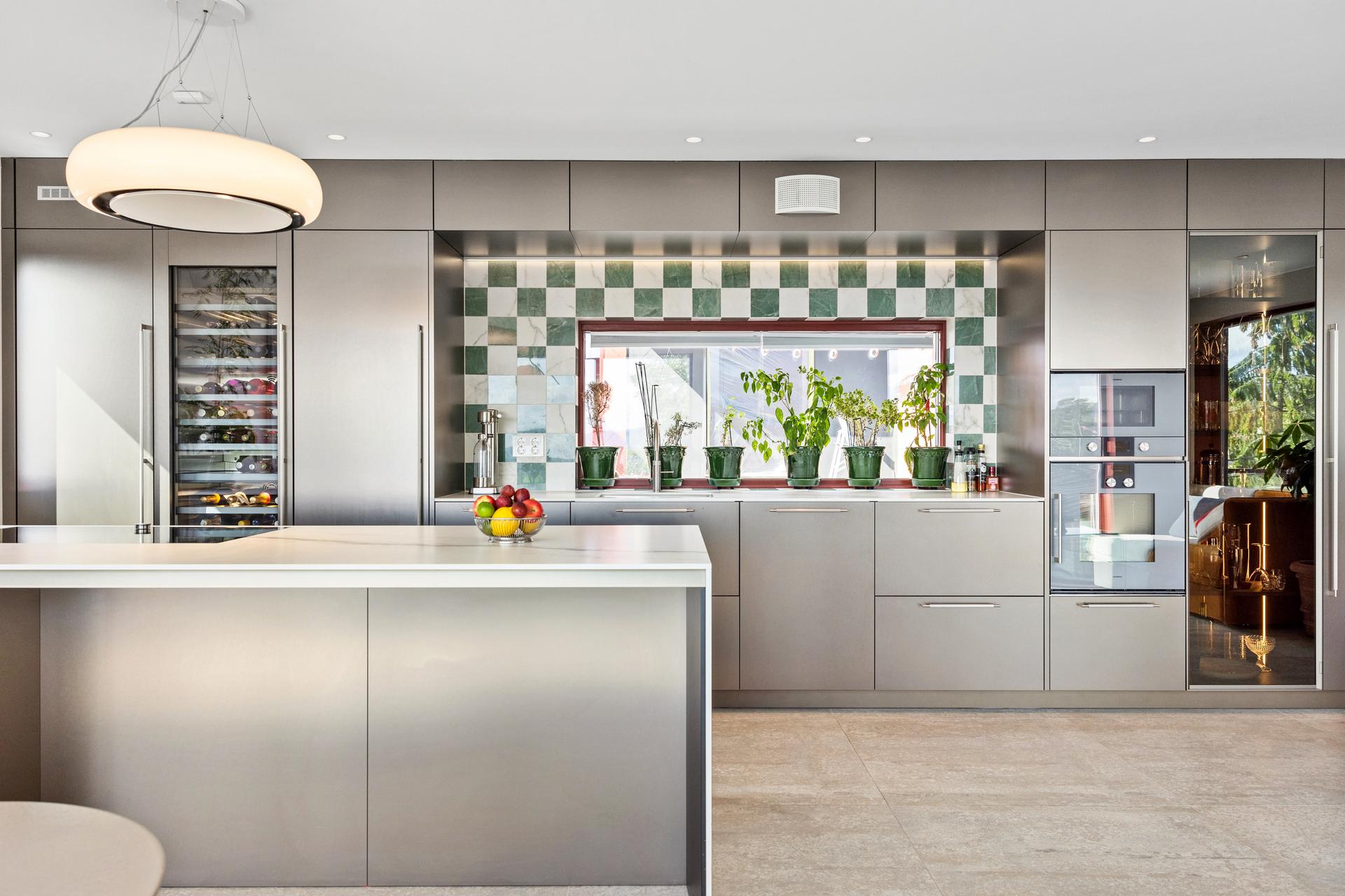 The floor plan is simple and functional, ensuring a smooth flow between the open, social areas and the more intimate, private spaces. The linear kitchen stands out for its mix of pop aesthetics and high-tech design, combining a green and white chequered backsplash with a rhythmic sequence of stainless-steel appliances. The lighting, developed with the help of a lighting designer, makes maximum use of natural daylight while creating dramatic and atmospheric effects. A radiant underfloor heating system and constant sea breezes ensure effective ventilation and improve the penthouse’s energy performance. Ultimately, this penthouse is more than just a place to live: it is a refined statement of contemporary living, where architectural precision goes hand-in-hand with a deeply personal vision. Built to comply with Norway’s latest sustainability standards, its timeless aesthetic ensures lasting appeal.