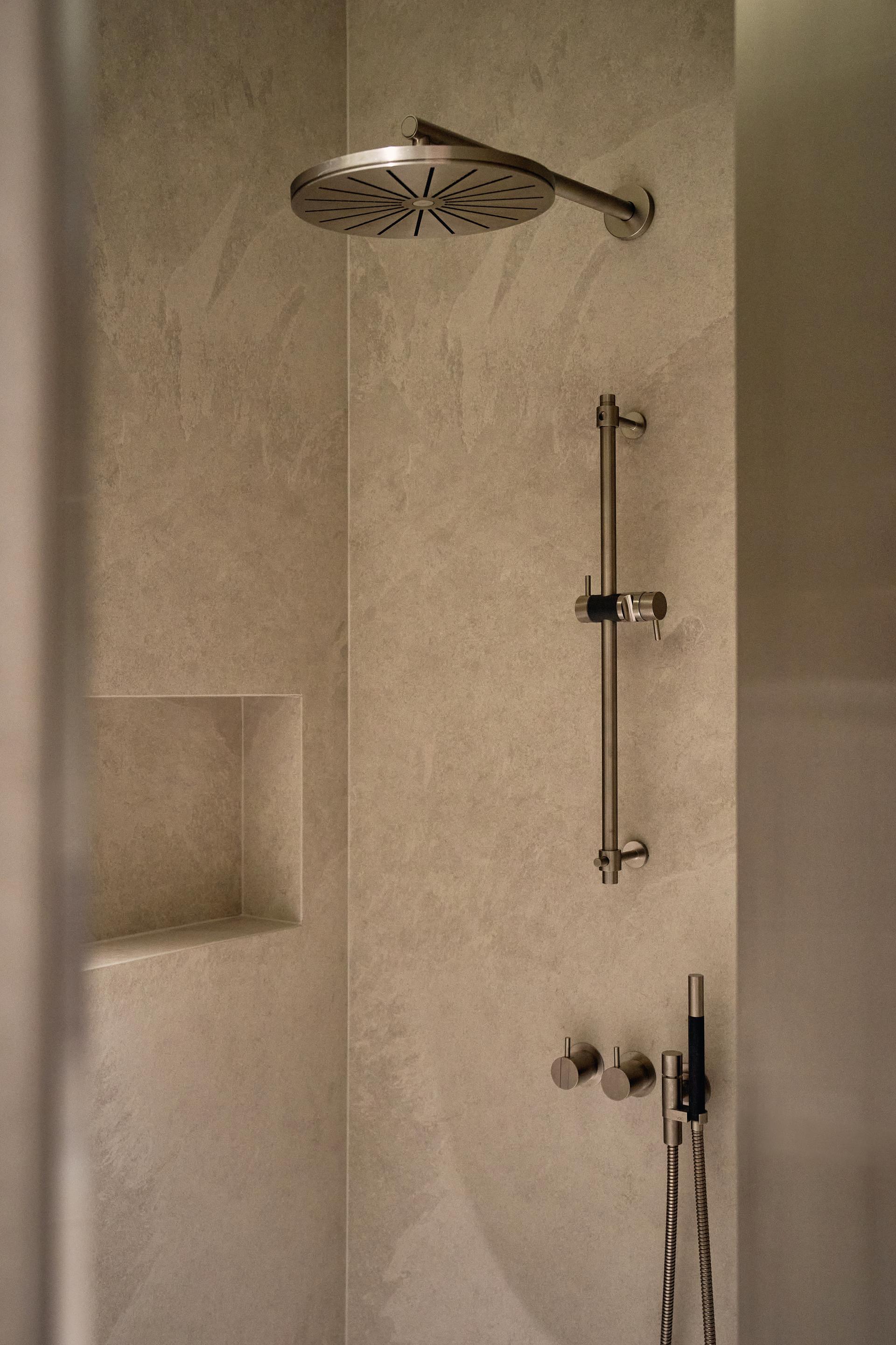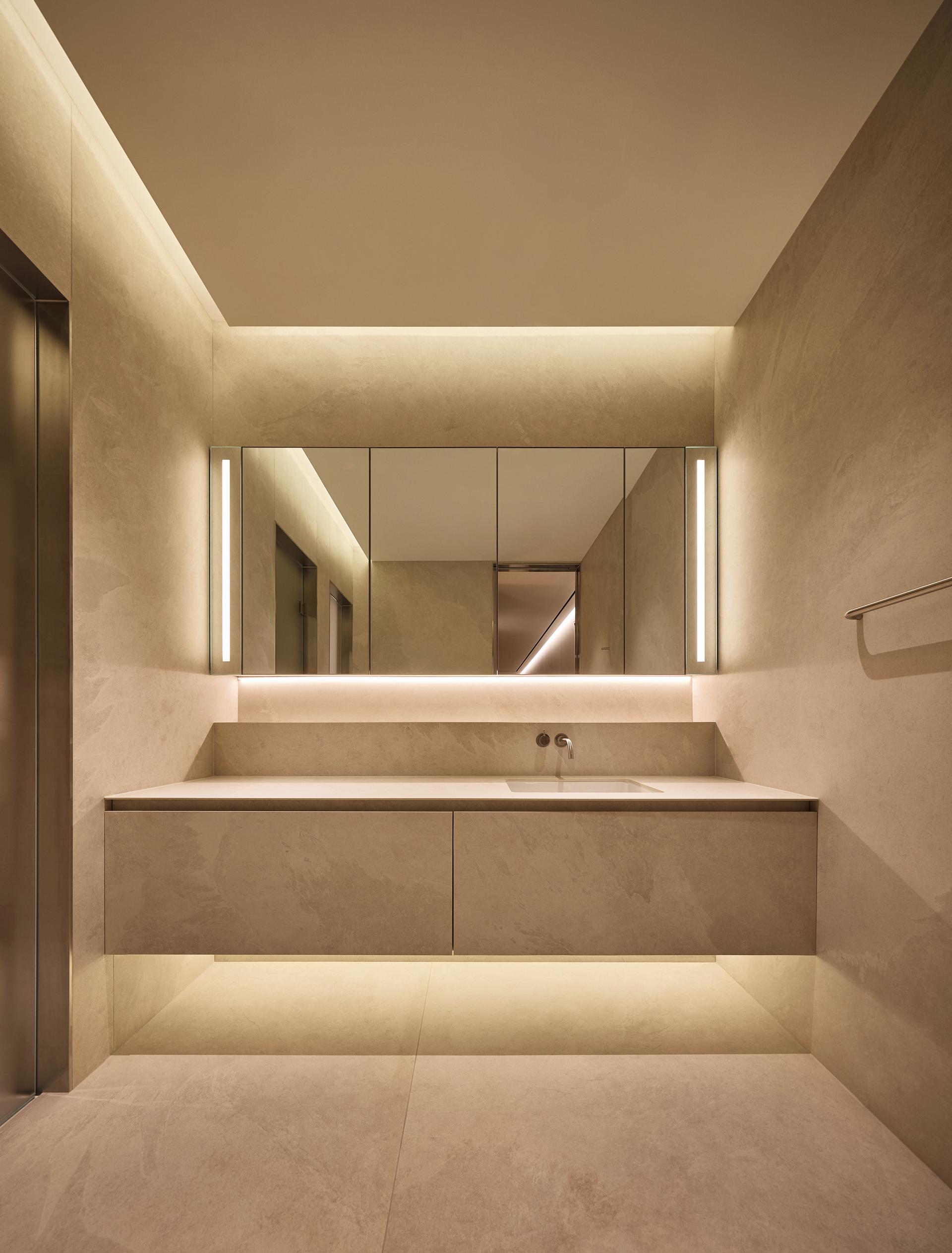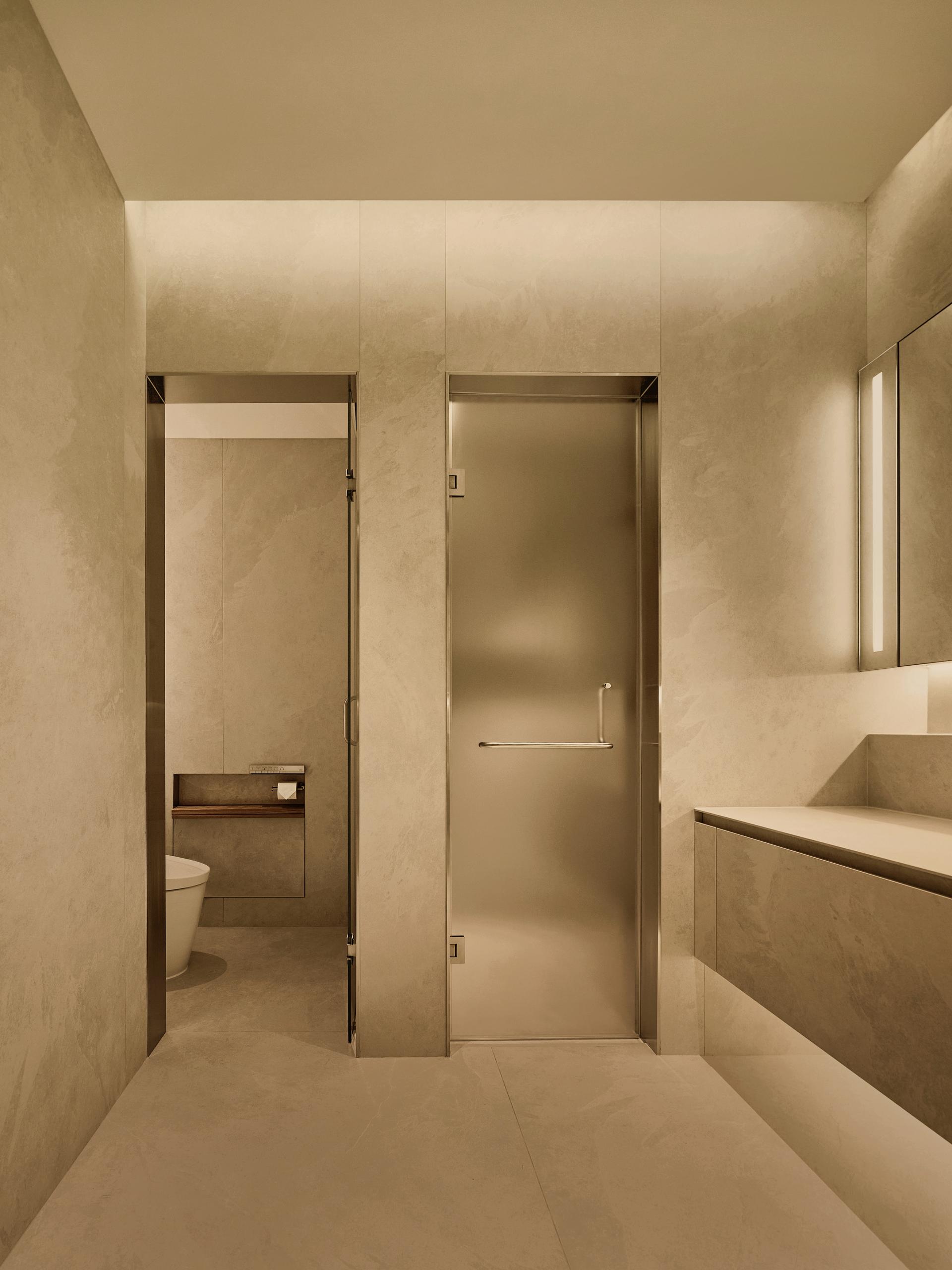 Italian ceramics from Caesar play a strategic role in this narrative: “We chose Caesar Ceramics to bridge the gap between Seoul’s modern skyline and Korea’s tranquil traditions. The stone-like textures offer a material honesty that integrates with our hanok-inspired layers to create a meditative retreat. These sophisticated surfaces embody a form of ‘quiet luxury’ where natural dignity and Italian craftsmanship coexist perfectly within this refined urban sanctuary.” The floors feature Slab2 Ice – a contemporary reinterpretation of slate – in a 120×120 cm format, ensuring visual continuity and a sense of perceptual stability. The same material, applied to the walls in large 120×278 cm panels, reinforces the cohesive reading of the space. In the kitchen, 12 mm thick Olos slabs are used for the worktops in the Comblanchien colour – inspired by a luminous white French stone – while in the bathroom, 6 mm slabs precisely follow the geometry of the various volumes. Italian ceramics thus become a quiet yet expressive material, capable of engaging in a meaningful dialogue with both wood and Korean tradition.