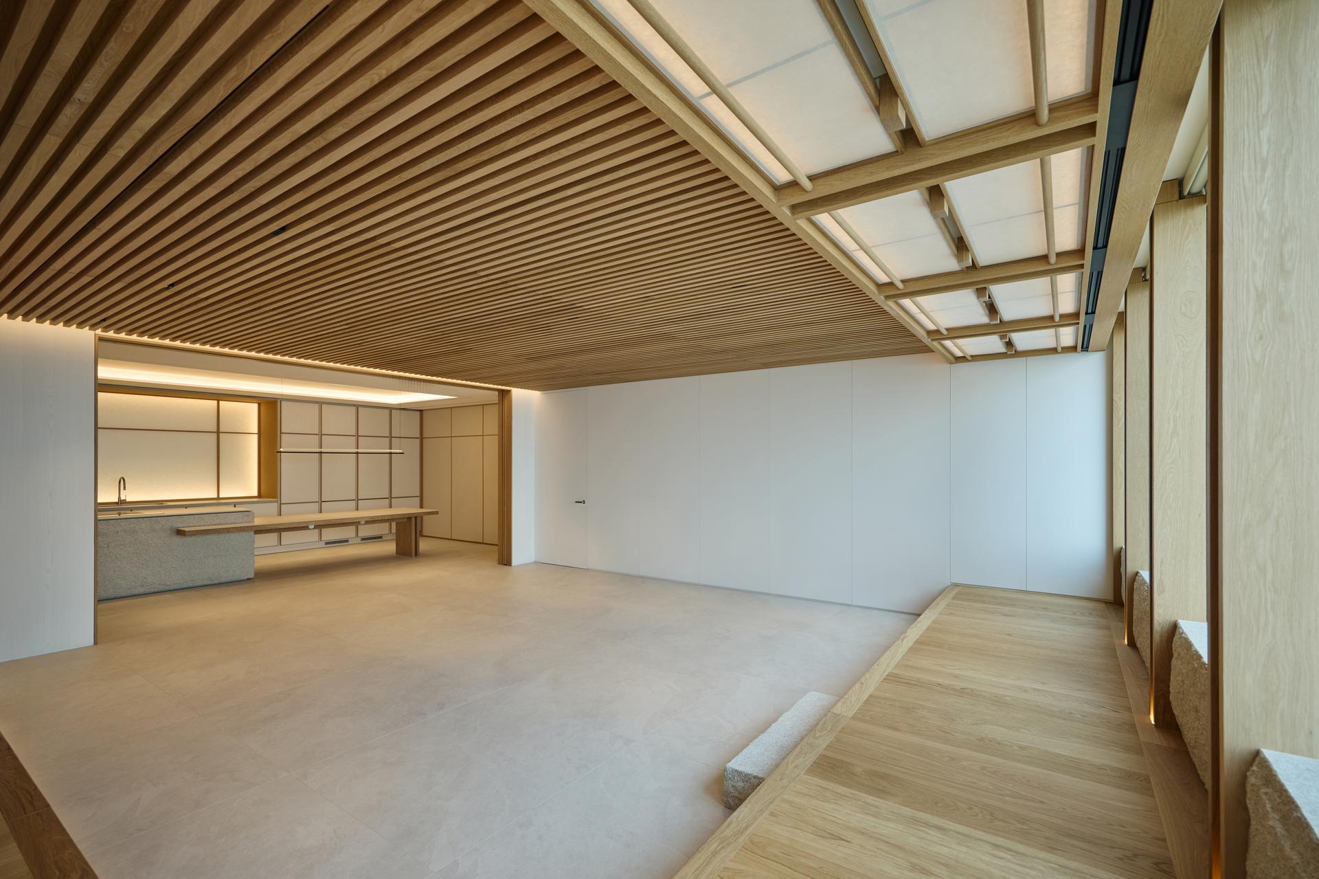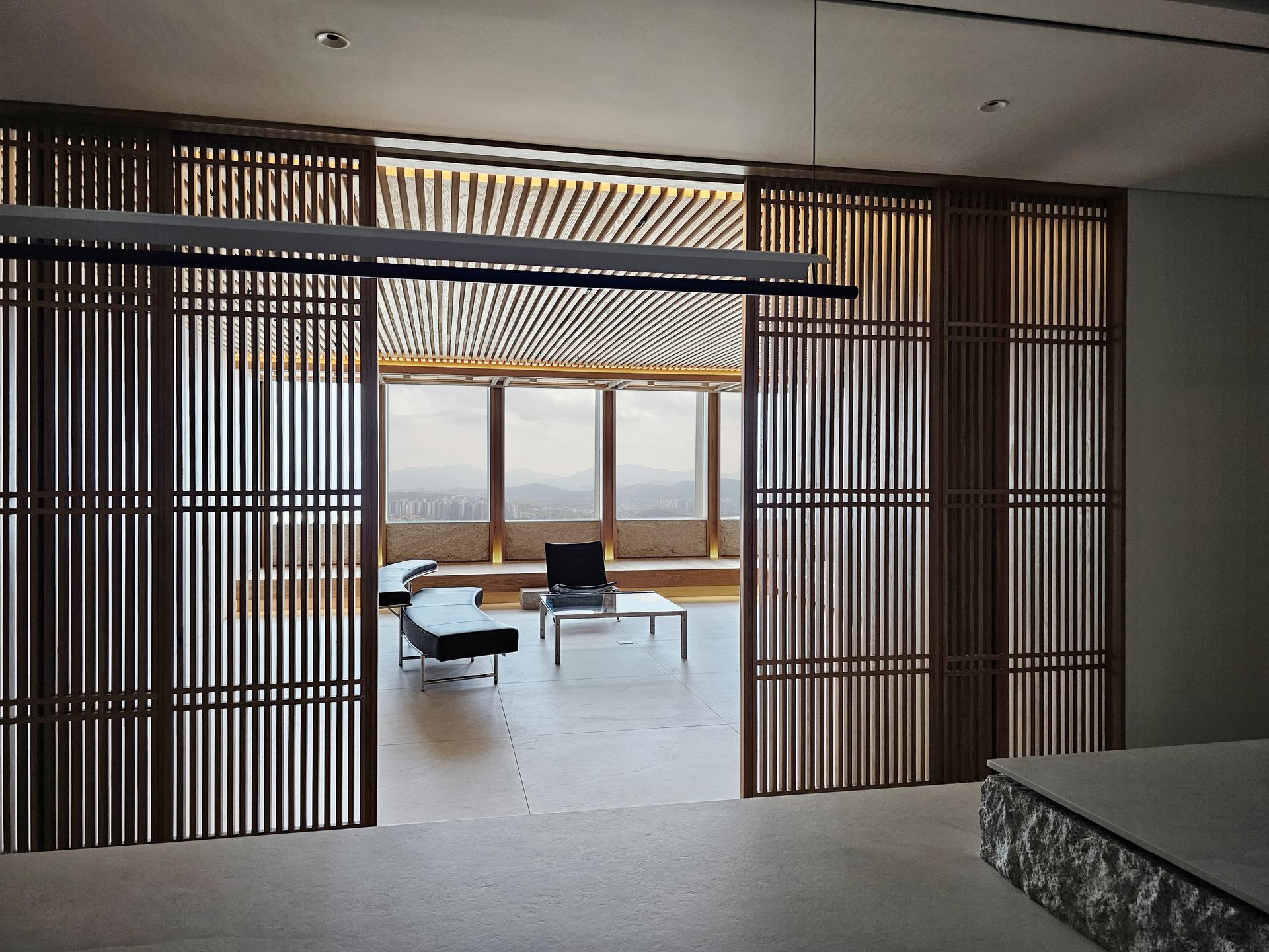 The spatial layout is directly inspired by the hanok, or traditional Korean house. Its sophisticated identity is defined by a blend of functional, symbolic and environmental elements, using flexible modular structures and natural local materials like rammed earth, stone, mulberry paper and wood. The hanok – a long-standing area of research for Listen Communication – is reinterpreted here in a vertical context. It serves as the compositional blueprint for fluid spatial sequences, weightless thresholds, visual continuity and a constant dialogue between the interior, the light and the urban panorama. Sliding partitions in wood and mulberry paper, ceilings that blend timber and paper and the calibrated use of indirect light evoke a meditative way of living that is simultaneously removed from, yet immersed in, the metropolitan frenzy.