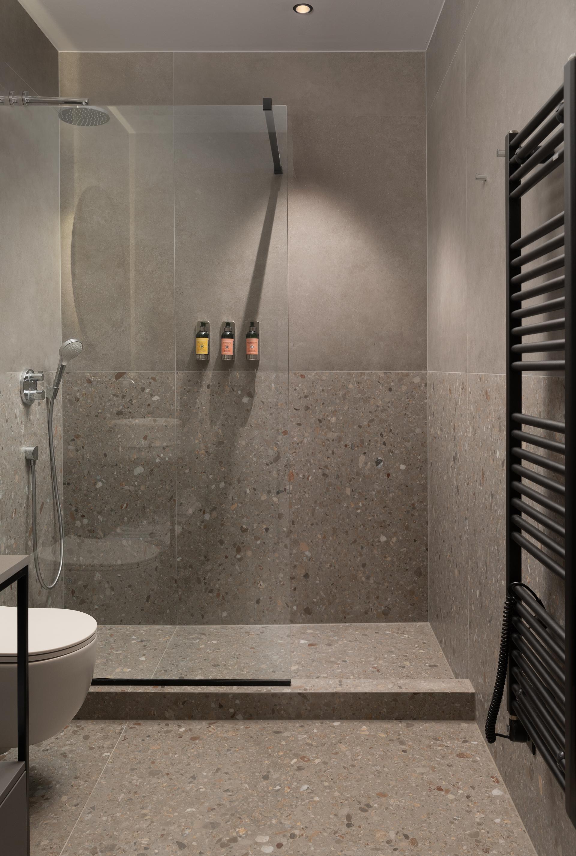Among the chosen materials, Dolmix Grey porcelain stoneware from Ceramiche Keope was selected for the floors of several suites, bringing understated elegance and a tactile quality reminiscent of natural stone. With its intricate textures, marked by inclusions and veins that recall the stratified geology of the Dolomites, Dolmix goes beyond mere imitation: it offers an artistic interpretation of stone, transforming the floor into a narrative element, a constant reminder of nature and the passing of time. The suites themselves, furnished with clean lines and natural materials, were designed for maximum relaxation and comfort, every detail contributing to guests’ sensory experience. The neutral tones of Dolmix harmonise with the furnishings, amplifying the light and space and subtly evoking the seascape framed by the large panoramic windows.