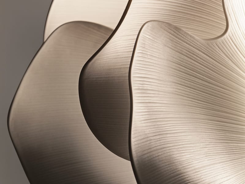 La série de lampes – suspendues, murales, de sol et de table – est composée d’un bouquet de pétales ornés de fines veines tridimensionnelles réalisées à la main. Les stries dorées diffusent une lumière douce aux reflets changeants. La vibration que transmet chaque élément provient de la lumière qui s’écoule à travers les reliefs des pétales, créant une nuance de couleur de l’intérieur vers l’extérieur.