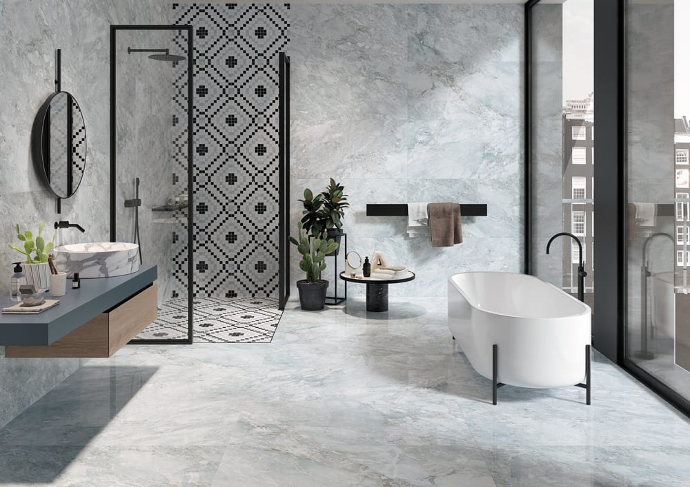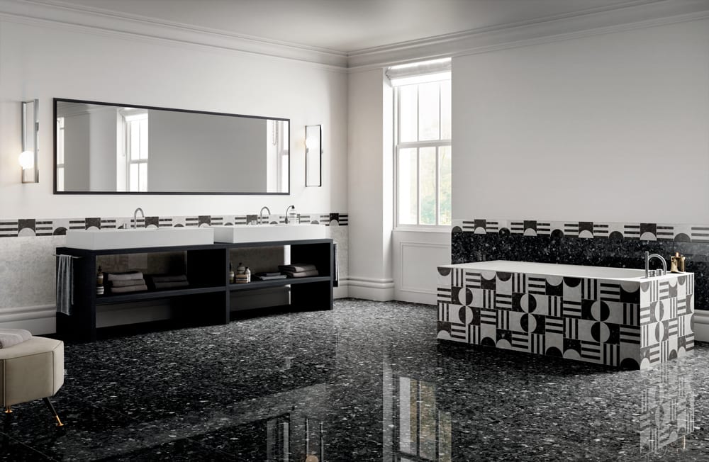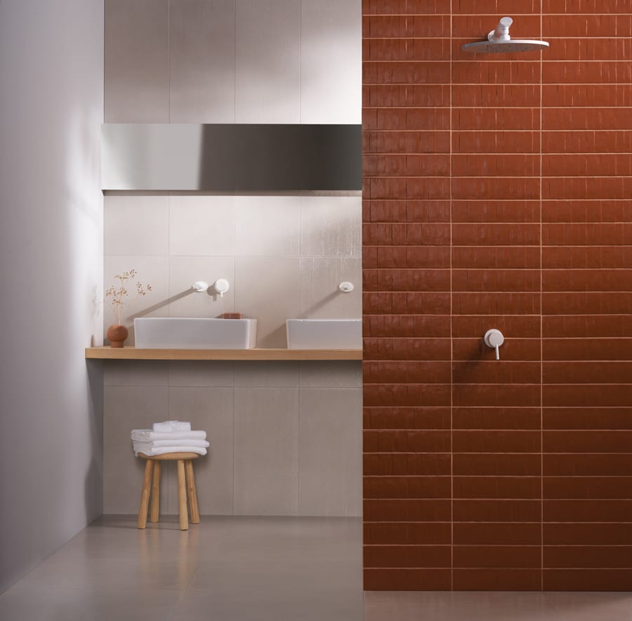 C’est ainsi que le grès inspiré du bois ou du marbre, les dalles qui retracent les surfaces continues ou des revêtements de sol célèbres comme le terrazzo à la vénitienne continuent de faire partie des propositions – souvent enrichies de nouvelles finitions antidérapantes ou d’épaisseurs réduites – mais les mises en situation suggèrent des applications offrant de nouvelles fonctions. Dans la salle de bains, la zone douche est recouverte de carreaux d’une certaine couleur et celle des lavabos d’une autre, en contraste. Dans l’espace ouvert de la zone jour, la zone cuisine se distingue du salon par la couleur, le format et la finition des carreaux muraux ou, pour donner un autre exemple, le dos de la bibliothèque, dans la zone dédiée, peut présenter une couleur différente des autres murs.