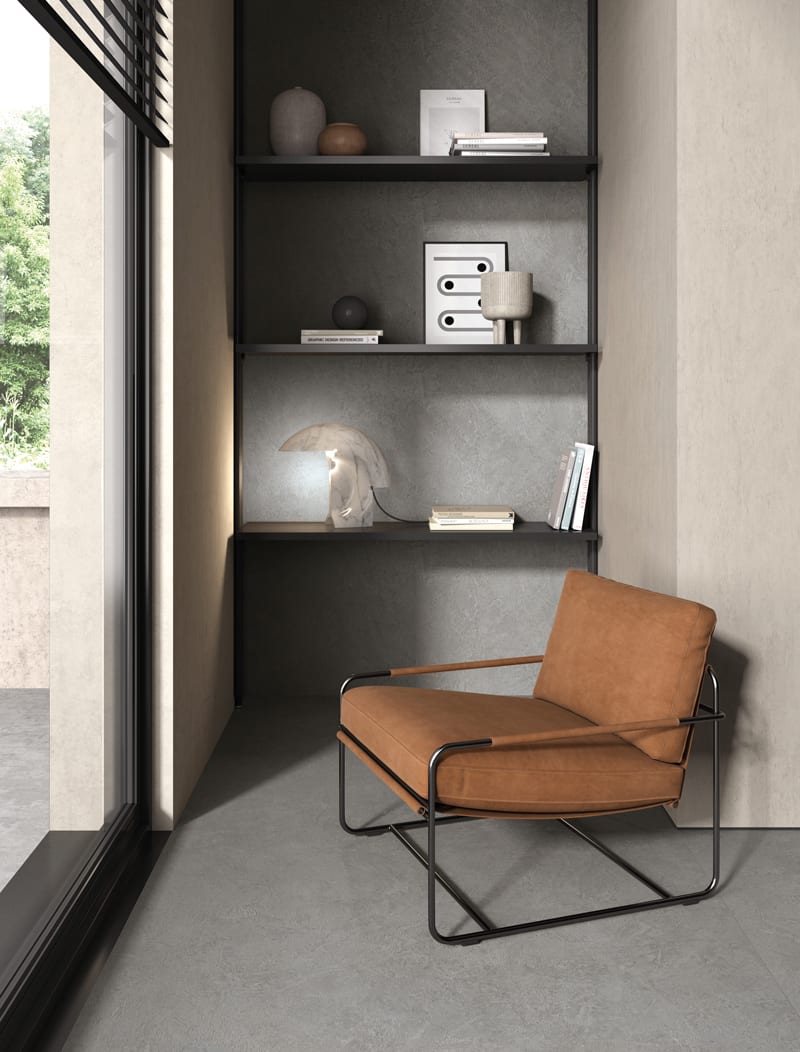 09. Blend d’ABK, ici dans la couleur Concrete Iron, est un grès cérame imitation béton, enrichi par la reproduction graphique de micro cailloux. Réinterprétation du seminato ou terrazzo vénitien, Blend propose trois finitions : naturelle, polie et P-tech, la solution ingénieuse qui améliore les performances antidérapantes des sols.