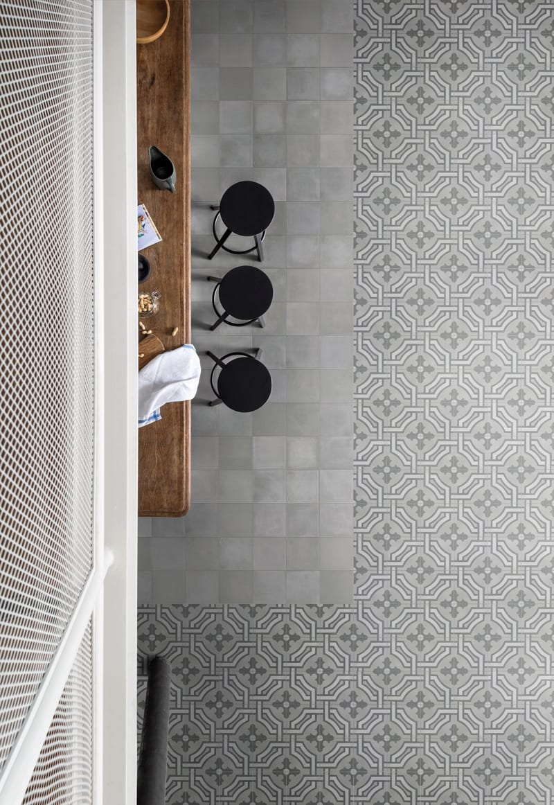 01. La technologie StepWise de Marazzi assure une grande résistance à la glissance tout en conservant une surface douce. La photo montre l’exemple de la ligne Crogiolo D_Segni Blend, une série qui réinterprète en grès les carreaux de sol de 20×20 cm faits main. Elle les propose en sept couleurs et dix-huit motifs pour créer des revêtements au graphisme puissant.