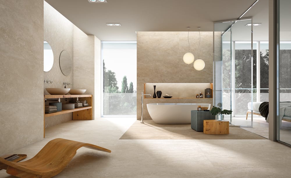 18. Basée sur la technologie numérique, la série Thermae de NovaBell s’inspire du travertin évoqué dans le grès cérame : les veines, les bas-reliefs et les couleurs sont transférés sur les murs et les sols. La série est disponible en deux formats : 30×60 et 60×120 cm.