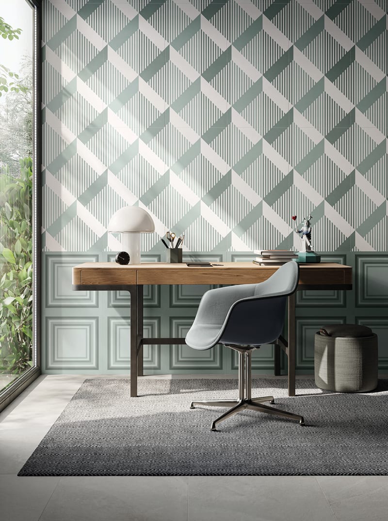 02. Les murs semblent recouverts de papier peint mais le revêtement est en grès. La série Glam de Panaria Ceramica propose des dalles de 3,5 mm d’épaisseur avec quatorze thèmes décoratifs conçus pour donner une forte personnalité aux intérieurs.