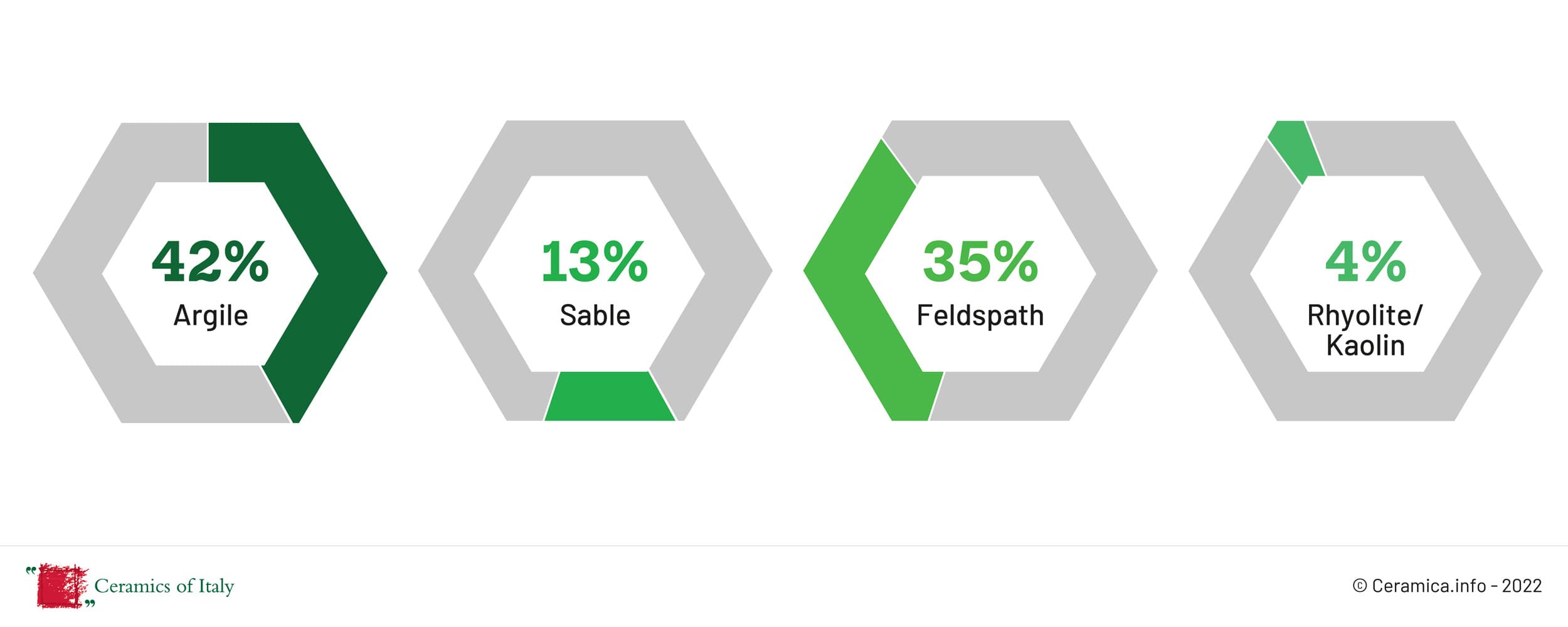 La céramique italienne est créée à partir de matières premières naturelles qui sont pressées à sec ou traitées par des procédés d’extrusion et, dans le cas des céramiques sanitaires, par coulage. Un produit céramique moyen, représentatif de l’ensemble de la production italienne, est principalement constitué de terre fine et contient de l’argile, du feldspath, des sables, du kaolin et d’autres matériaux naturels.